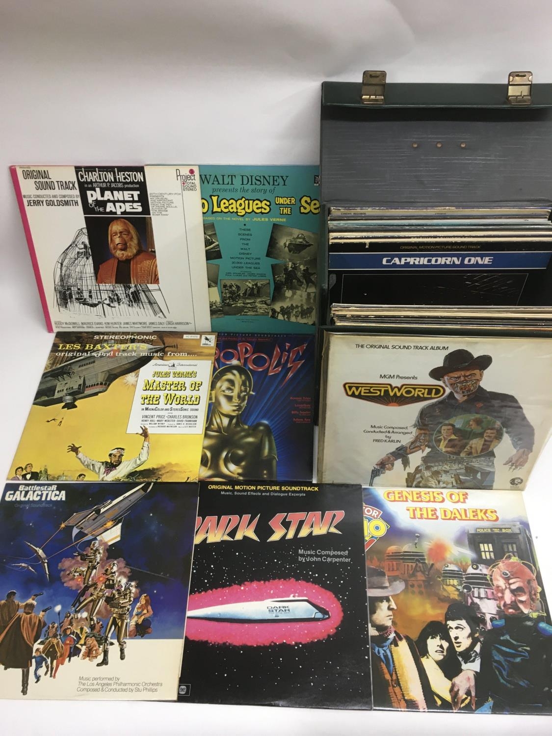A collection of film soundtrack LPs including 'Planet Of The Apes', 'The Italian Job', 'Westworld', 'Jubilee' and others.