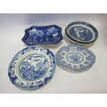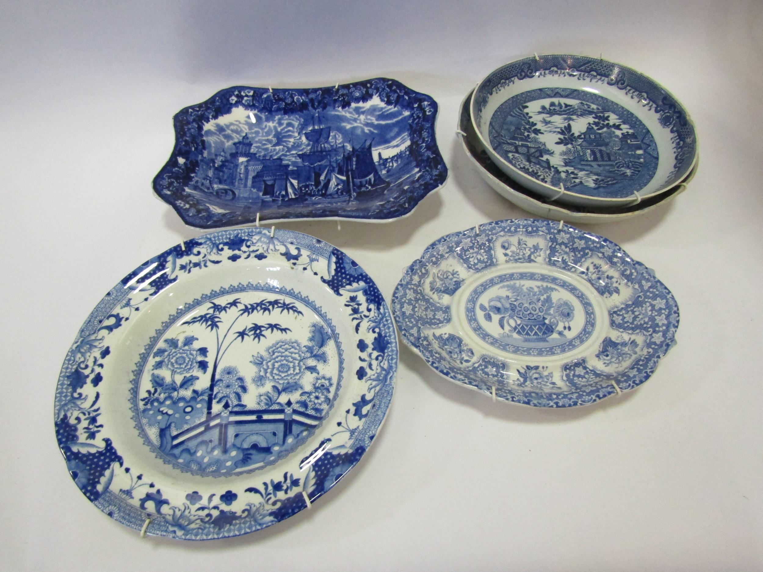 A collection of blue and white plates with wall hangers including Spode floral, two Chinese bowls and ships (5)