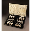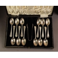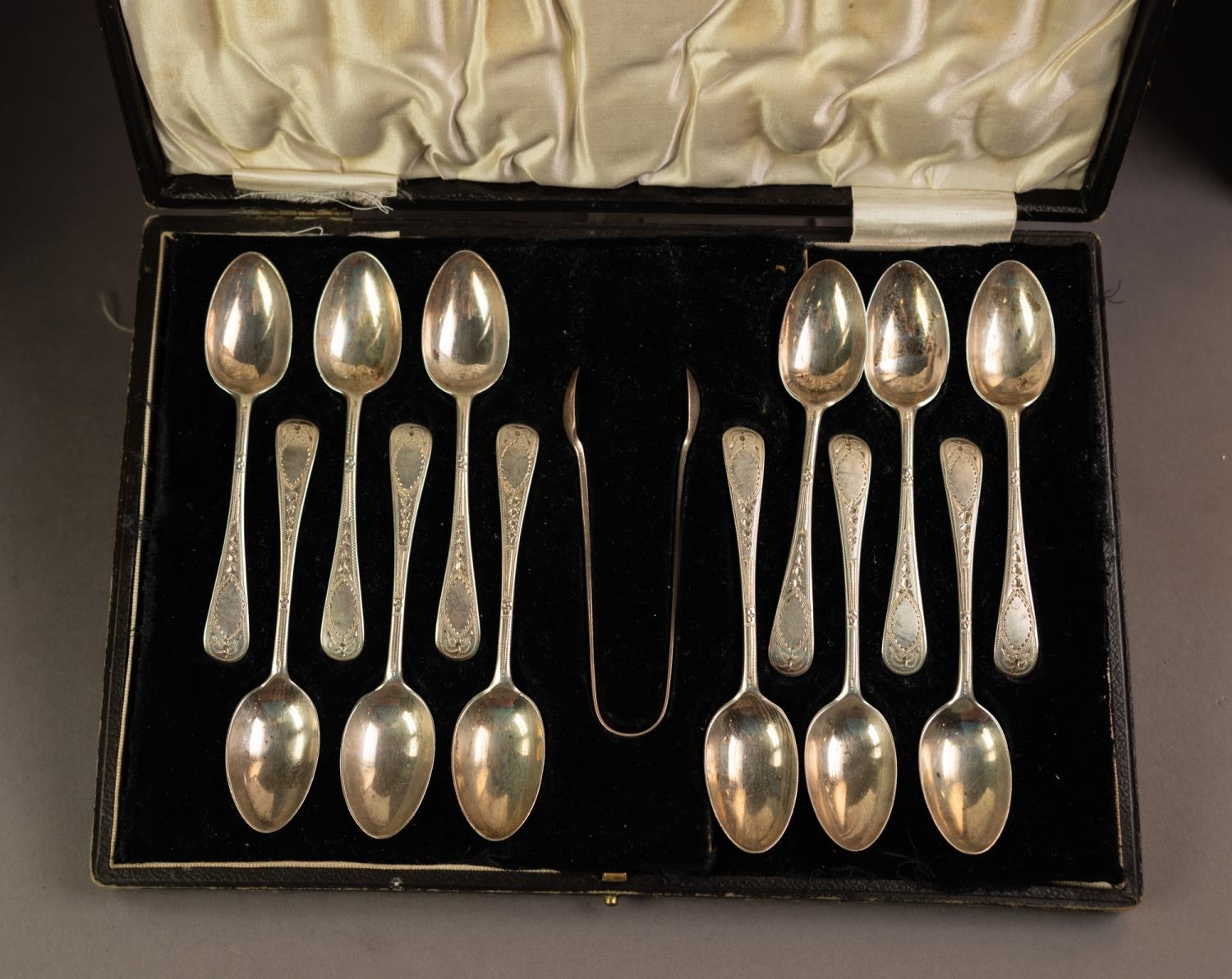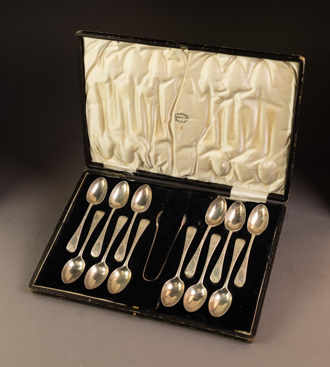 GEORGE V CASED SET OF TWELVE SILVER TEASPOONS AND MATCHING PAIR OF SUGAR TONGS, with bright cut handles, case a/f, London 1930, 7oz