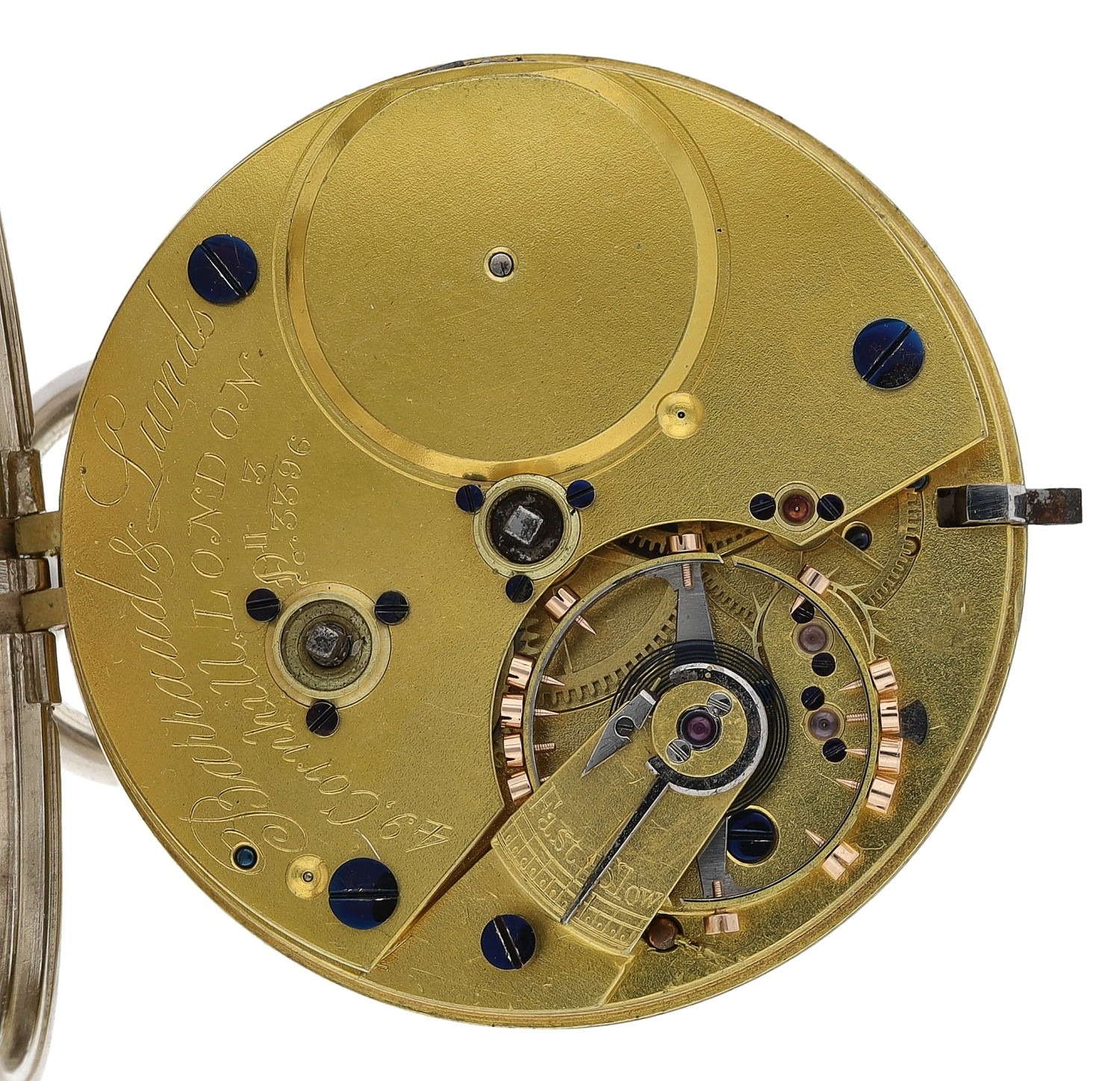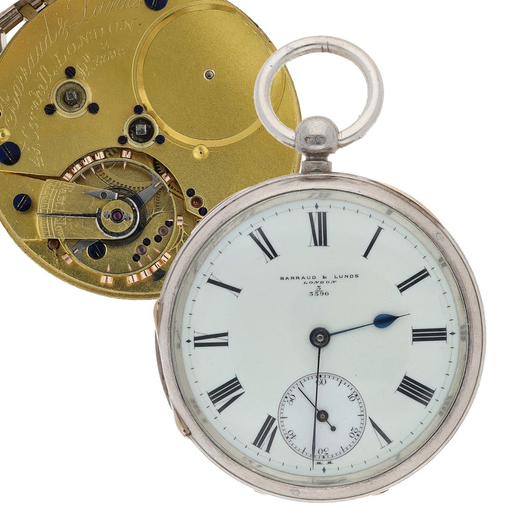 Barraud & Lunds, London - silver fusee lever pocket watch, London 1914, the free sprung gilt three quarter plate movement signed Barraud & Lunds, 49 Cornhill, London, no. 3/3396, with plain balance cock, blued steel hairspring, compensated balance and regulator, signed and numbered enamel dial with Roman numerals, minute track and subsidiary seconds, blued steel hands, within a plain case with applied gold hinges, case maker 'F.T London' (Fred Thoms), 50mm, key