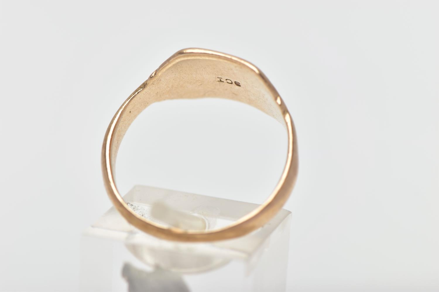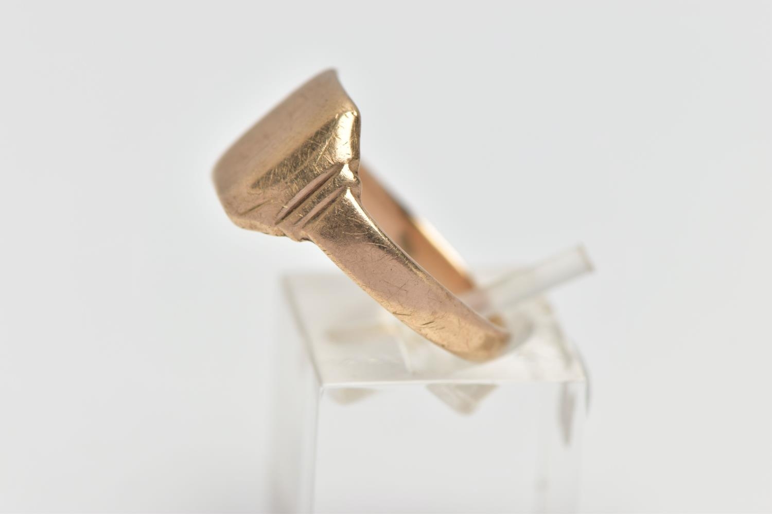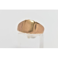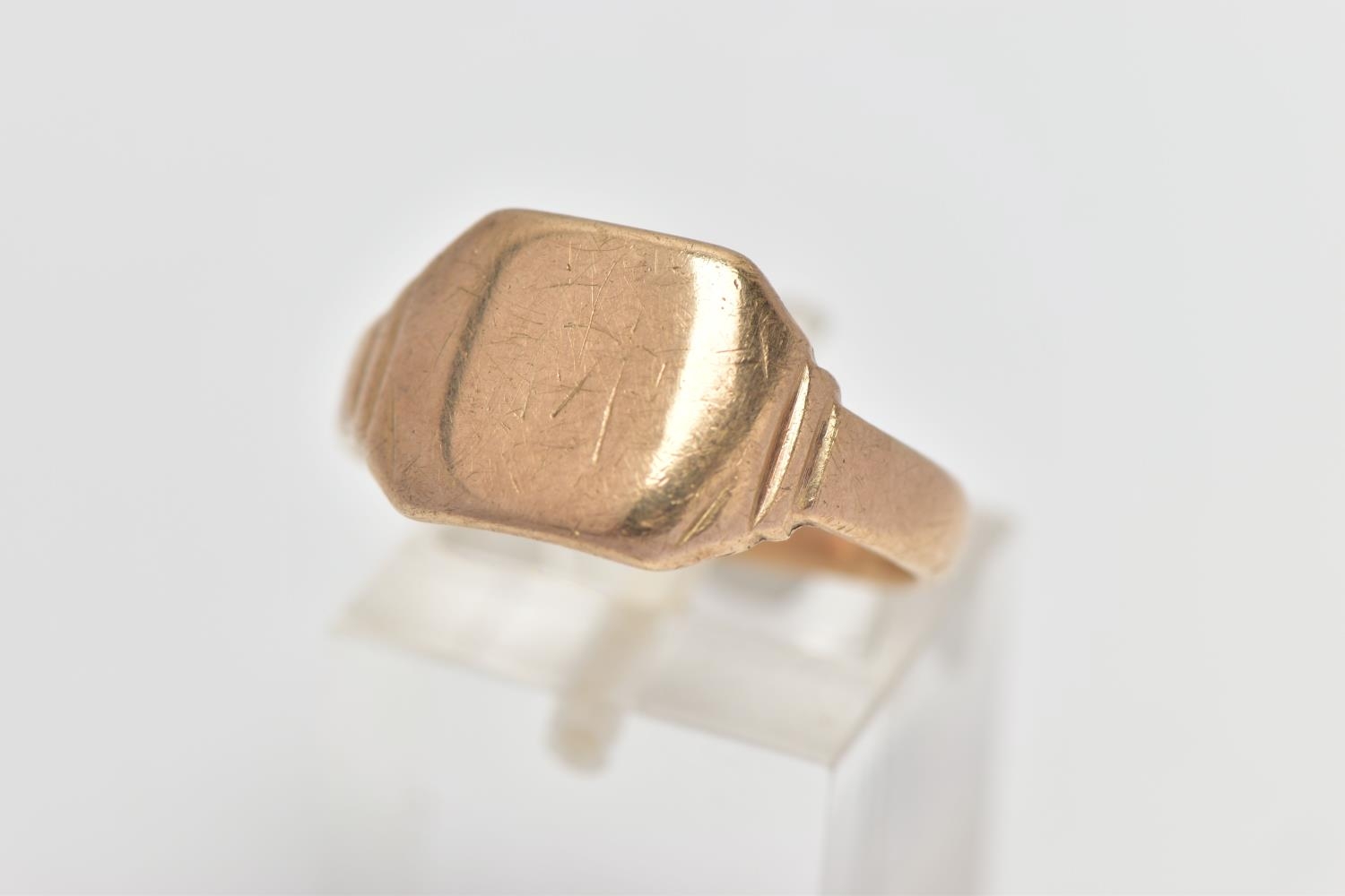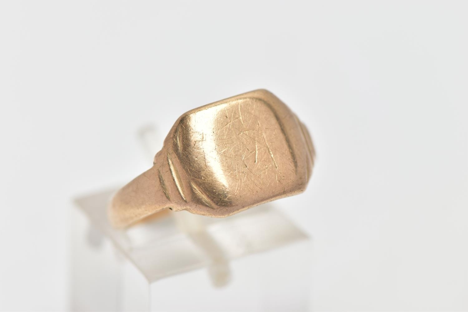 A YELLOW METAL SIGNET RING, of a square form, worn engraved initials, polished band, stamped 9ct, ring size R slightly bent shank, approximate gross weight 4.0 grams (condition report: worn engraving, misshapen shank)