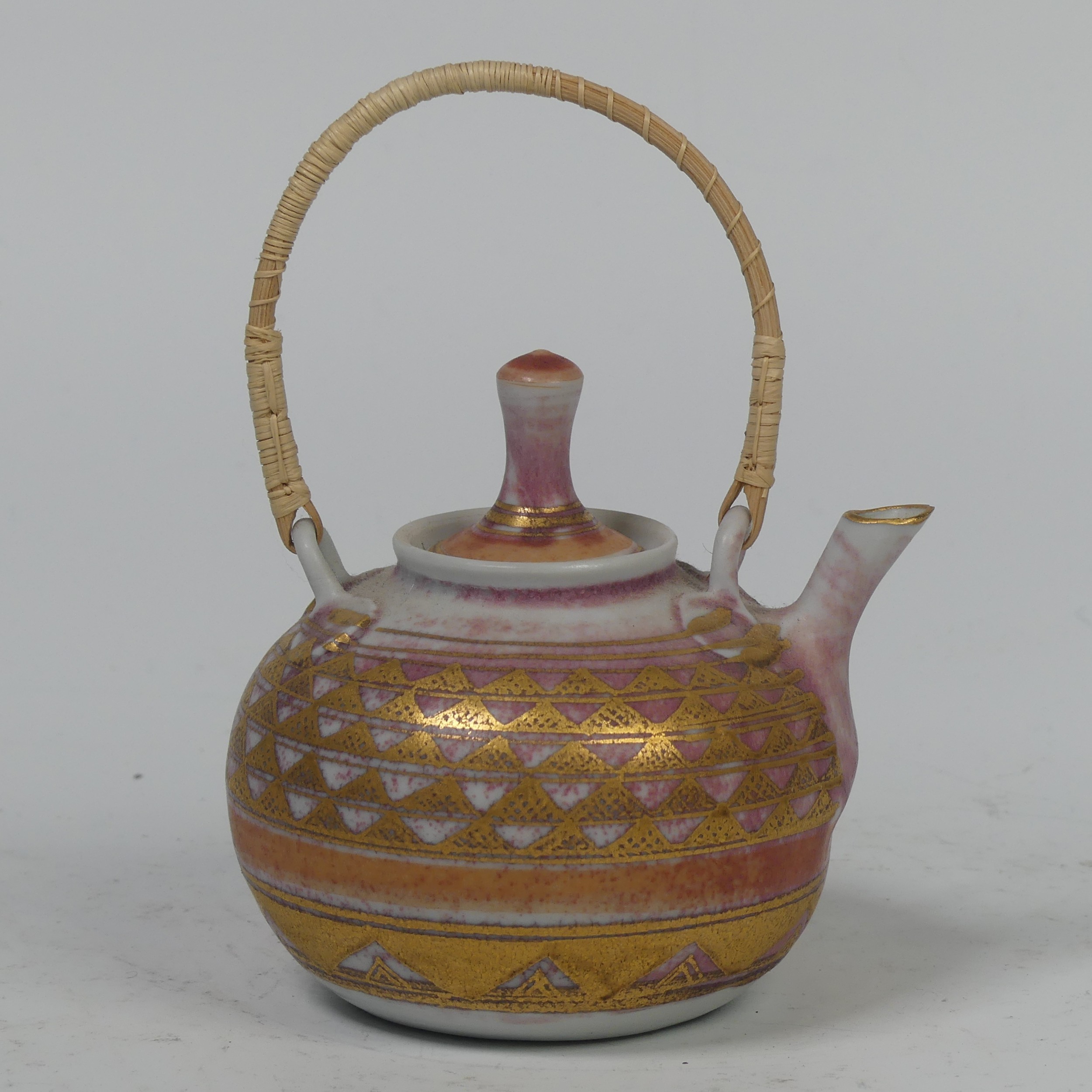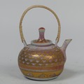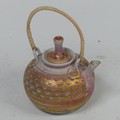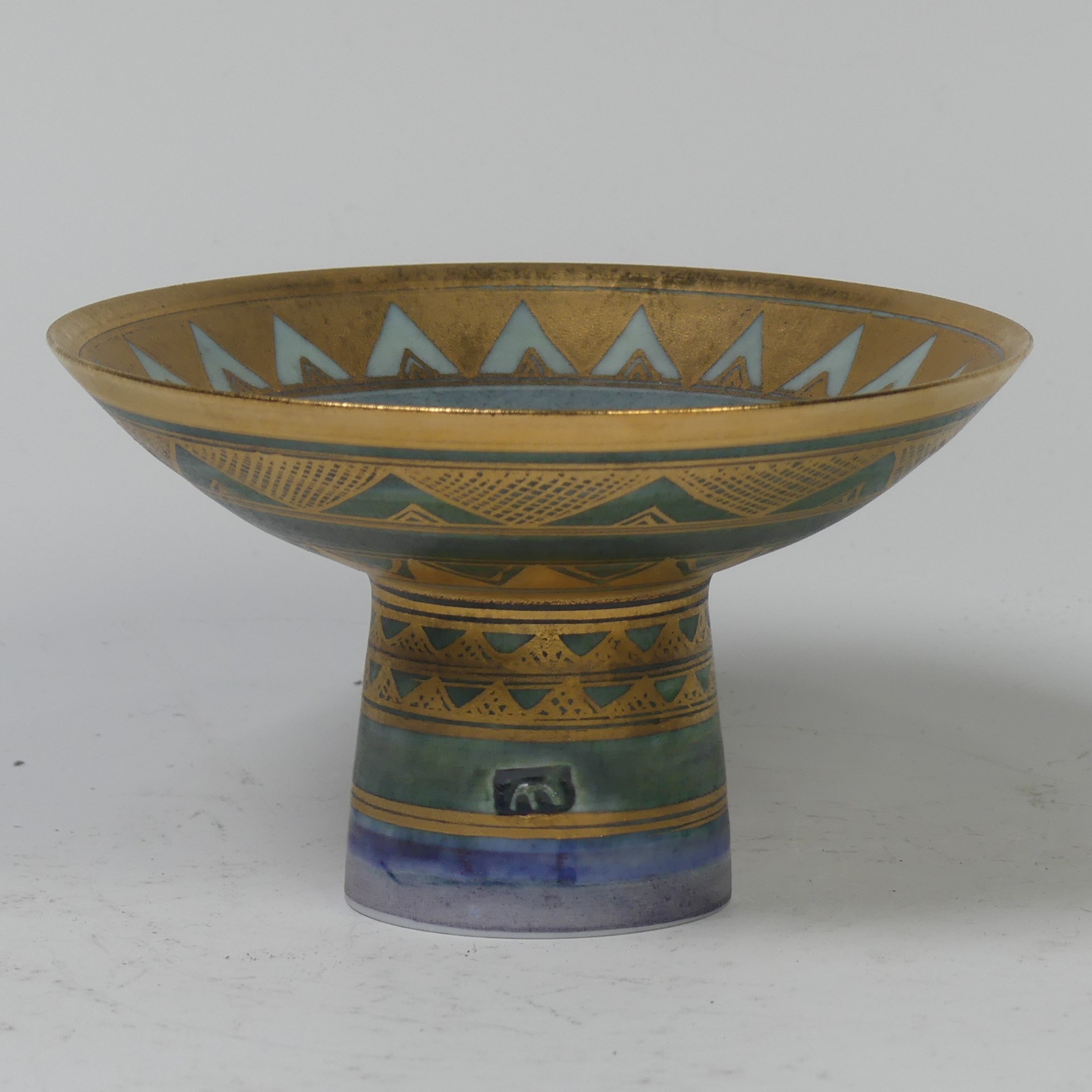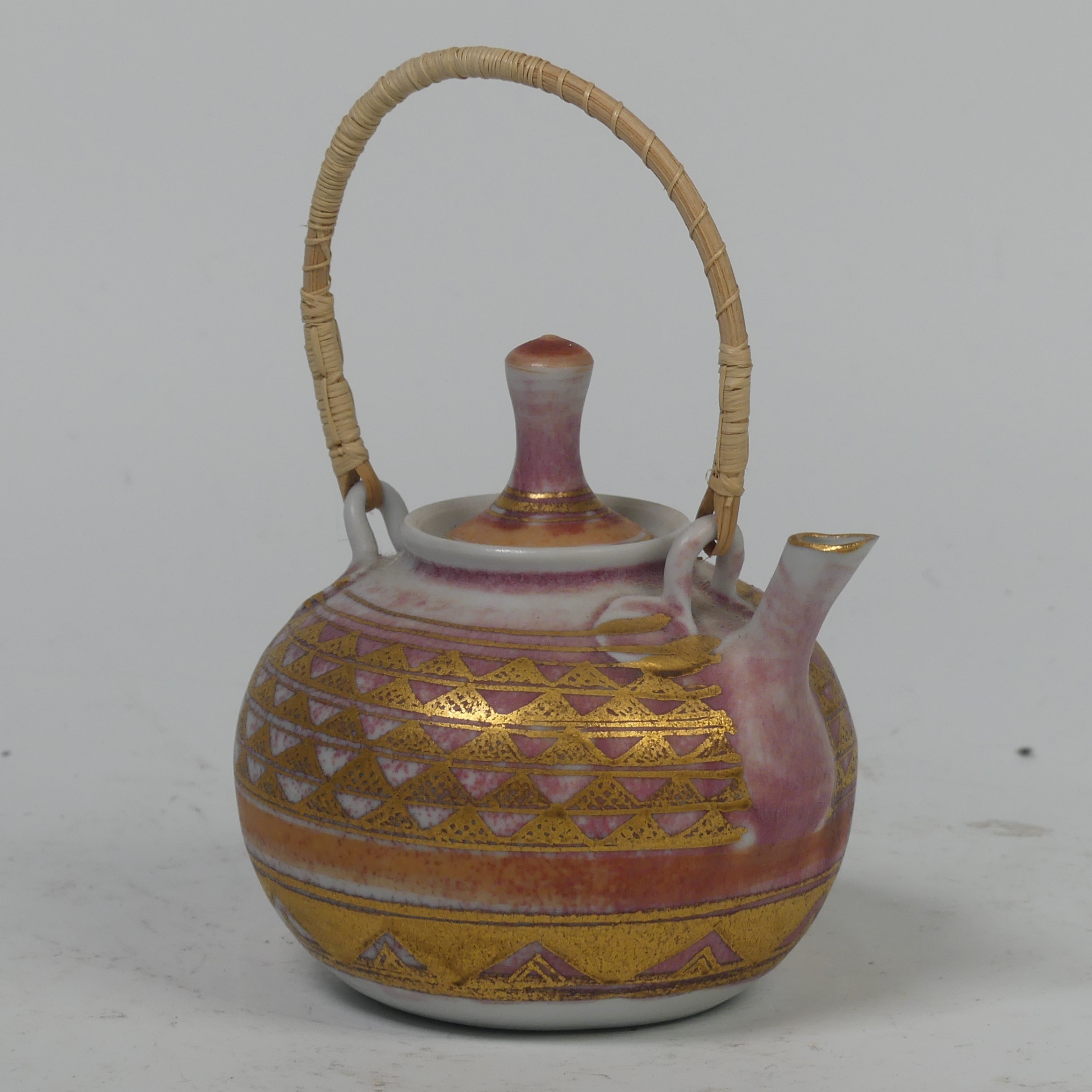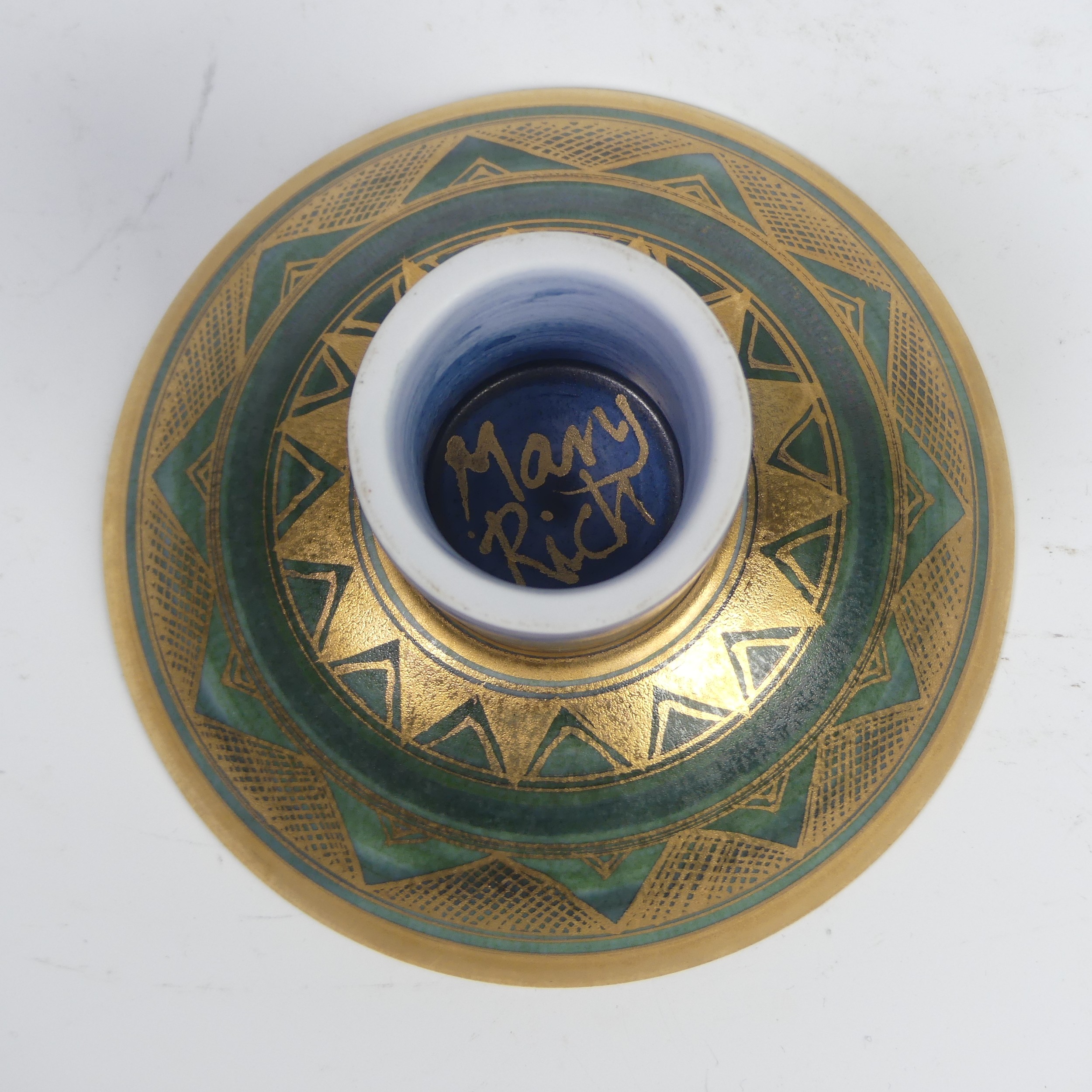 Mary Rich (British, 1940-2022), studio pottery Footed Dish, decorated in blue and gold, signed and impressed mark to base, 7cm high x 12.5cm diameter, together with studio pottery miniature teapot, decorated in pink and gold, impressed mark to base, 13cm high (handle up) (2)