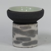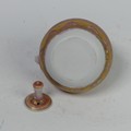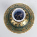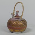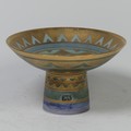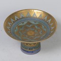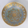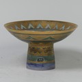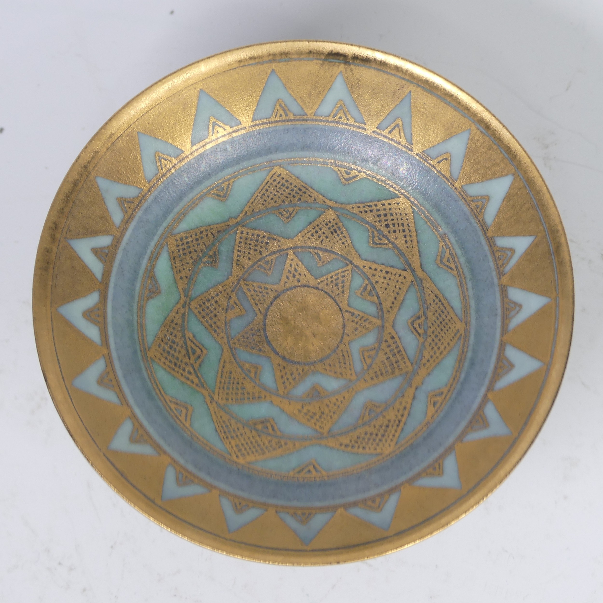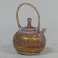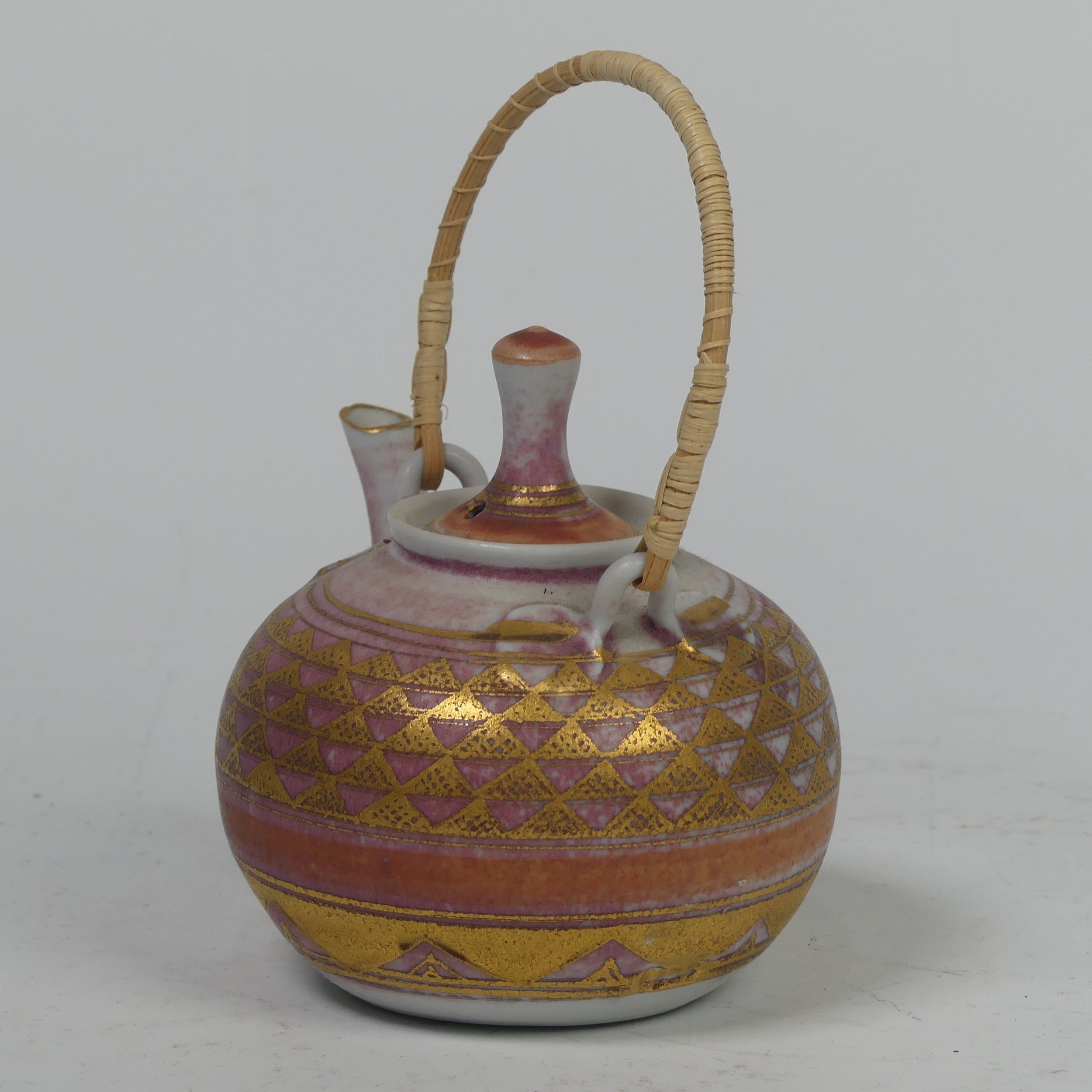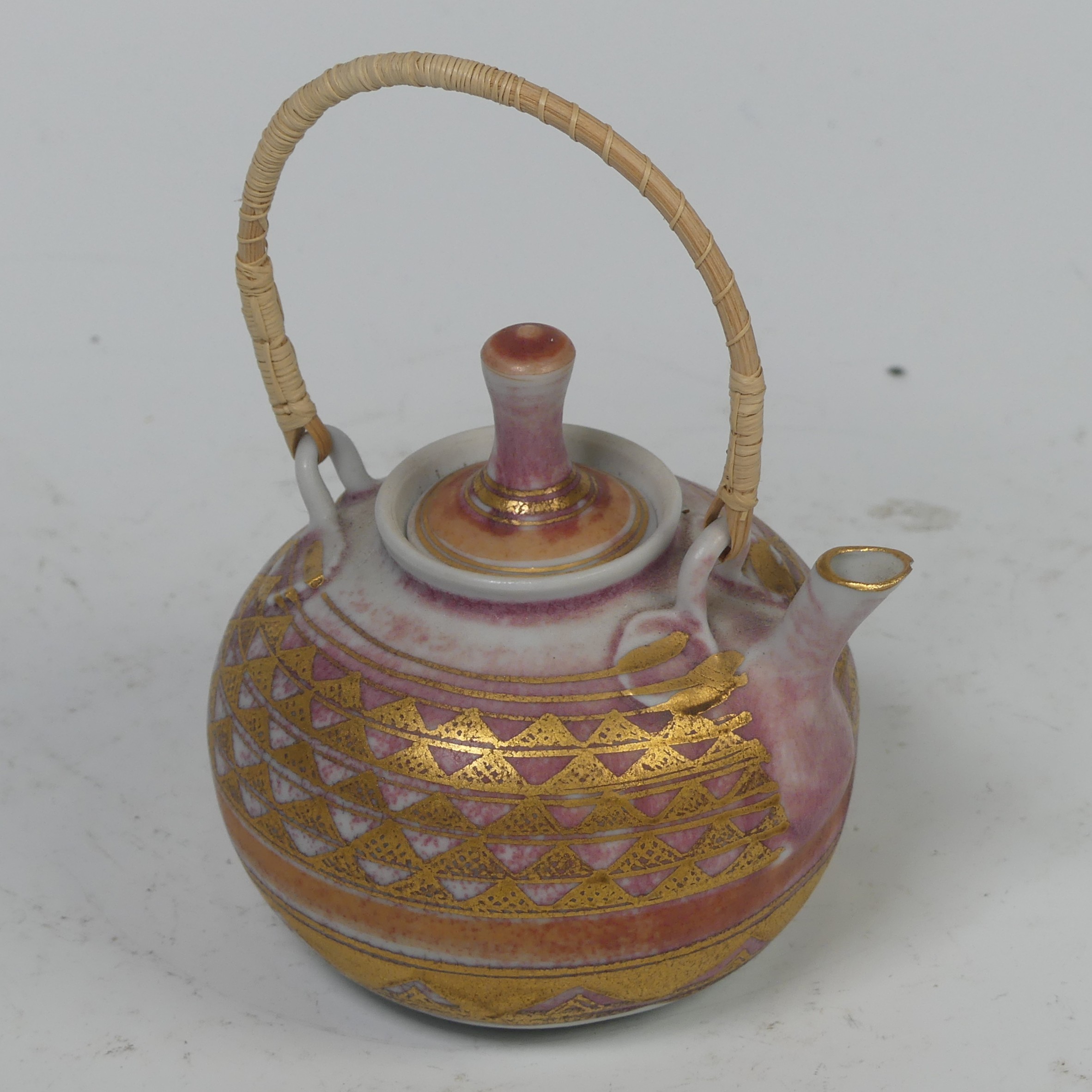 Mary Rich (British, 1940-2022), studio pottery Footed Dish, decorated in blue and gold, signed and impressed mark to base, 7cm high x 12.5cm diameter, together with studio pottery miniature teapot, decorated in pink and gold, impressed mark to base, 13cm high (handle up) (2)