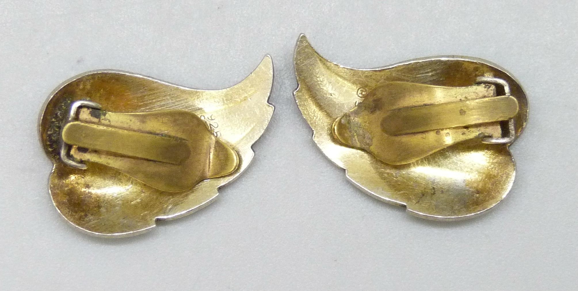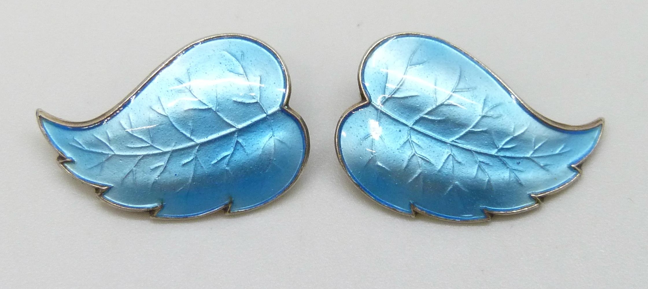 Ivar T Holth, A pair of silver gilt clip on Norwegian earrings in the form of leaves with blue enamel, 2.1cm