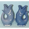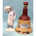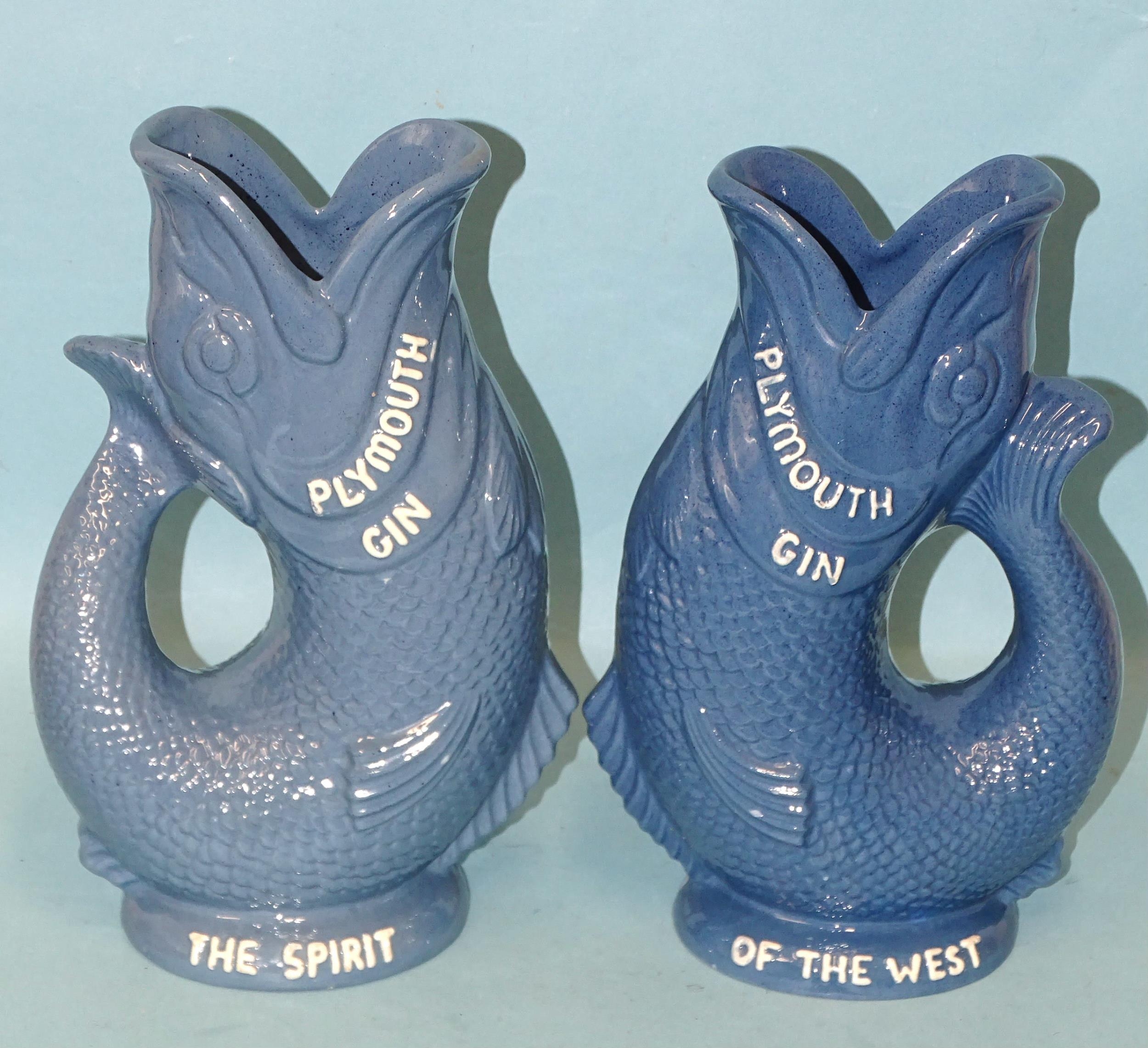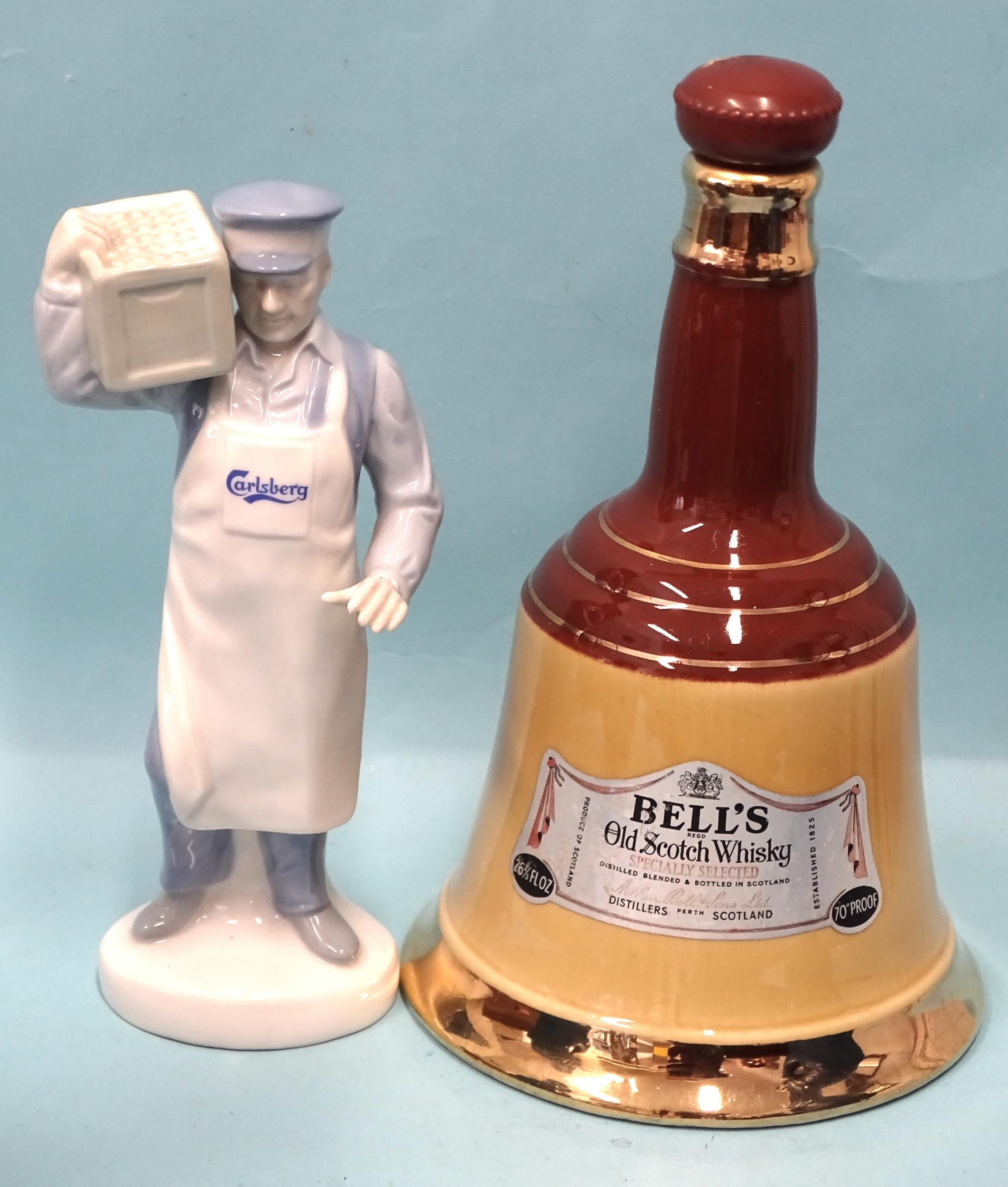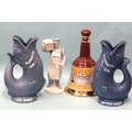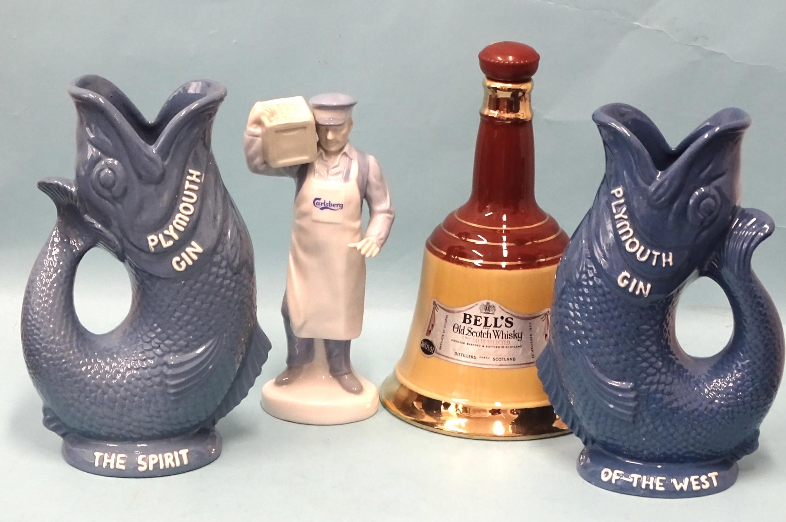 Two Dartmouth Pottery "Plymouth Gin, The Spirit" gurgle jugs, a Bygdo Carlsberg figurine and a Wade Bells Whisky decanter, (empty).