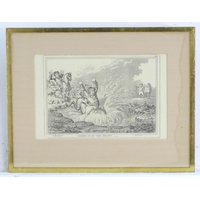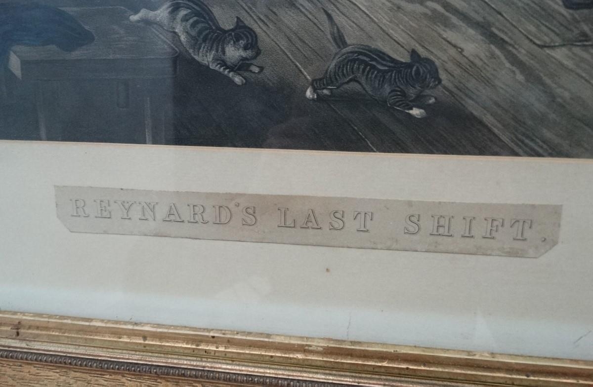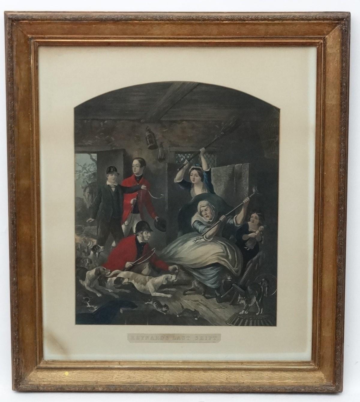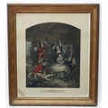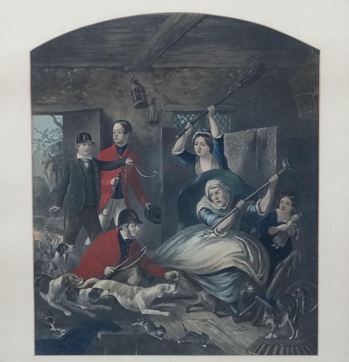 After John Collet (c.1725-1780) Hand coloured mezzotint in arch shaped mount, Reynards Last Shift, An interior scene after the hunt. Approx. 21 1/2" x 17 3/4''