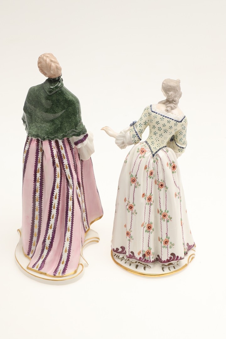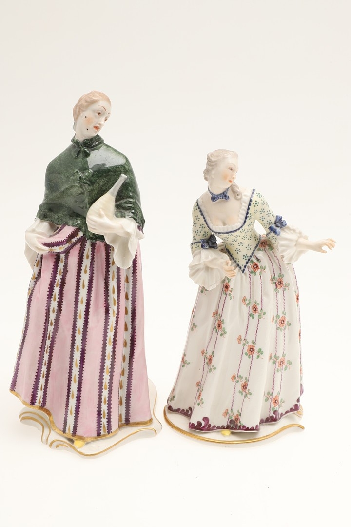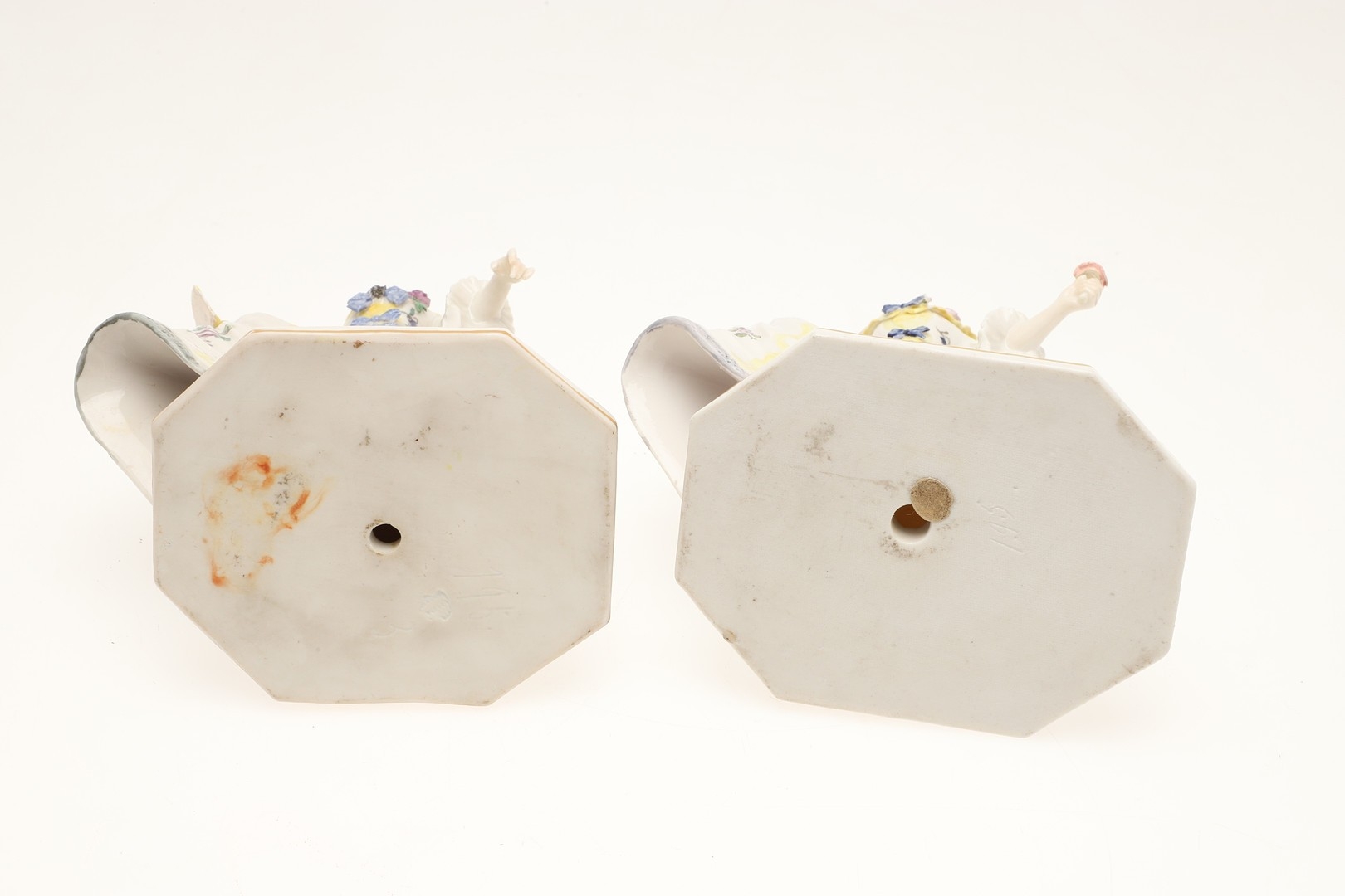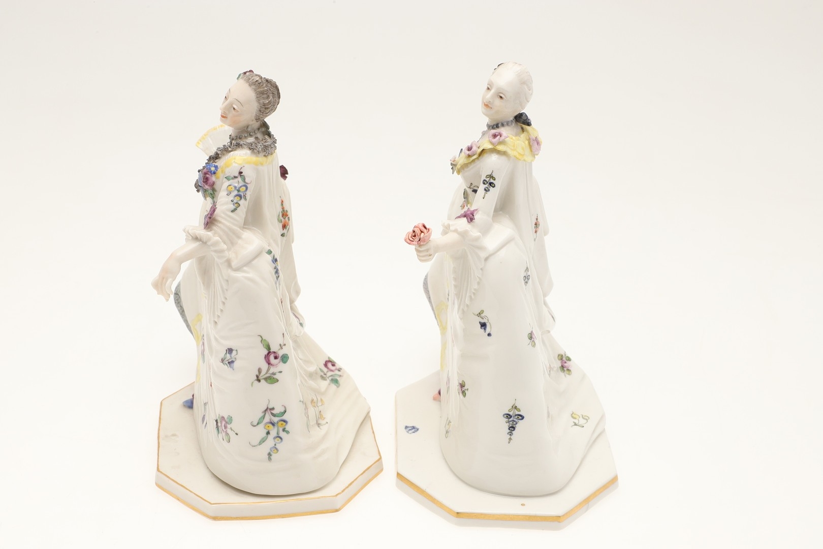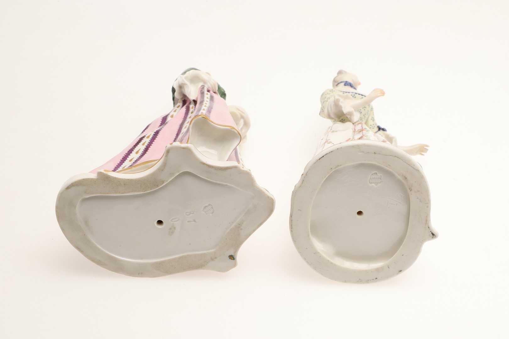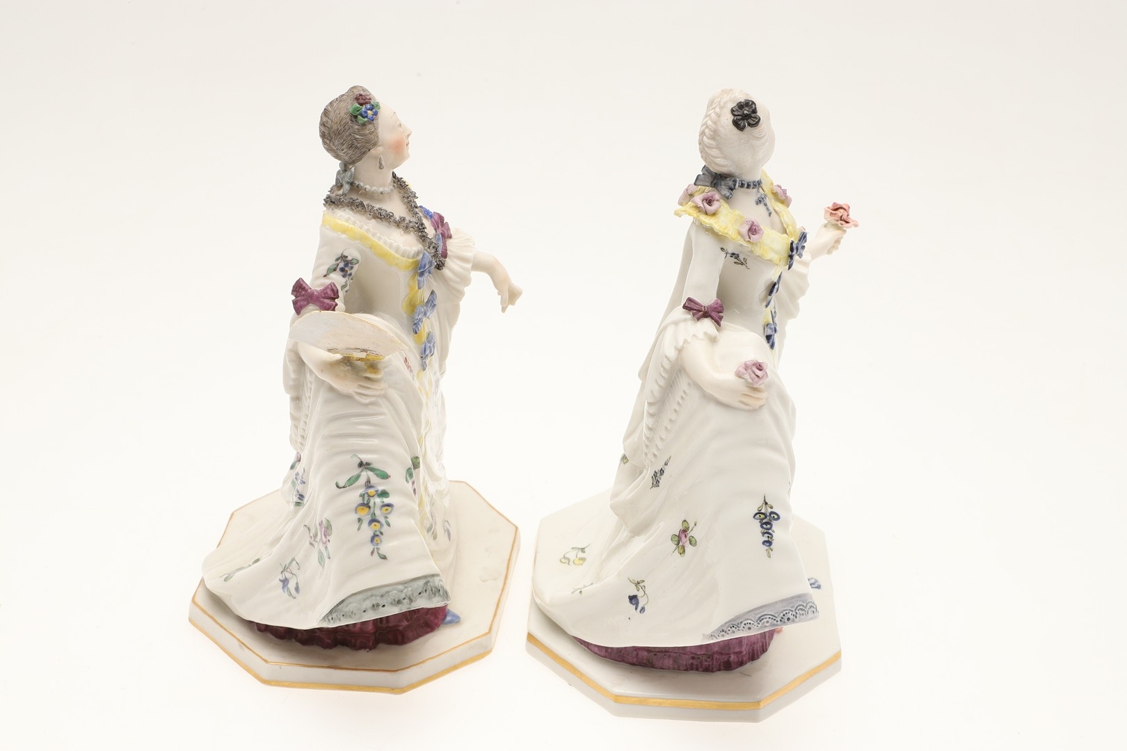 figure with fan, mirror has been broken and repaired, similar figure with nibbles to the flowers