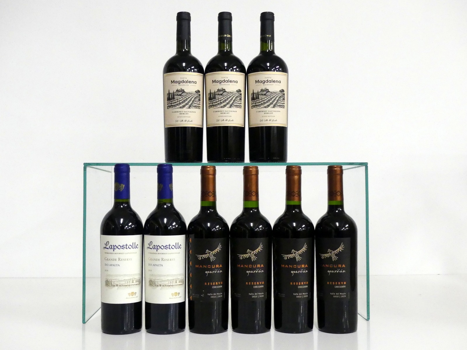 3 bts Balduzzi Santa Magdalena Cabernet Sauvignon Merlot 2019 Maule Valley 2 bts Lapostolle Grande Reserve 2019 Apalta 4 bts Mancura Guardian Carignan Reserva 2020 Maule Valley vsl ntl Above 9 bottles
