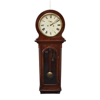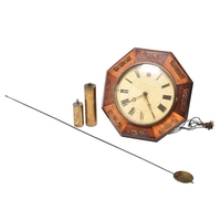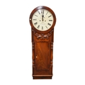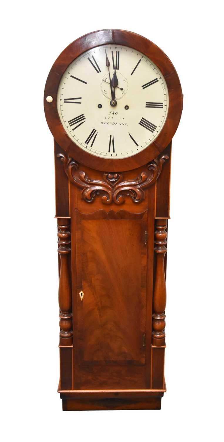A 19th century inlaid mahogany tavern clock The dial signed J.E.Evans, Welshpool The 14 inch painted dial numbered 280 and having a Roman chapter and subsidiary seconds dial, above a trunk door, flanked on each side by turned baluster columns, over an ogee shaped base, the 8-day movement with 4 pillars and anchor escapement, striking on a bell. With pendulum and two weights. 142cm long