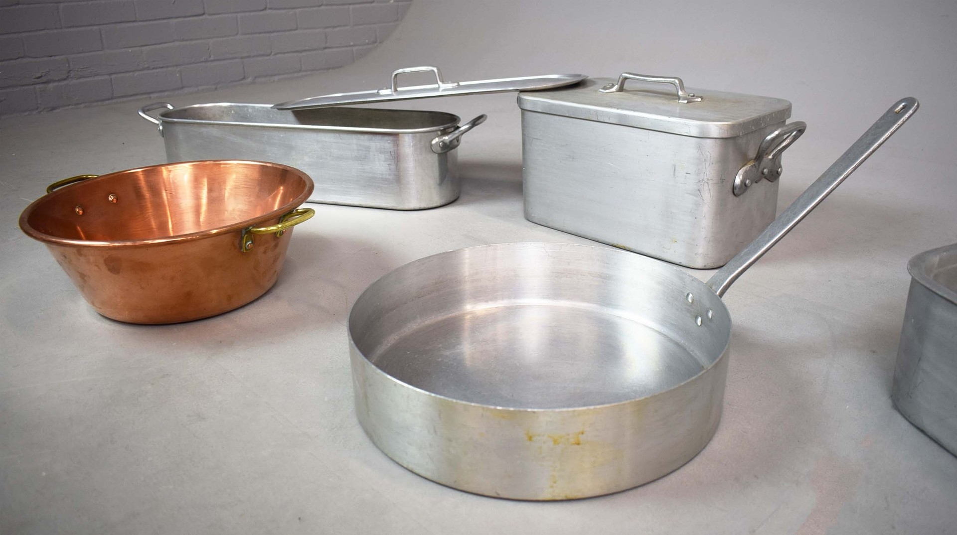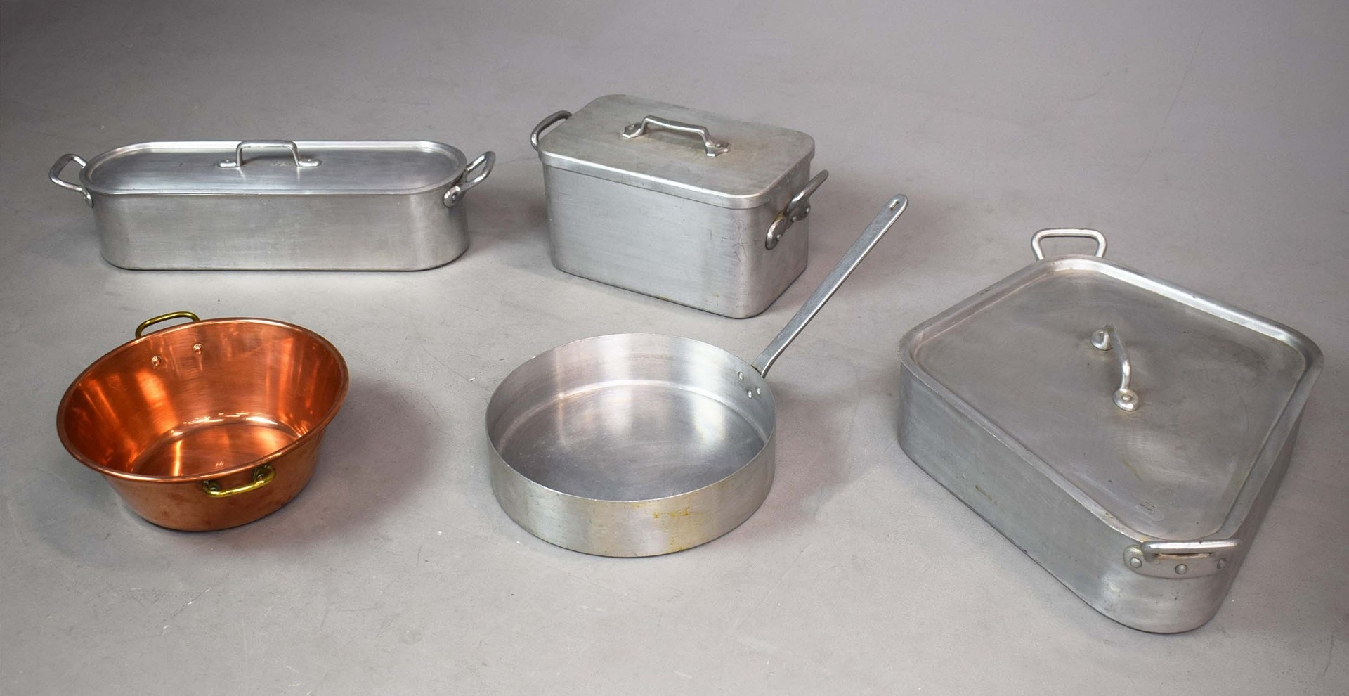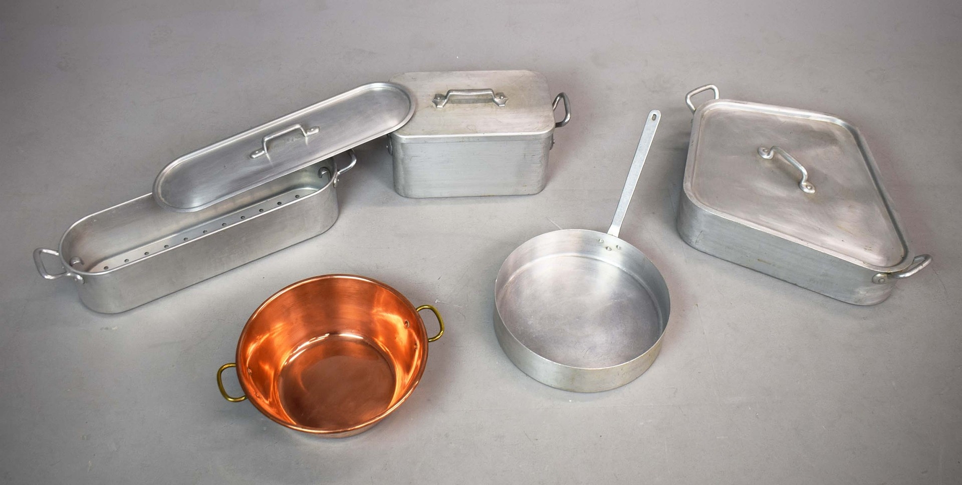 A COLLECTION OF FIVE KITCHEN FISH POACHERS AND PANS. (5). comprising an aluminium turbot poacher and fish poacher along with a large lidded pan, frying pan and copper bowl. Turbot poacher 70cm x 55cm w.