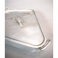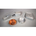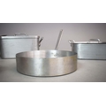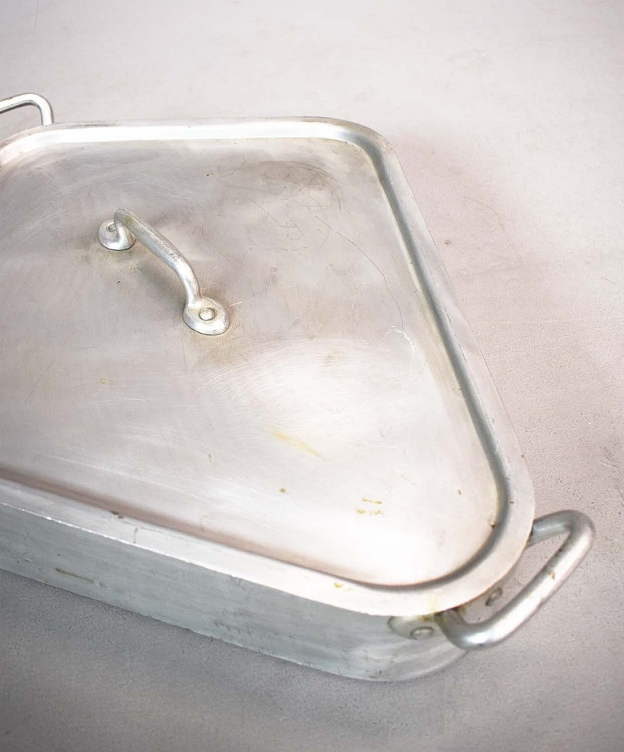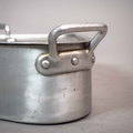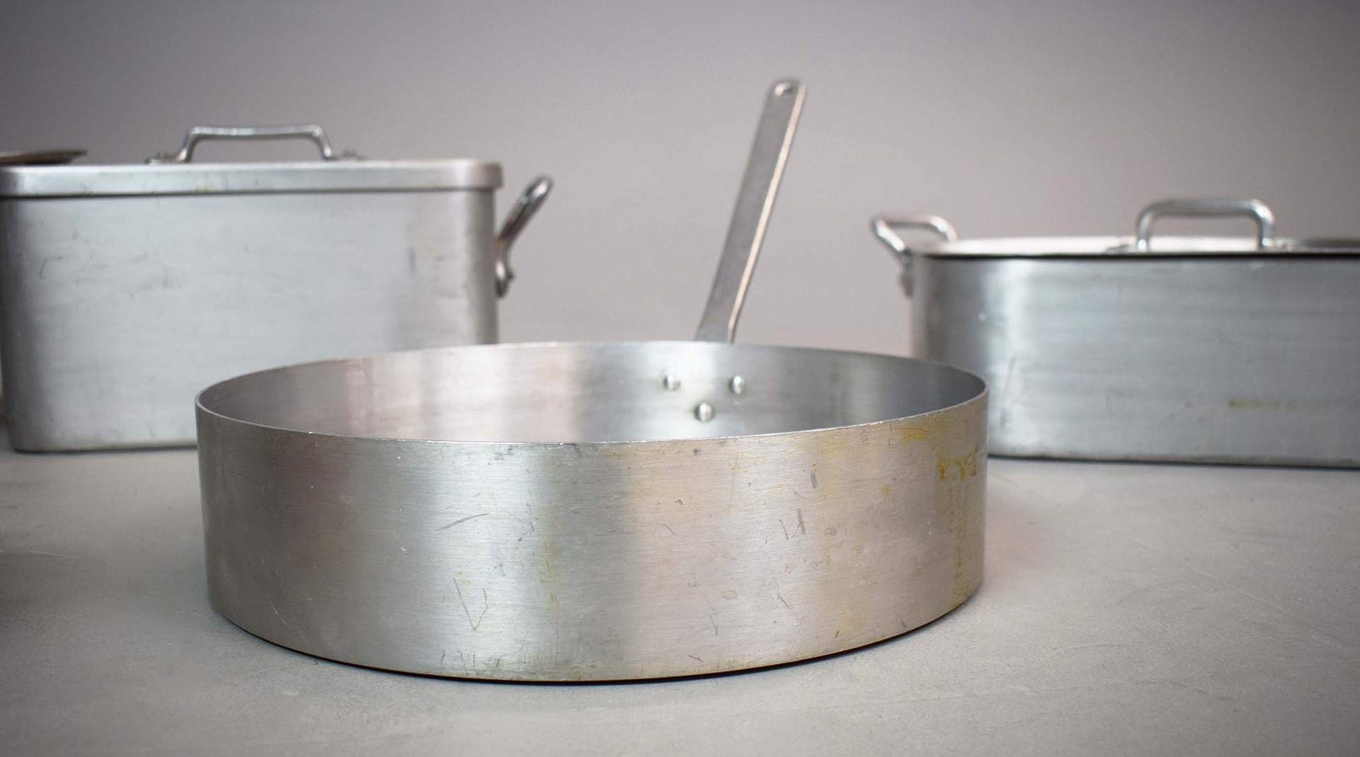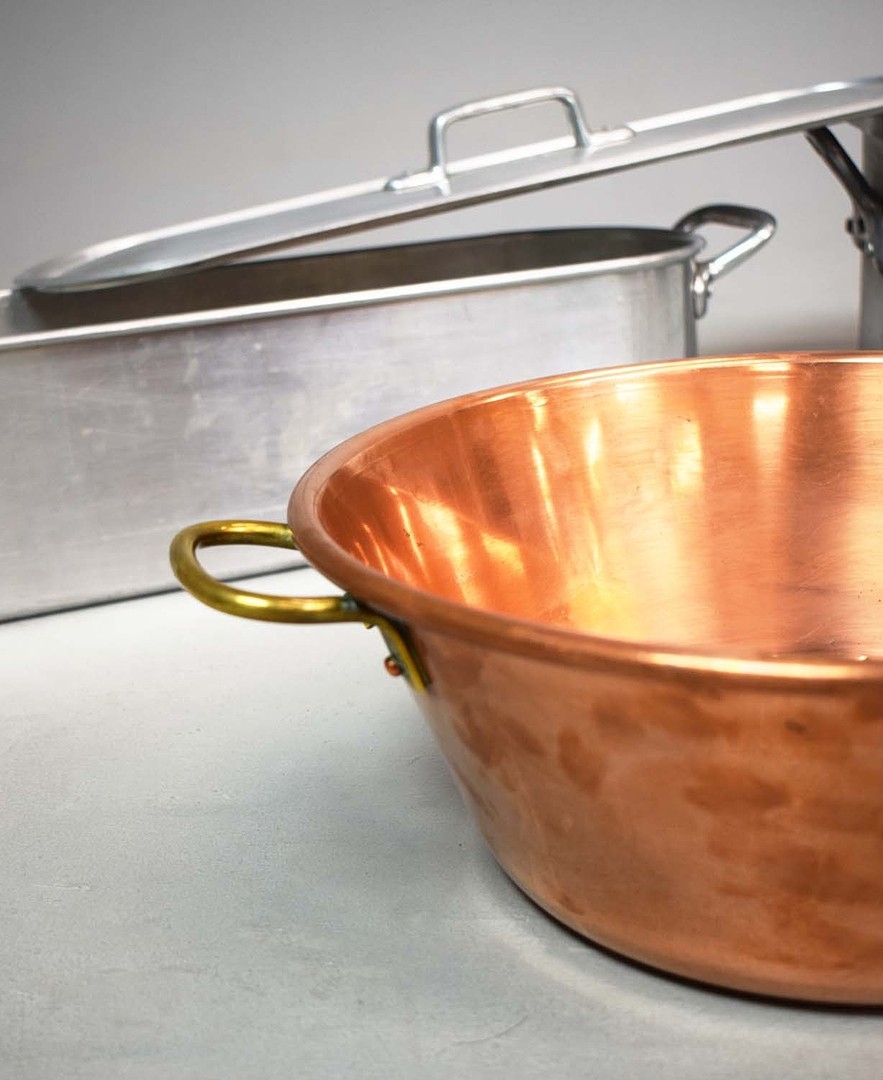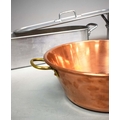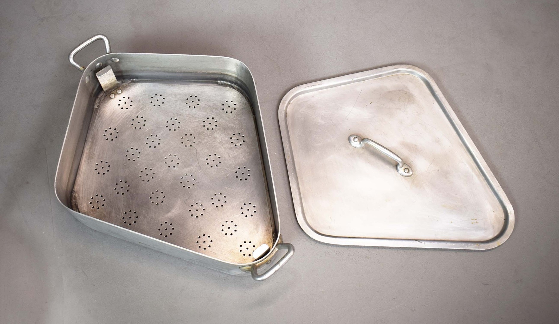 A COLLECTION OF FIVE KITCHEN FISH POACHERS AND PANS. (5). comprising an aluminium turbot poacher and fish poacher along with a large lidded pan, frying pan and copper bowl. Turbot poacher 70cm x 55cm w.