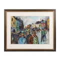 A vibrant and bustling portrayal of Clifden, executed with Webb’s unmistakable dynamism. Figures gather in animated clusters against brightly painted shopfronts, while the artist’s layered mixed-media technique injects vitality, rhythm, and colour into this spirited Connemara street scene. Image: 54 x 75 cm. Framed: 83 x 101 cm. PICTURES AND PRINTS Thursday 11th December 2025 18:18:40