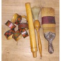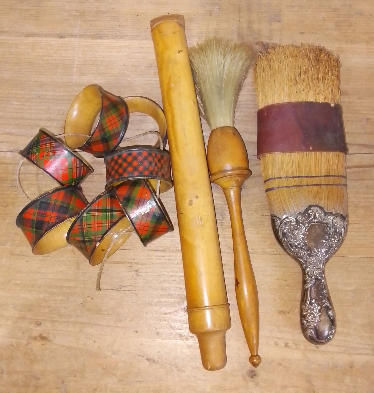 Assorted treen comprising tartan ware serviette rings, a cased thermometer and two brushes.