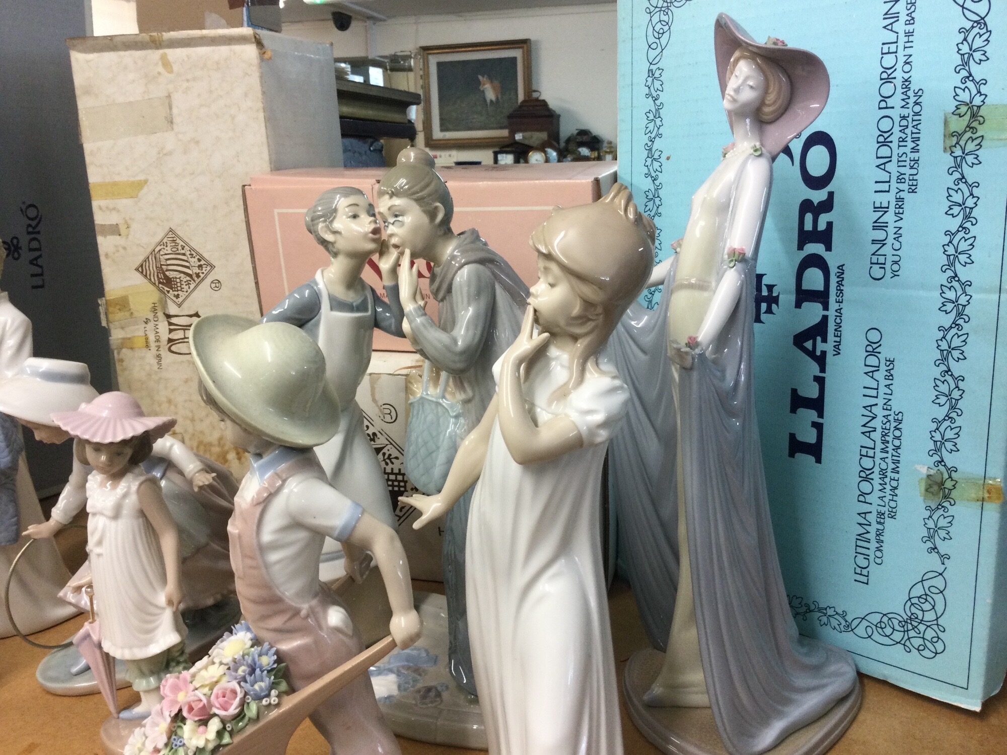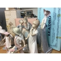 A collection of Lladro and Nao porcelain figures including Gossips, Girl with hoop , some boxed (8)