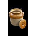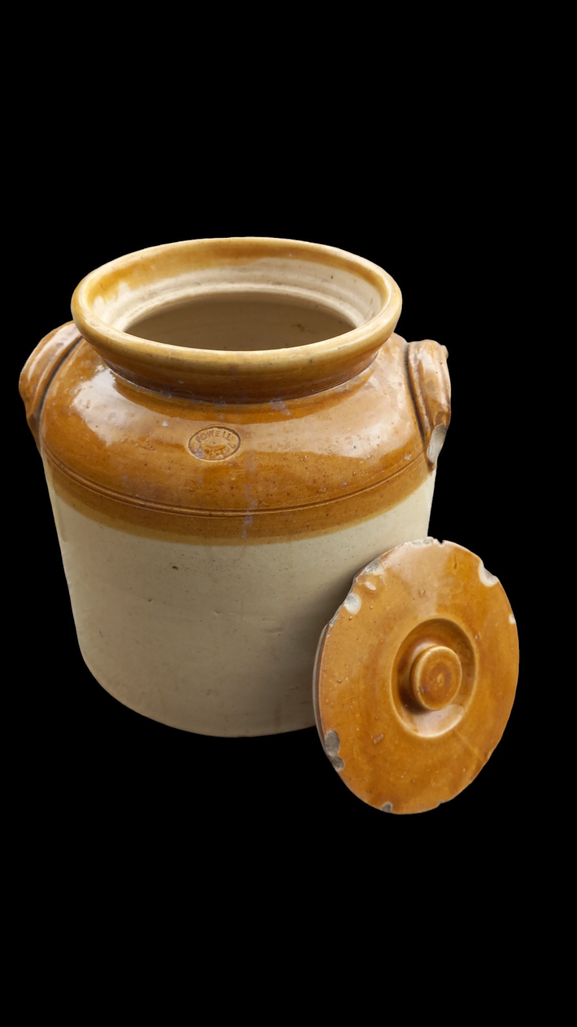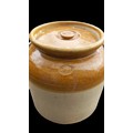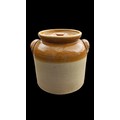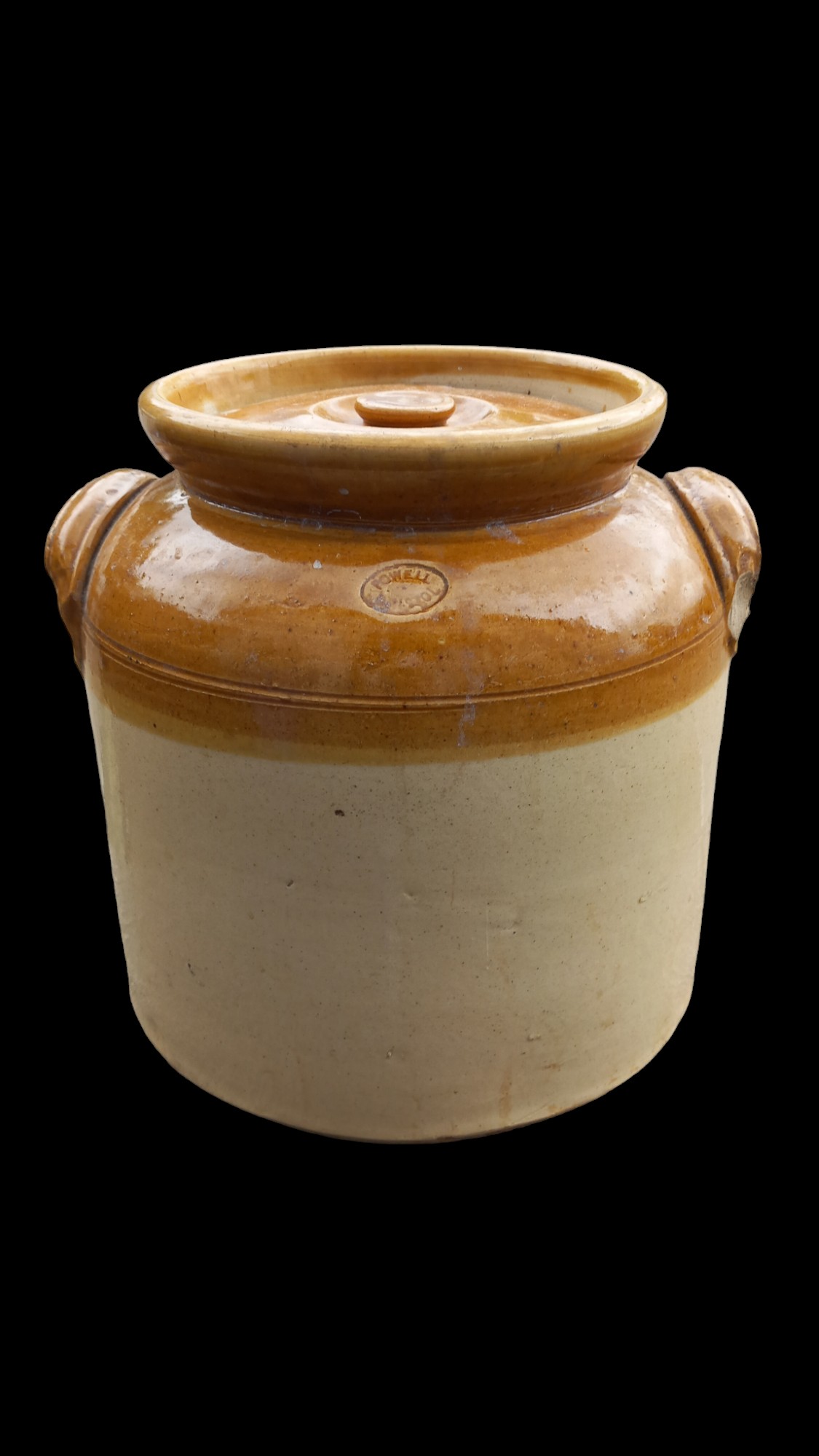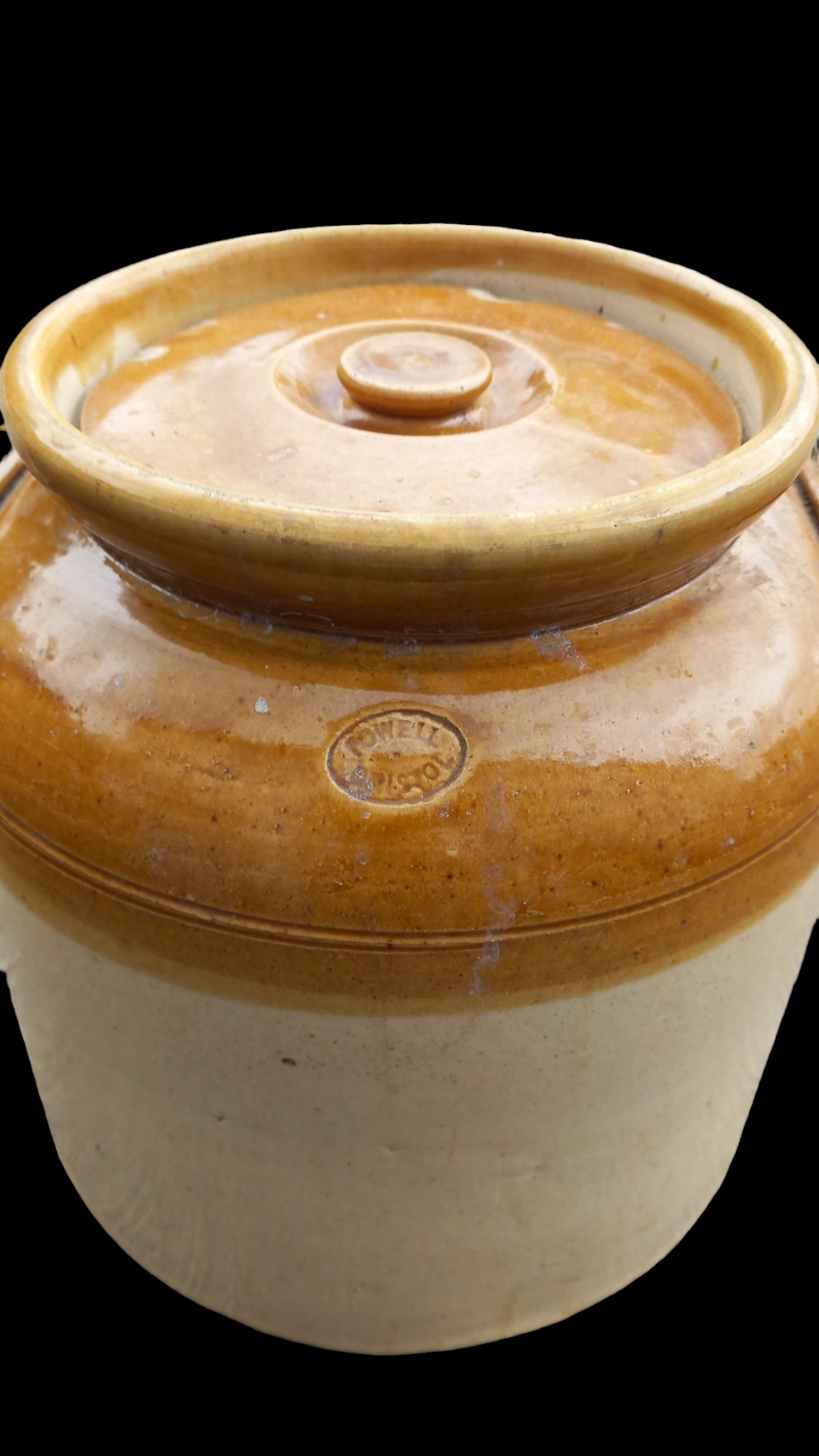 A LARGE VINTAGE STONE JAR WITH LID HAS IMPRESSED STAMP POWELL 10x10"