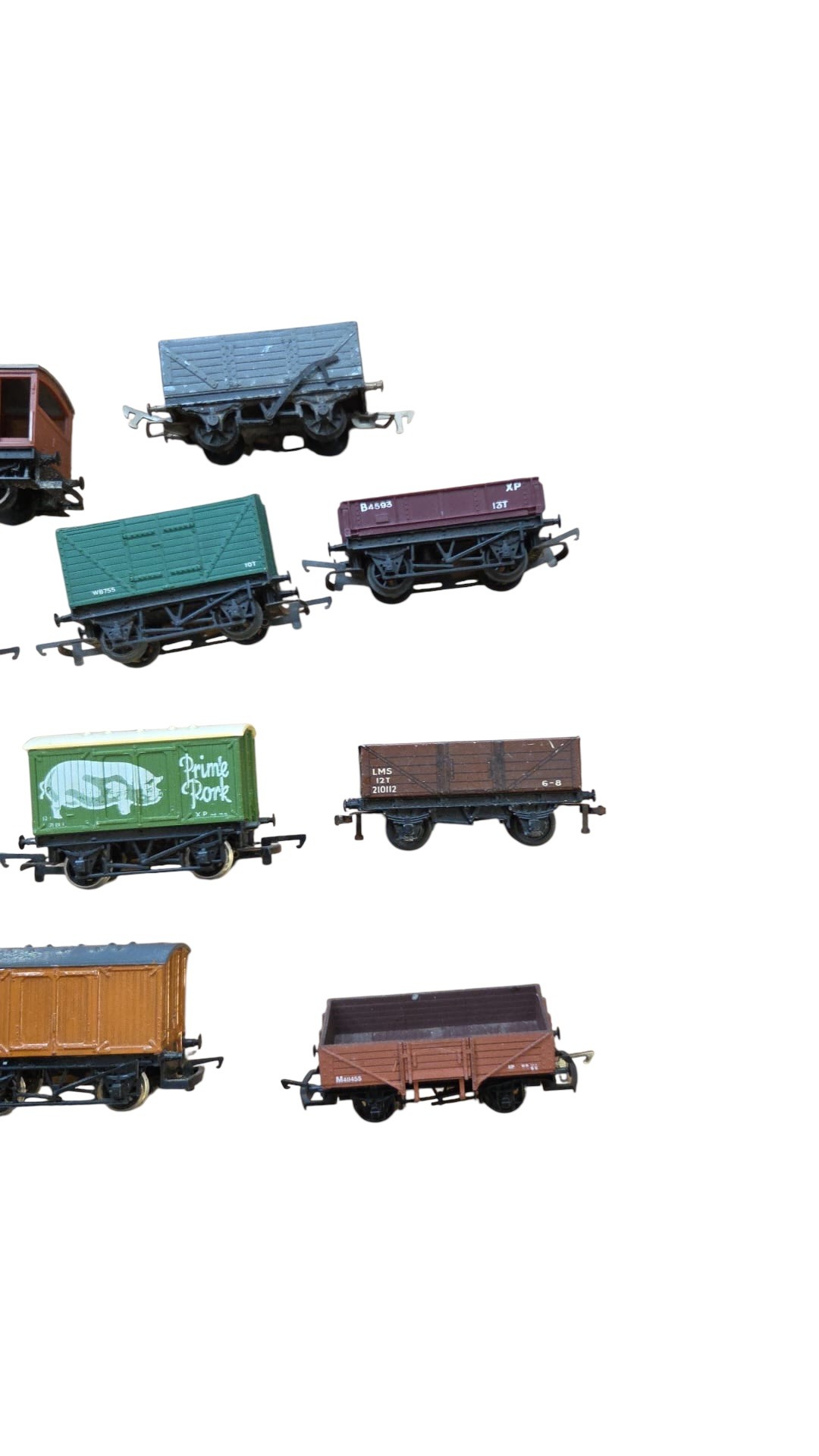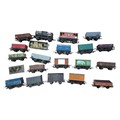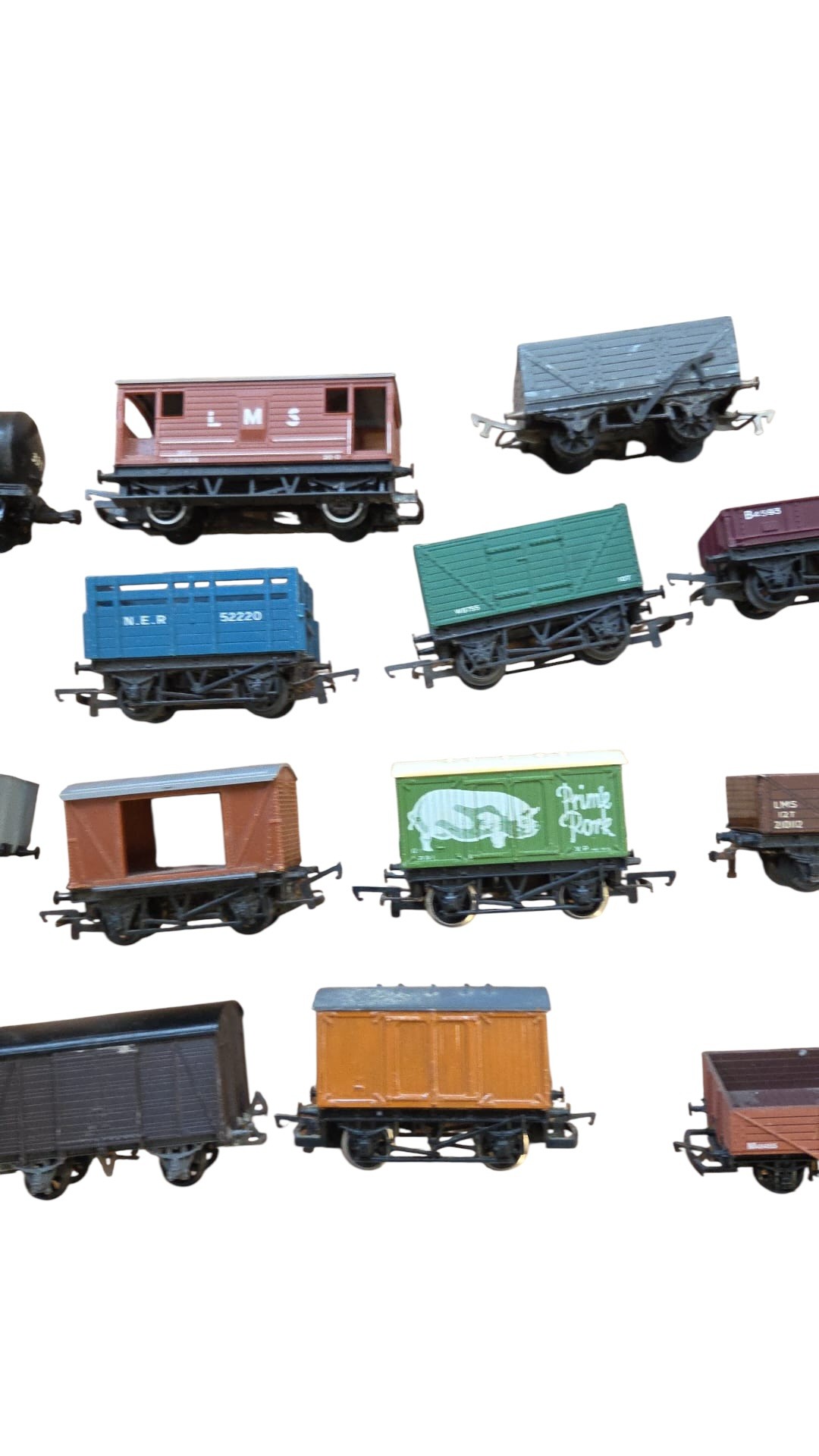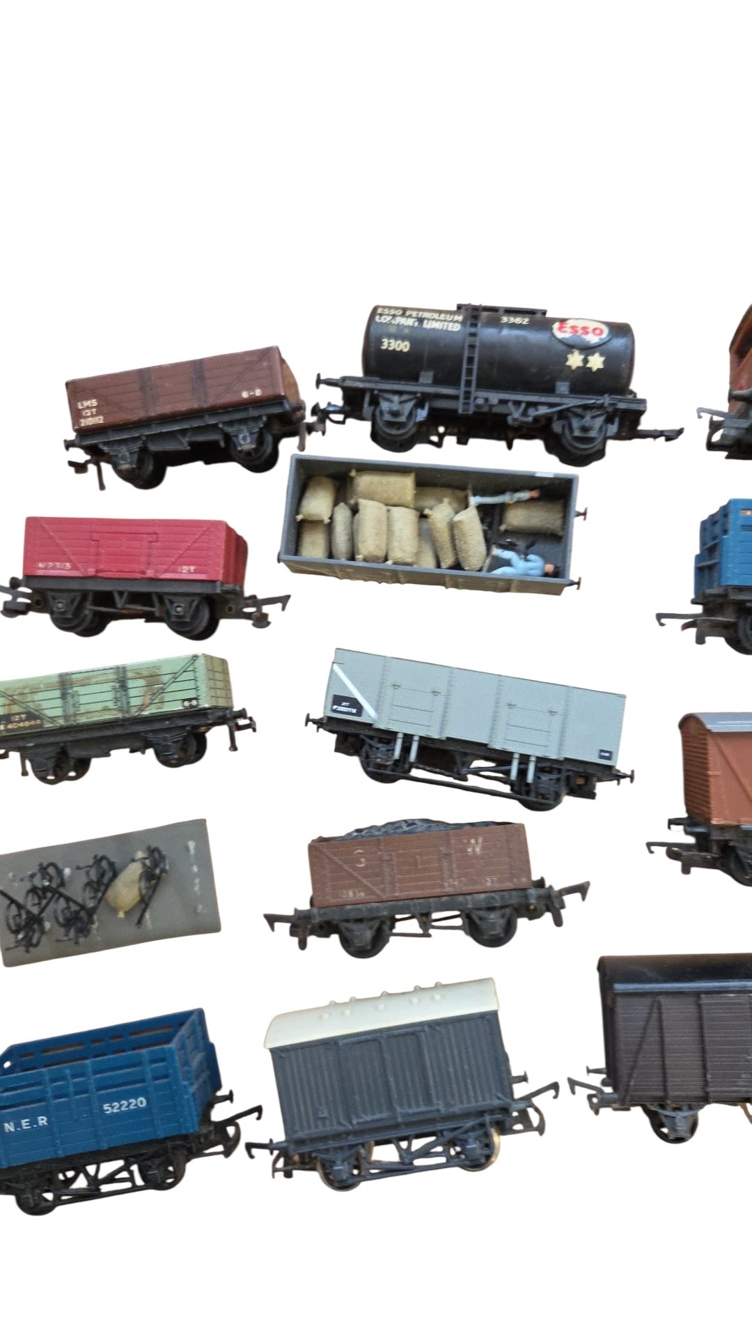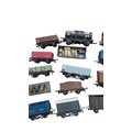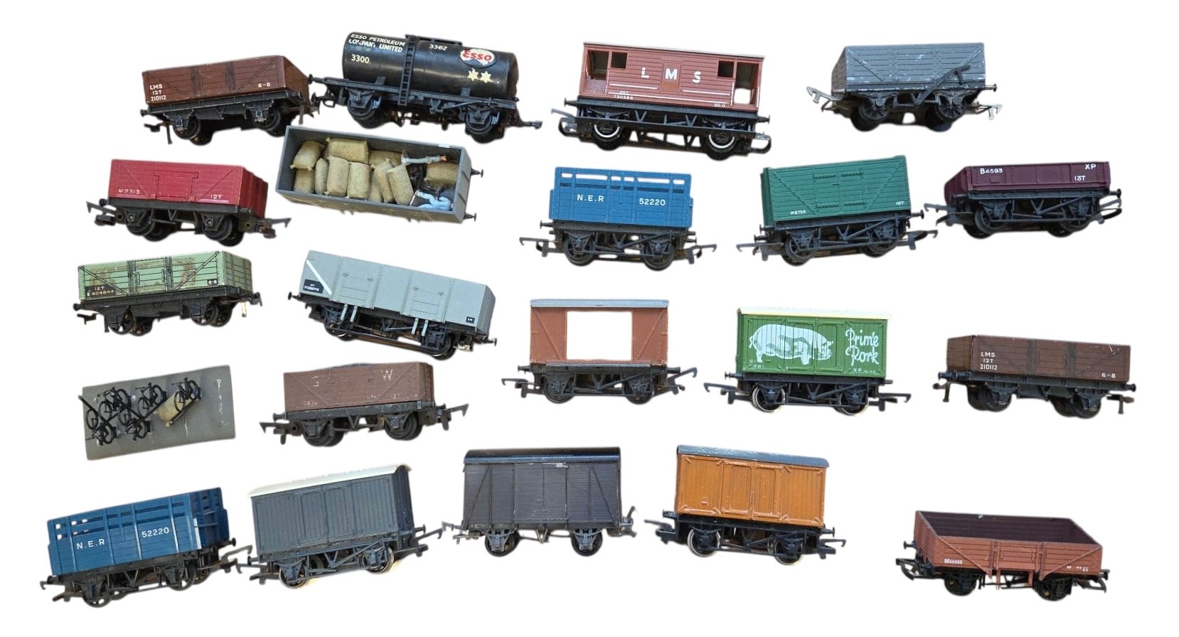 A group of mainly Hornby OO-gauge model railway rolling stock, including open and covered goods wagons, a brake van, and a fuel tanker wagon, in assorted liveries with printed wagon numbers and commercial branding.