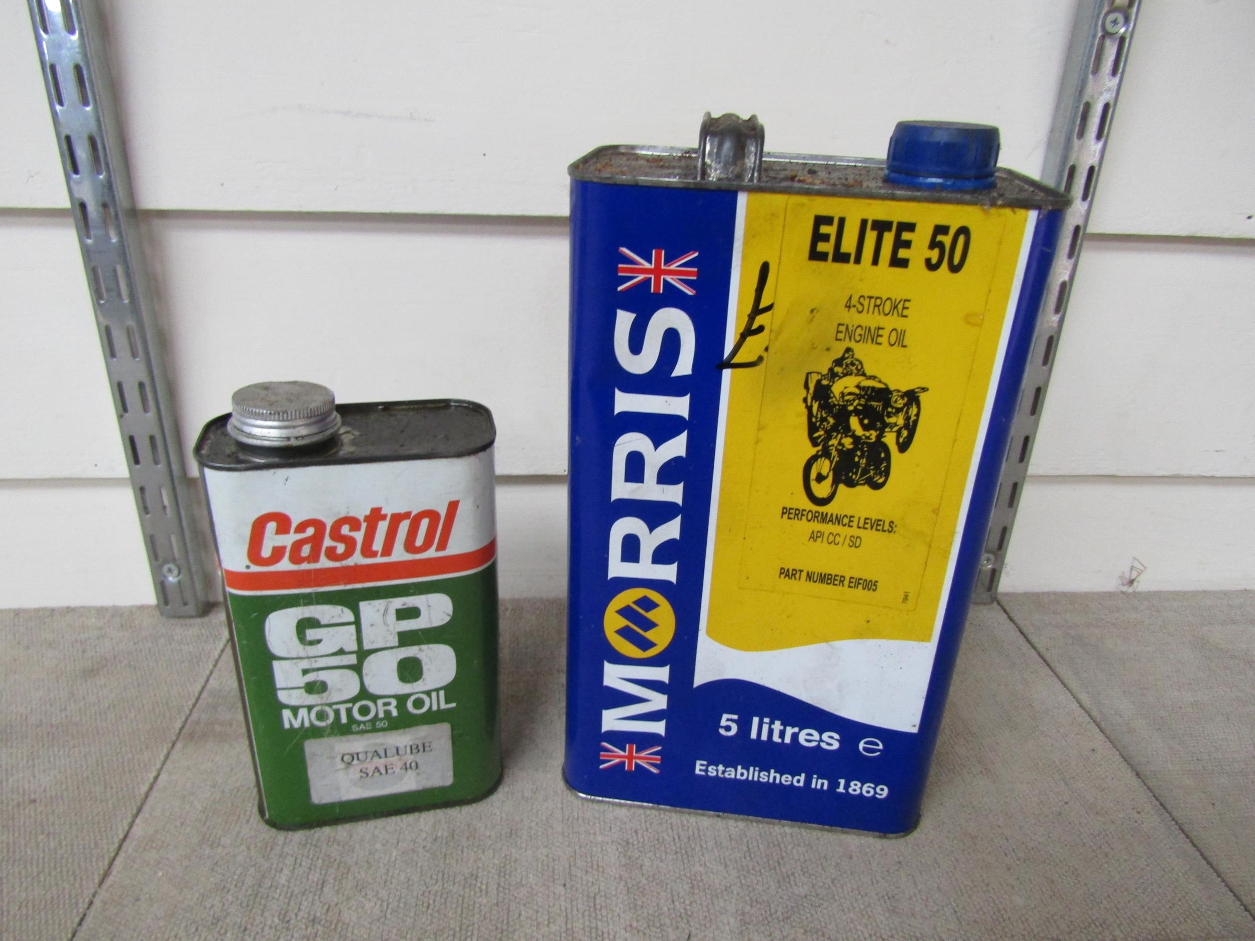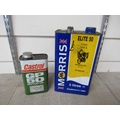 A Castrol GP50 motor oil tin and a Morris Elite 50 oil tin
