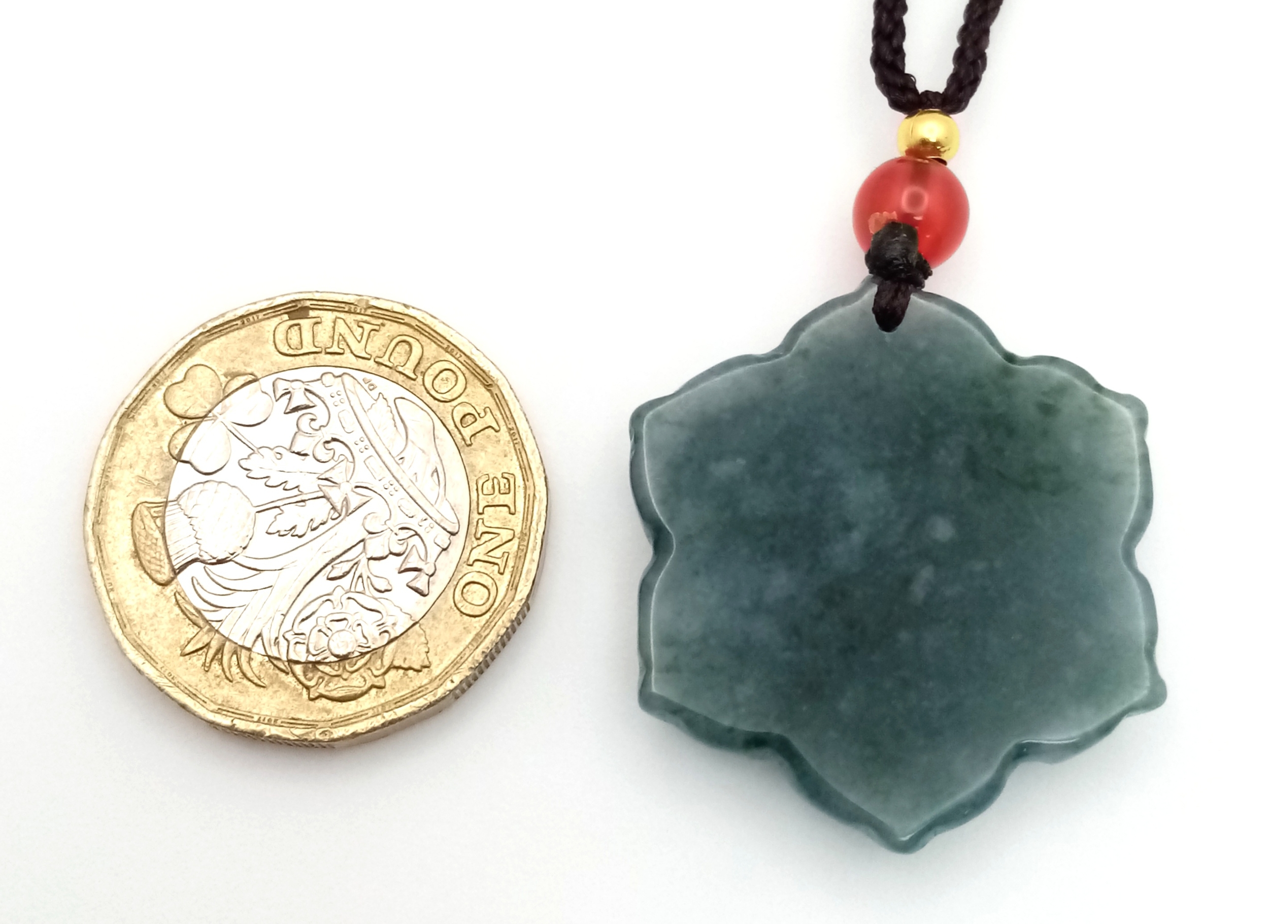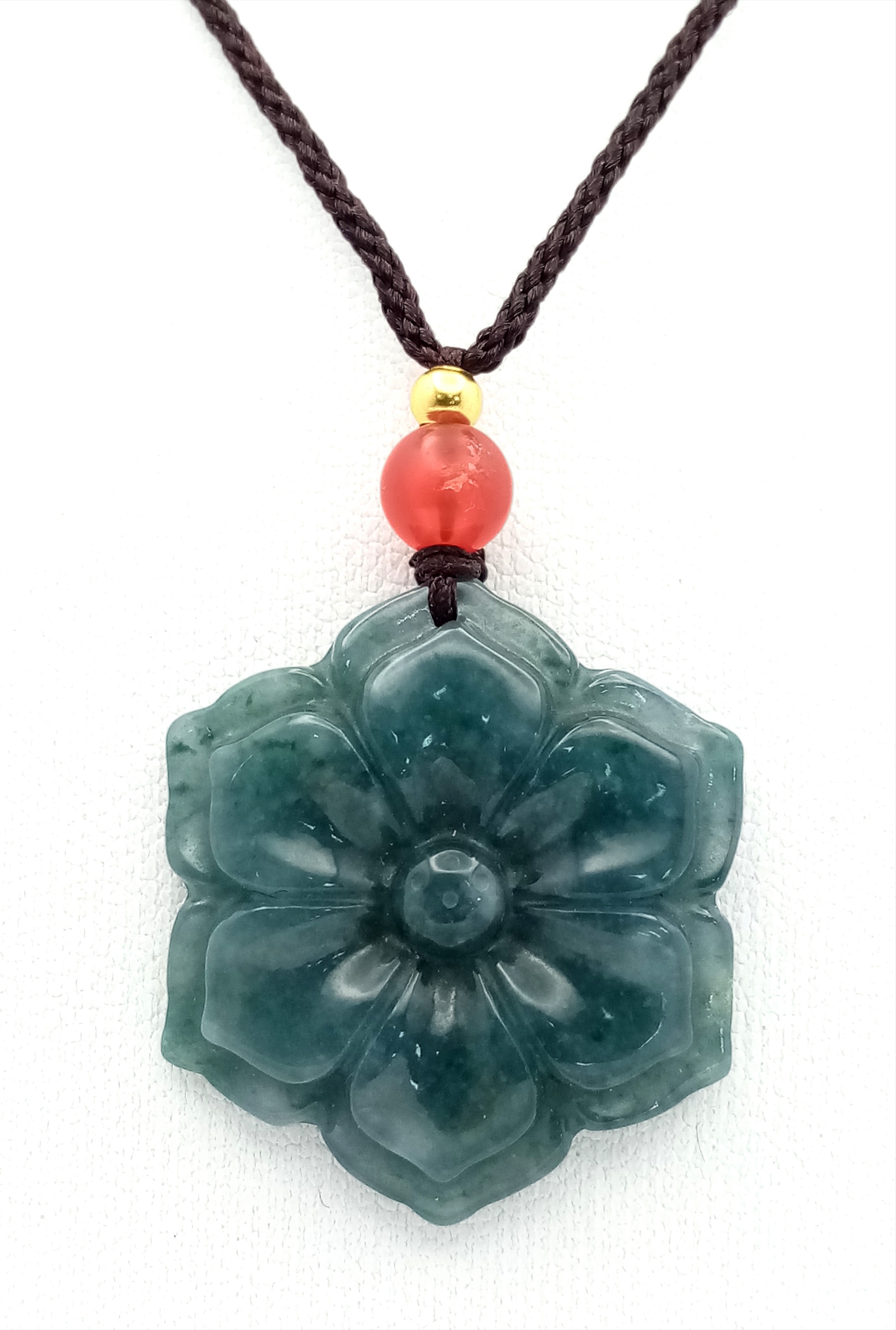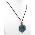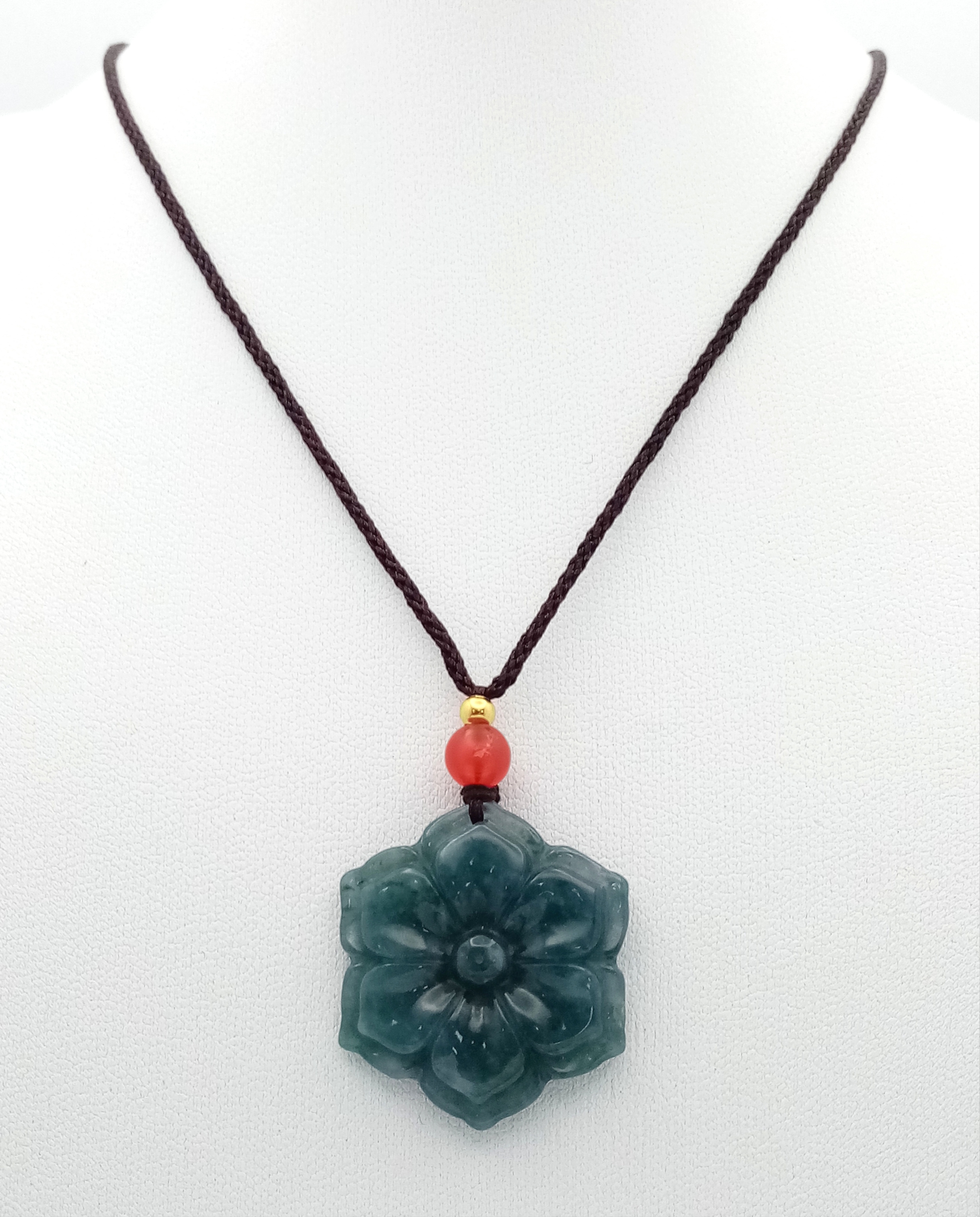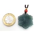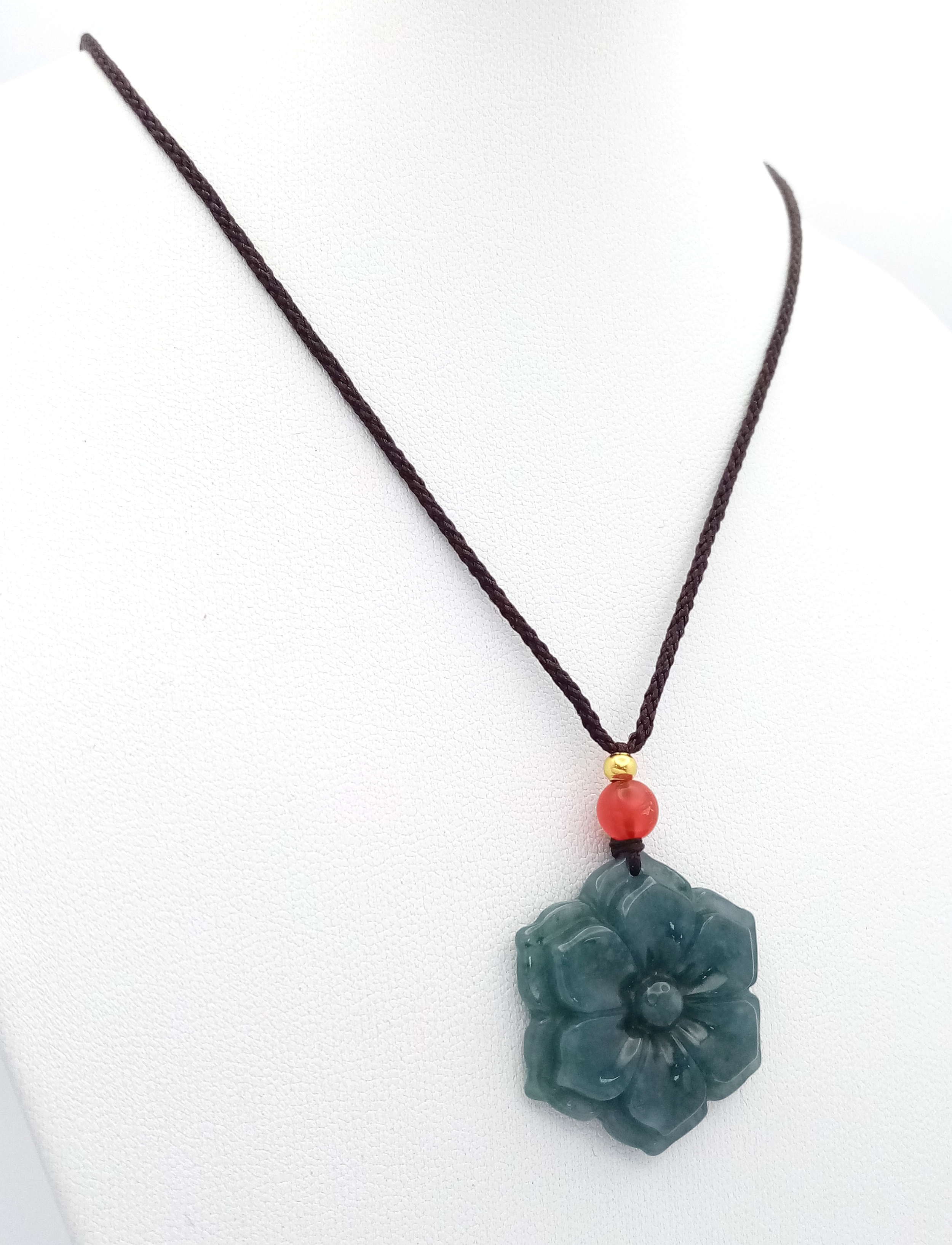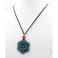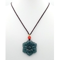 A natural green jadeite blossom flower pendant on rope chain, 2.5cm diameter, 64cm rope length.