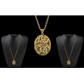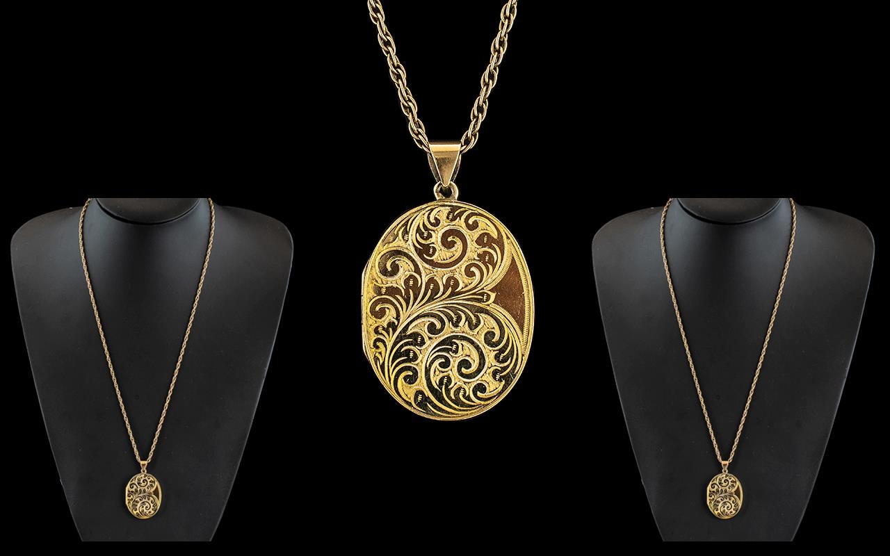 Ladies - Excellent Quality 9ct Gold Oval Shaped Hinged Locket with Chased Decoration to Front Cover, Attached to a 9ct Gold Double Link Chain. Both Locket and Chain Fully Hallmarked for 9.375. Gold Weight 21.5 grams. Locket 1.5 Inches - 3.75 cms High & Chain length 22 Inches - 55 cms.