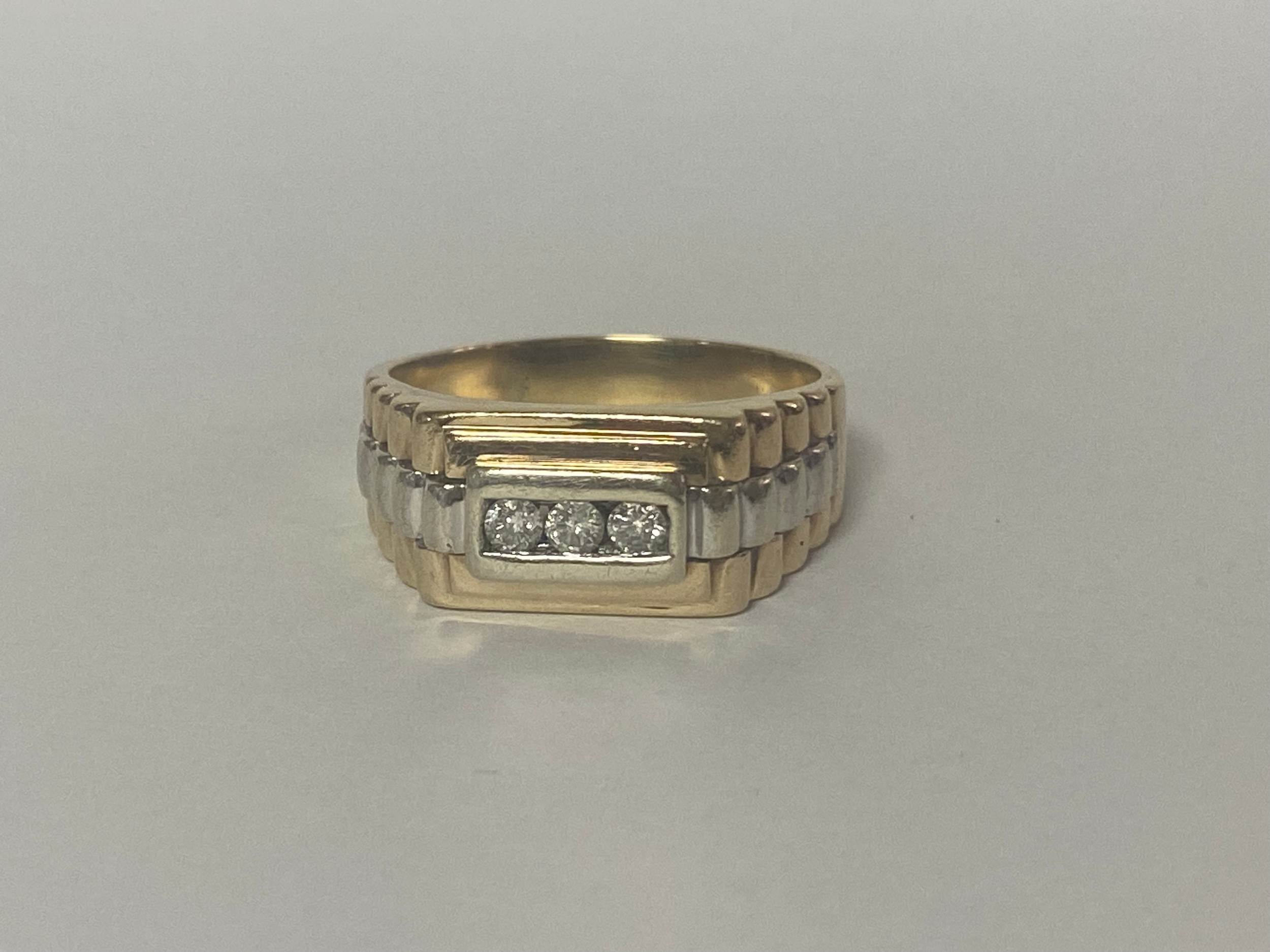 A 9ct gold 'Rolex' strap style ring, set with three diamonds -