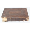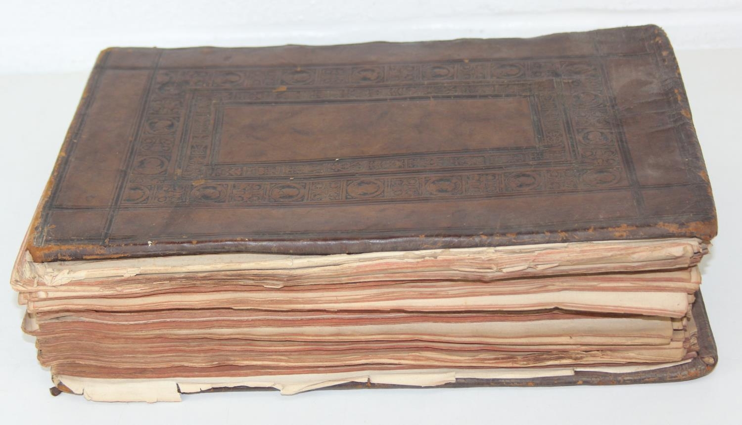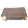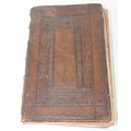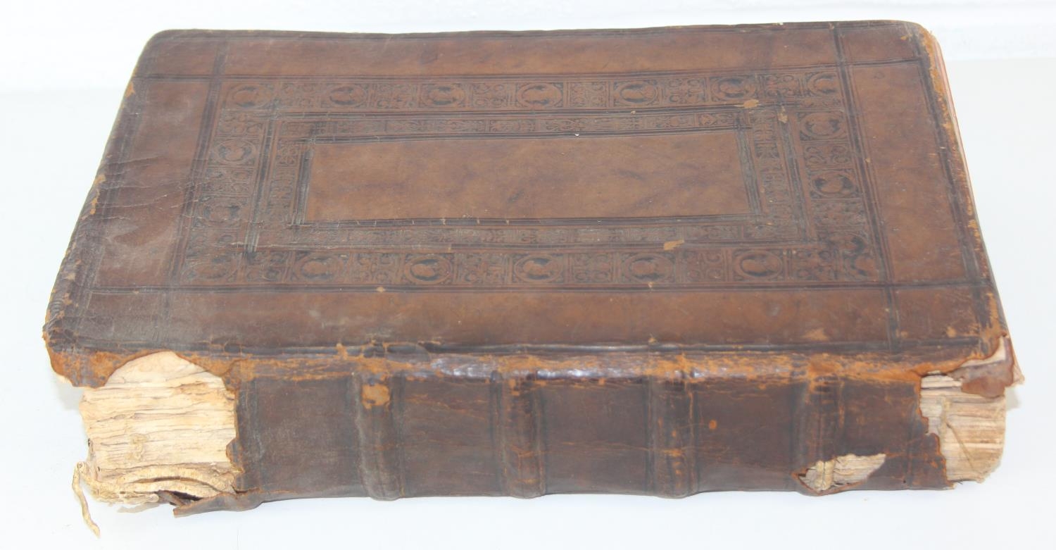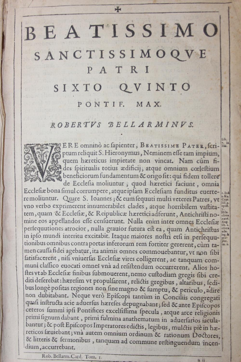 1620 edition of 'Dispvtationvm Roberti Bellarmini Politiani, S.R.E. Cardinalis, de Controversiis Christianae Fidei' [Disputation of Robert Bellarmine, Society of Jesus Cardinal, on the Controversies of the Christian Faith]; original full leather binding including front tooling, but with damages, hand cut pages, appears complete