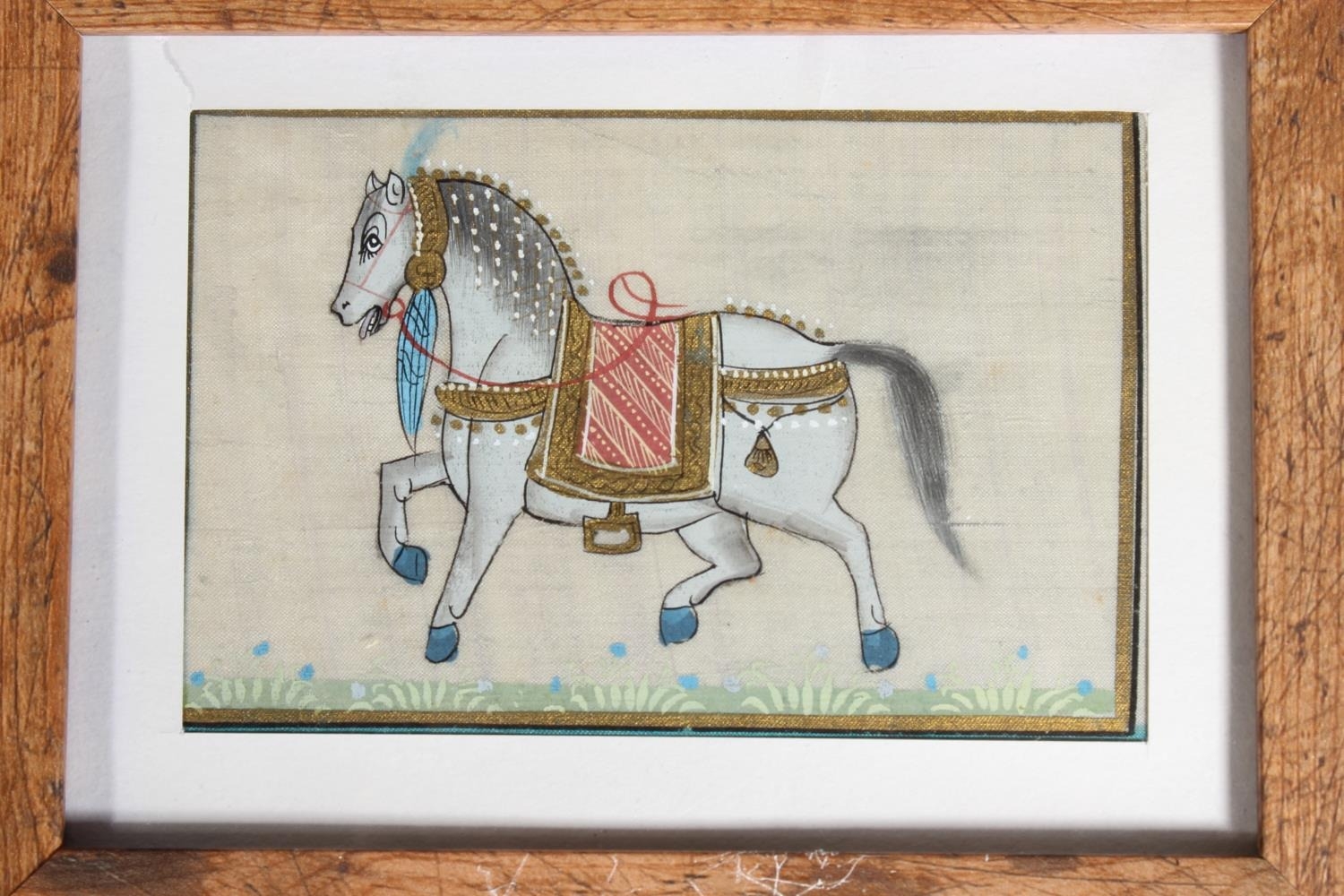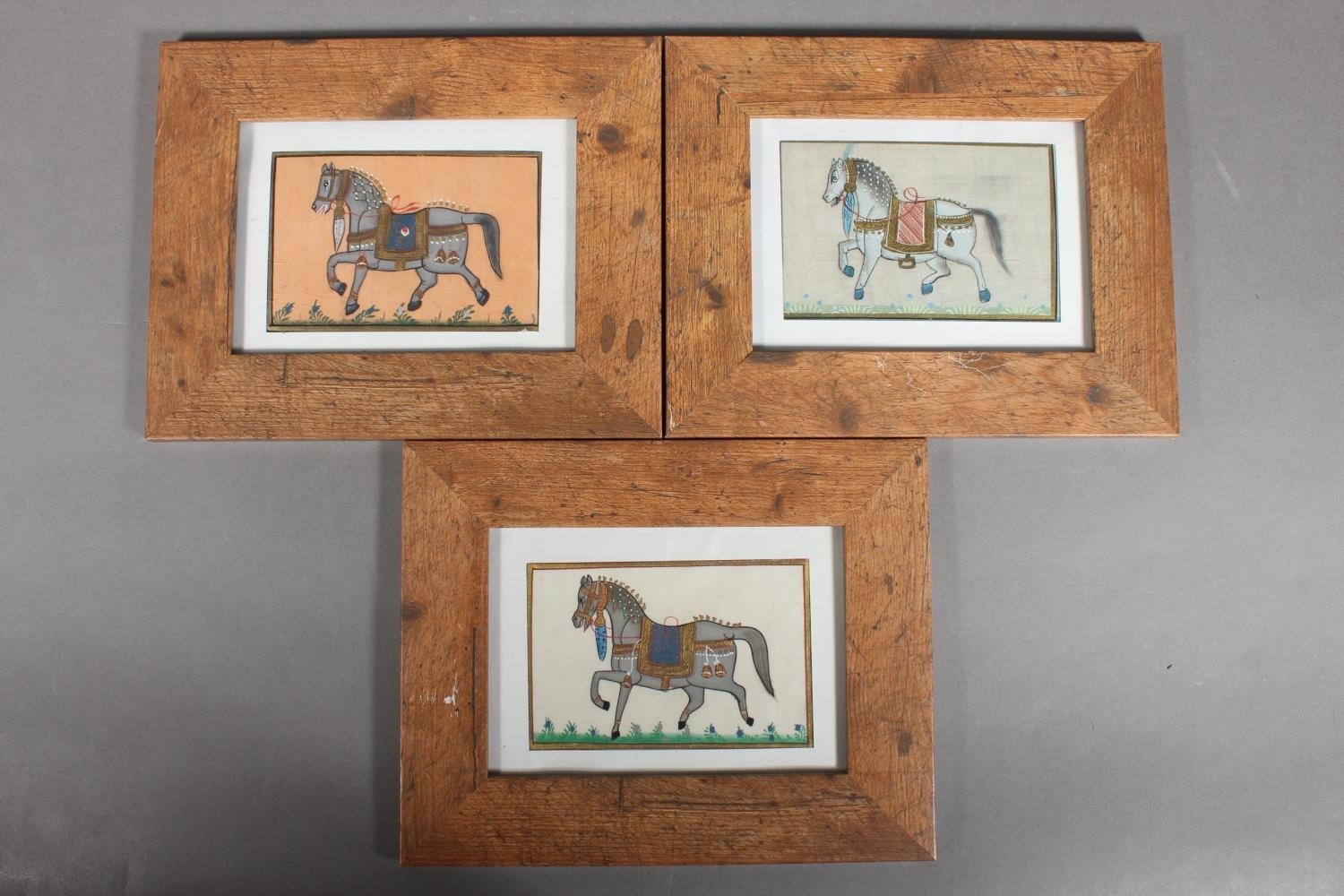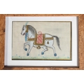 Three Mughal Indian style silk pictures of royal horses, in wooden frames.