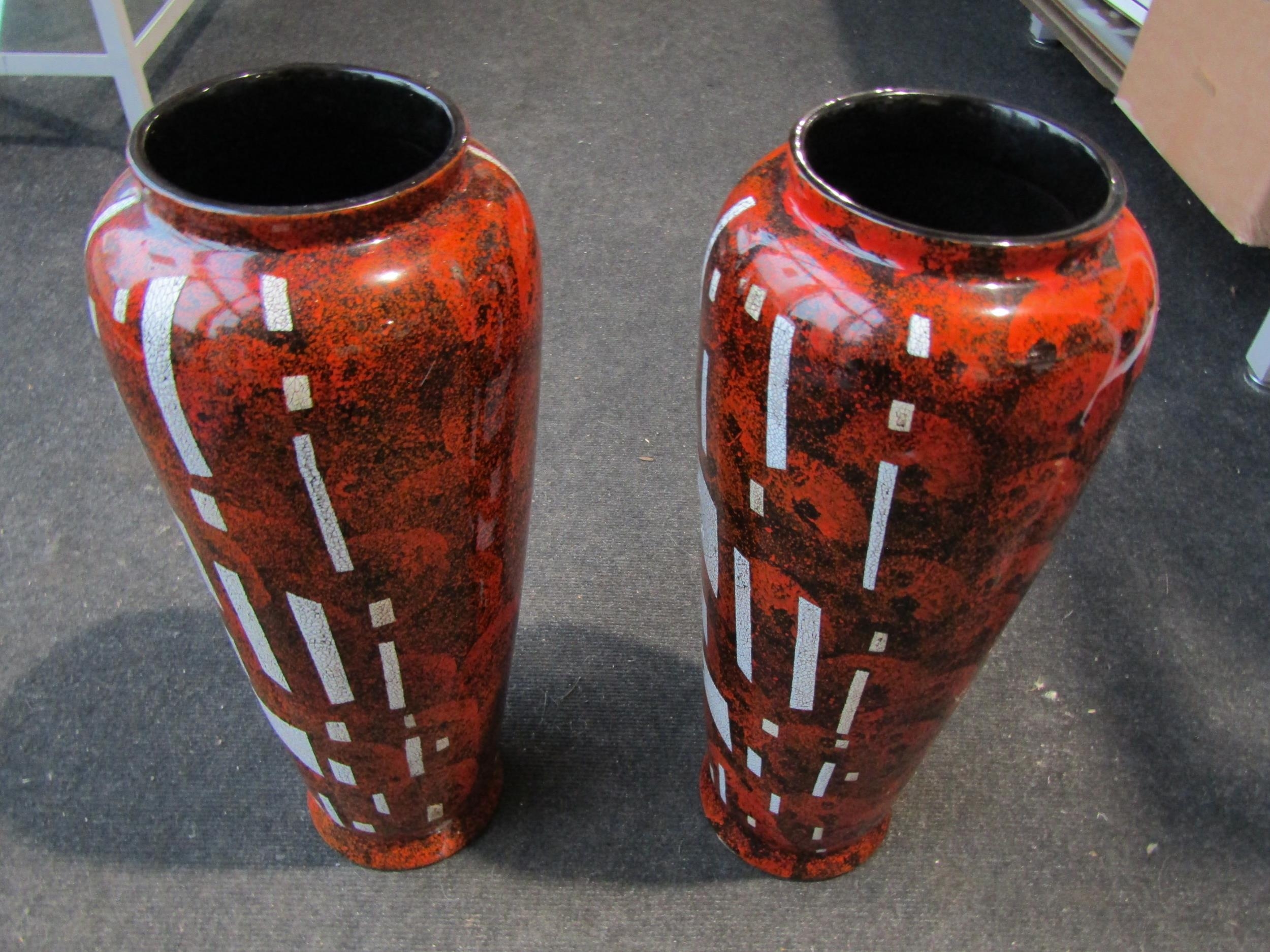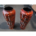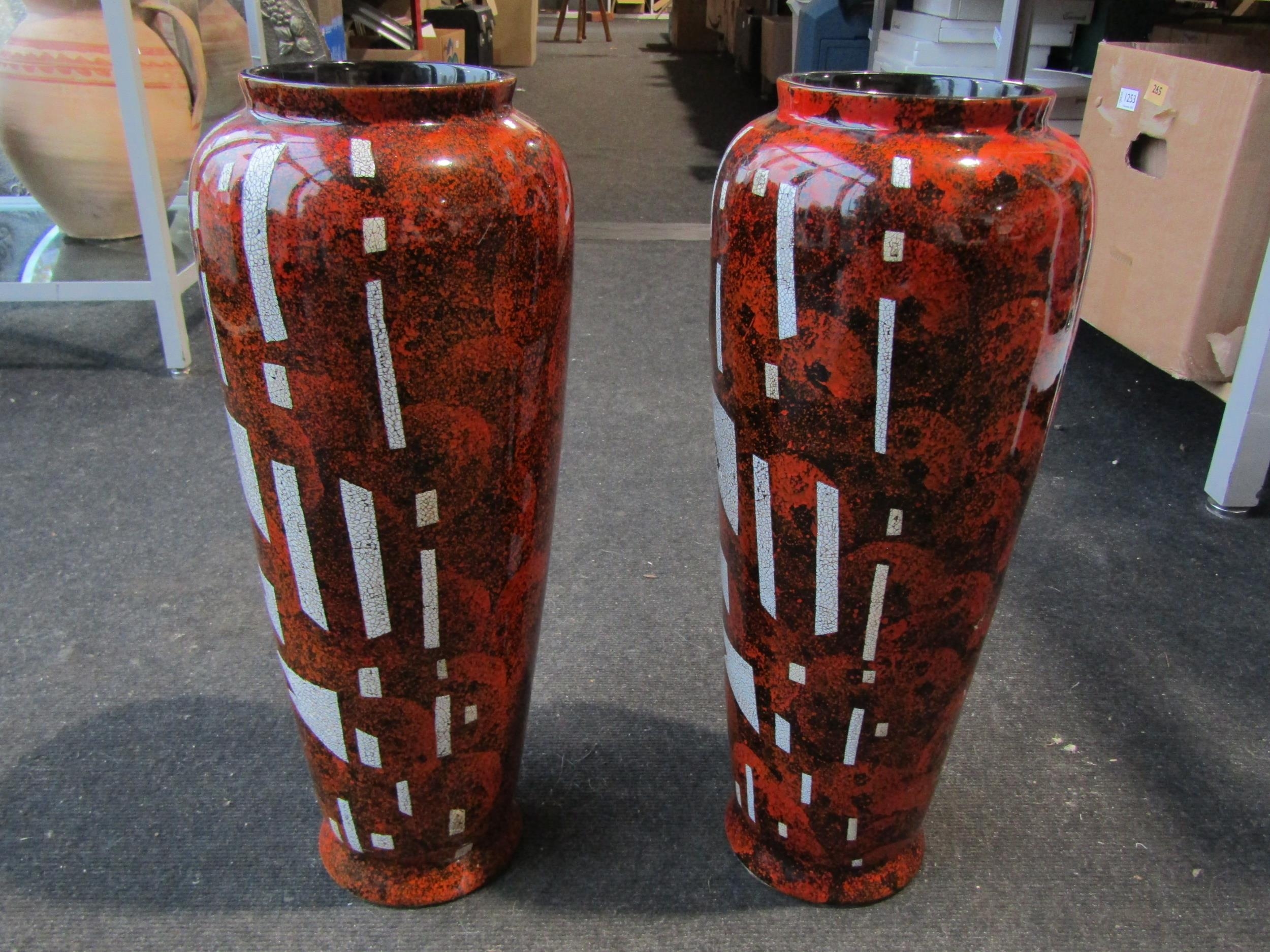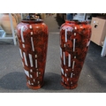 A pair of lacquered vases, orange/black and white mottled design, 50cm tall