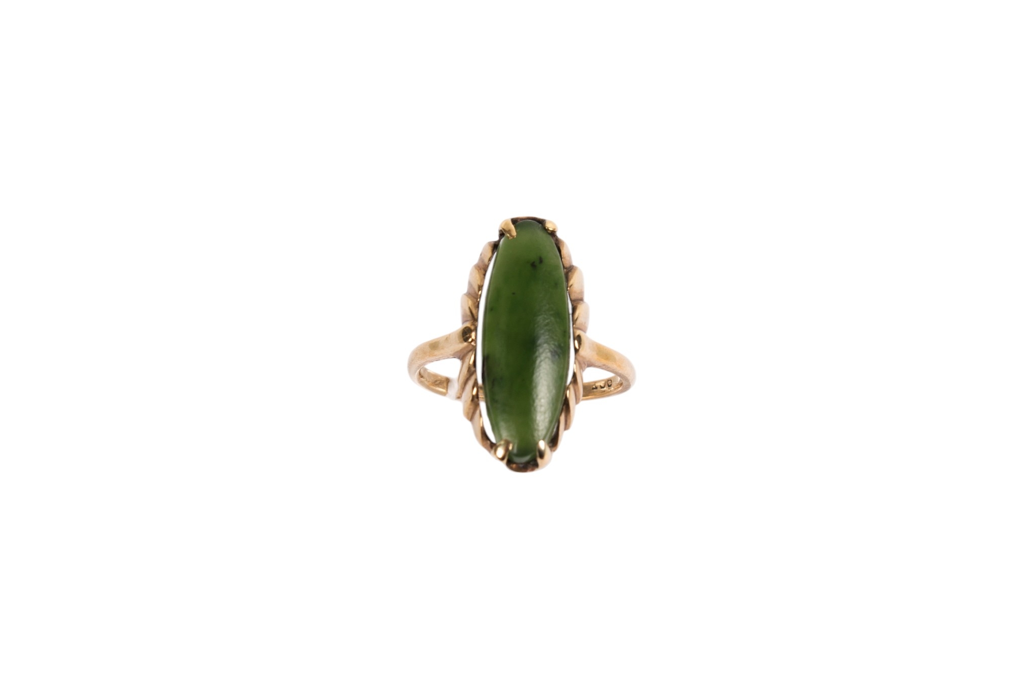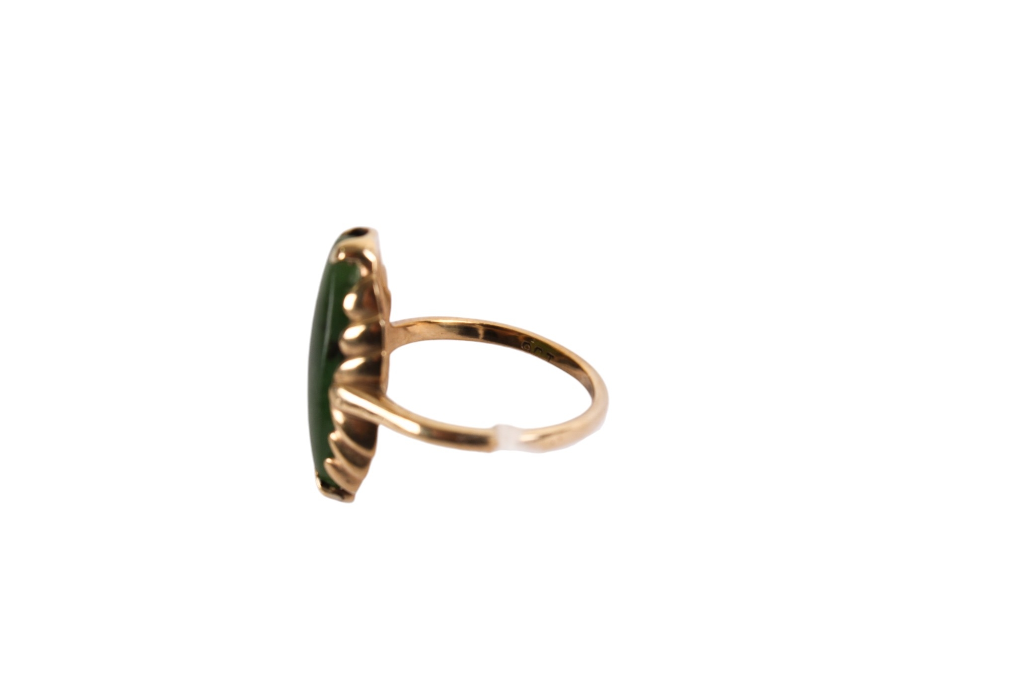 A 9ct gold (tested) nephrite dress ring. Set with one oval cabochon cut section of nephrite measuring 19mm in length. Marked 9ct, size K, gross weight 2.6g.