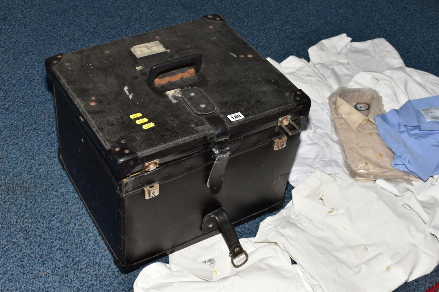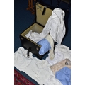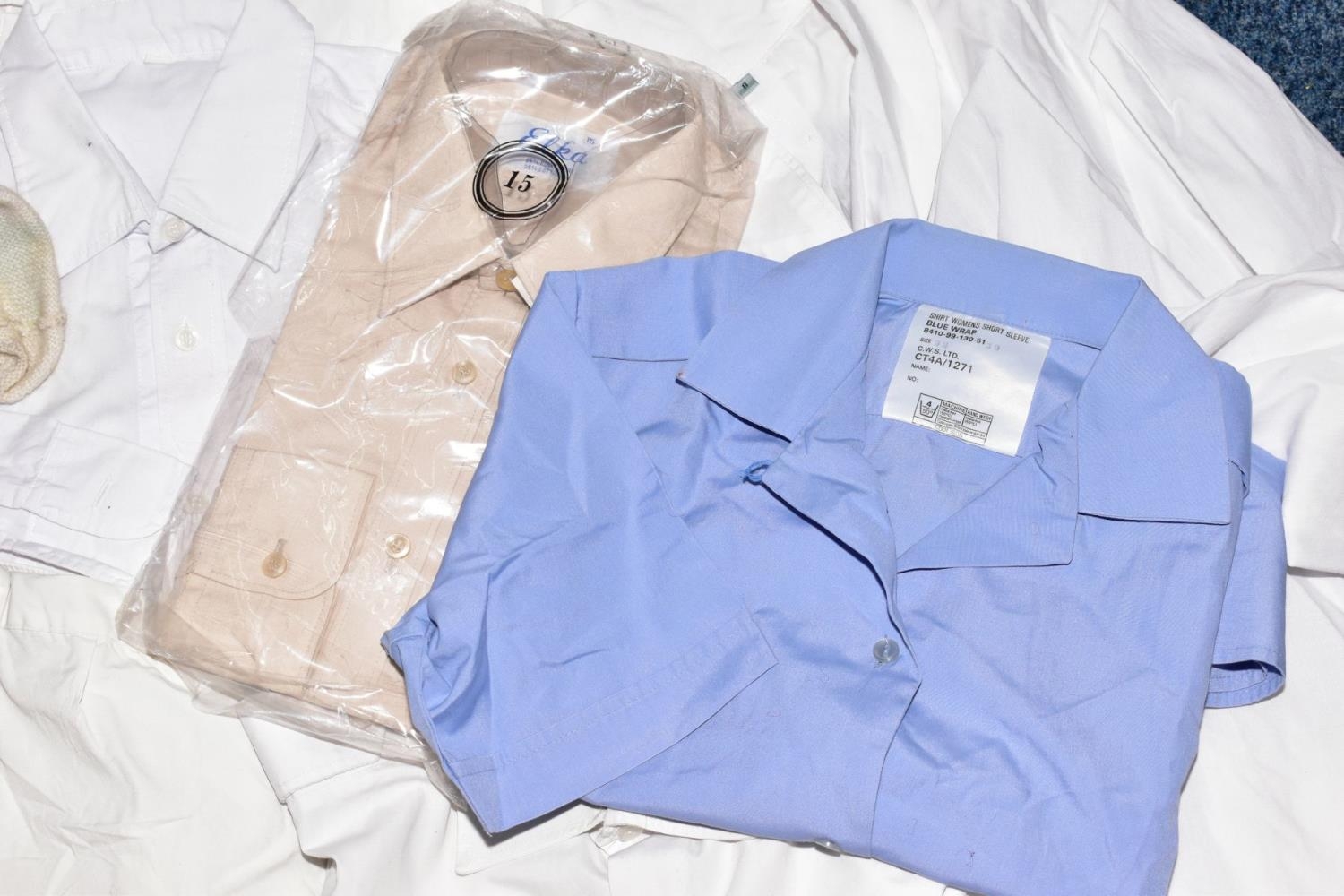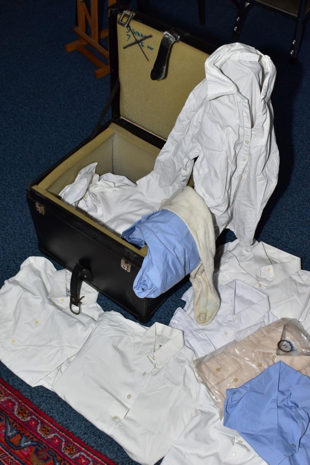 A BLACK CASE FULL OF MILITARY STYLE WHITE SHIRTS AND BLOUSES FOR MEN AND WOMEN, also two beige shirts wrapped and unused