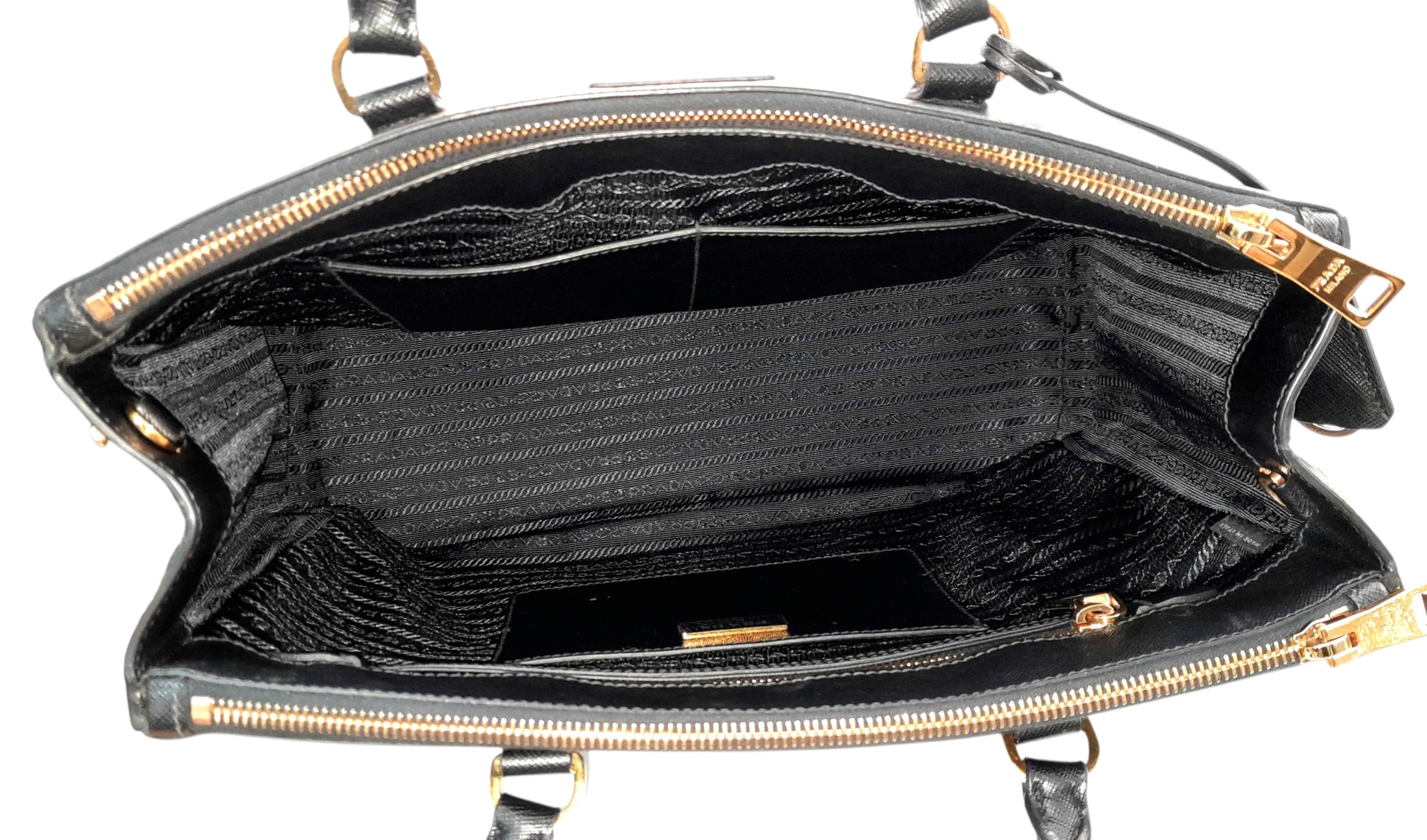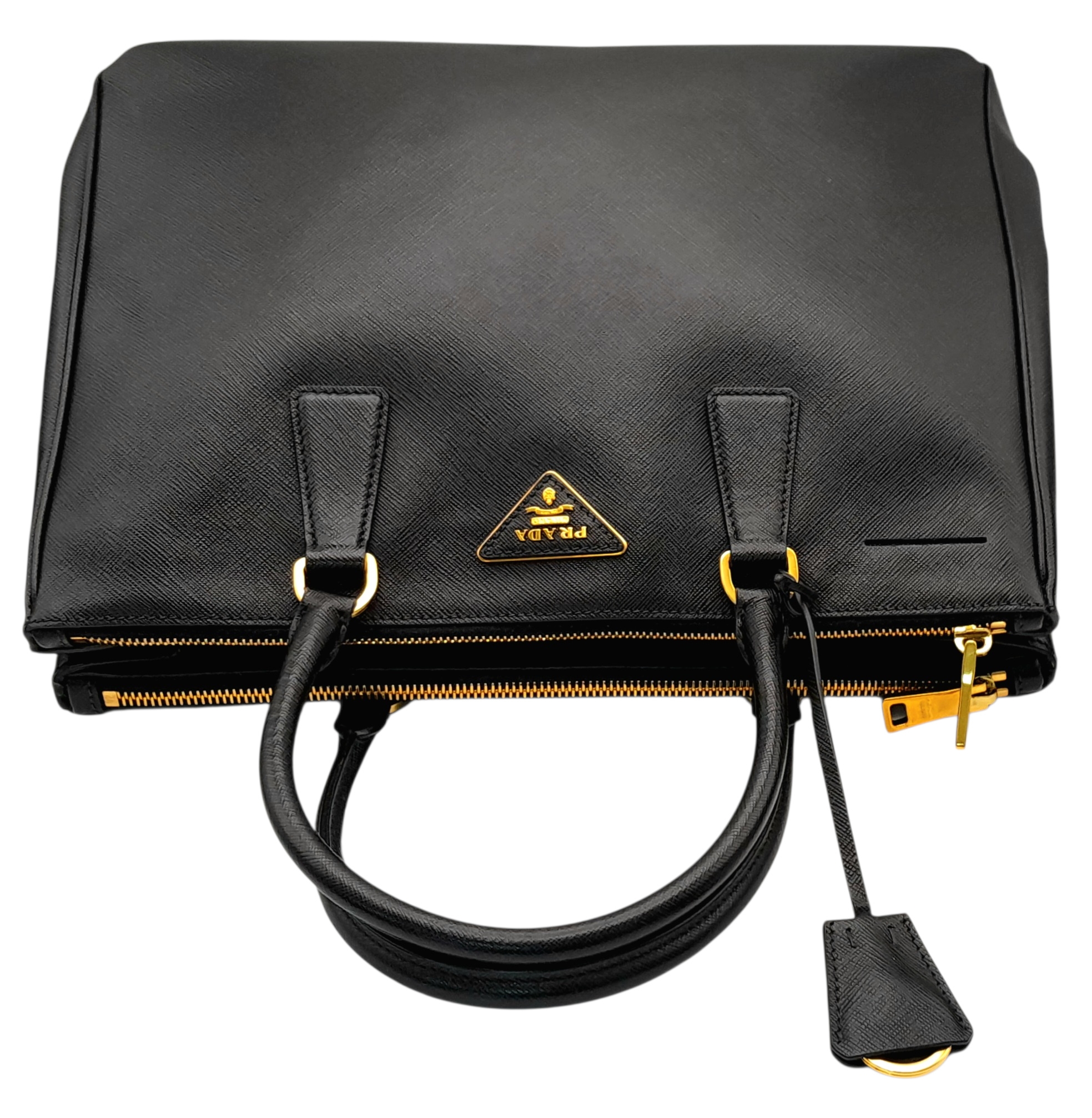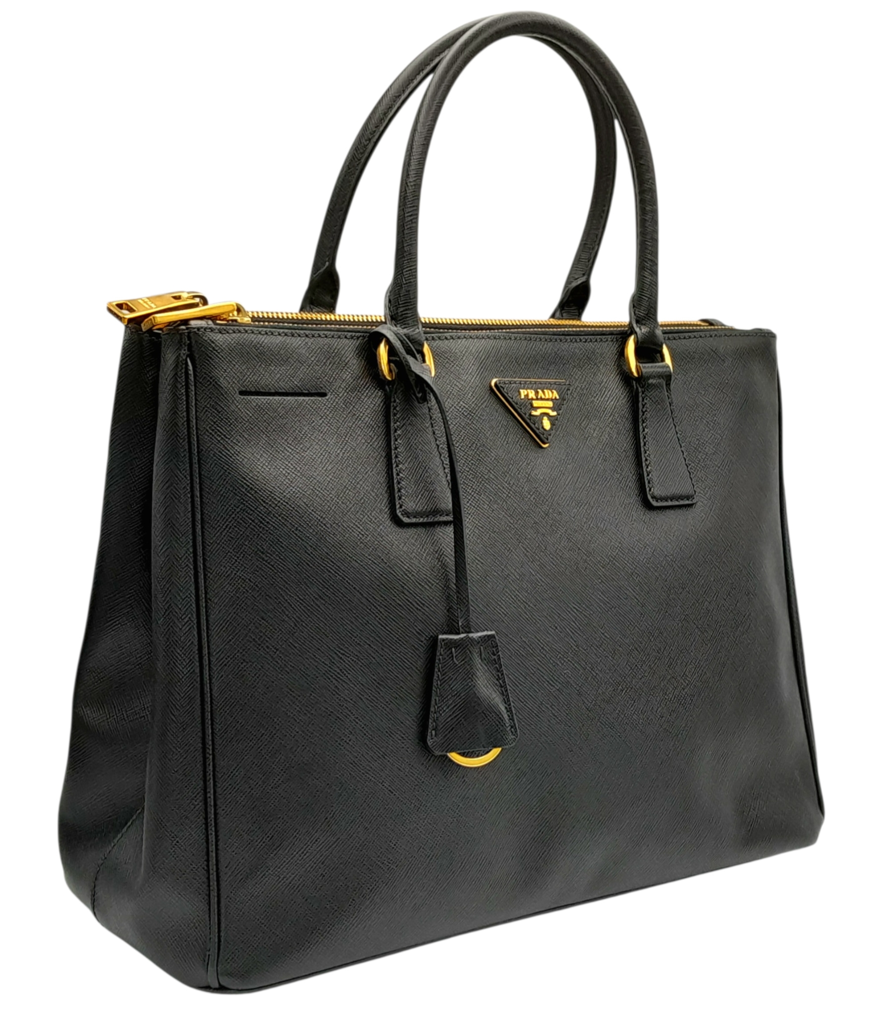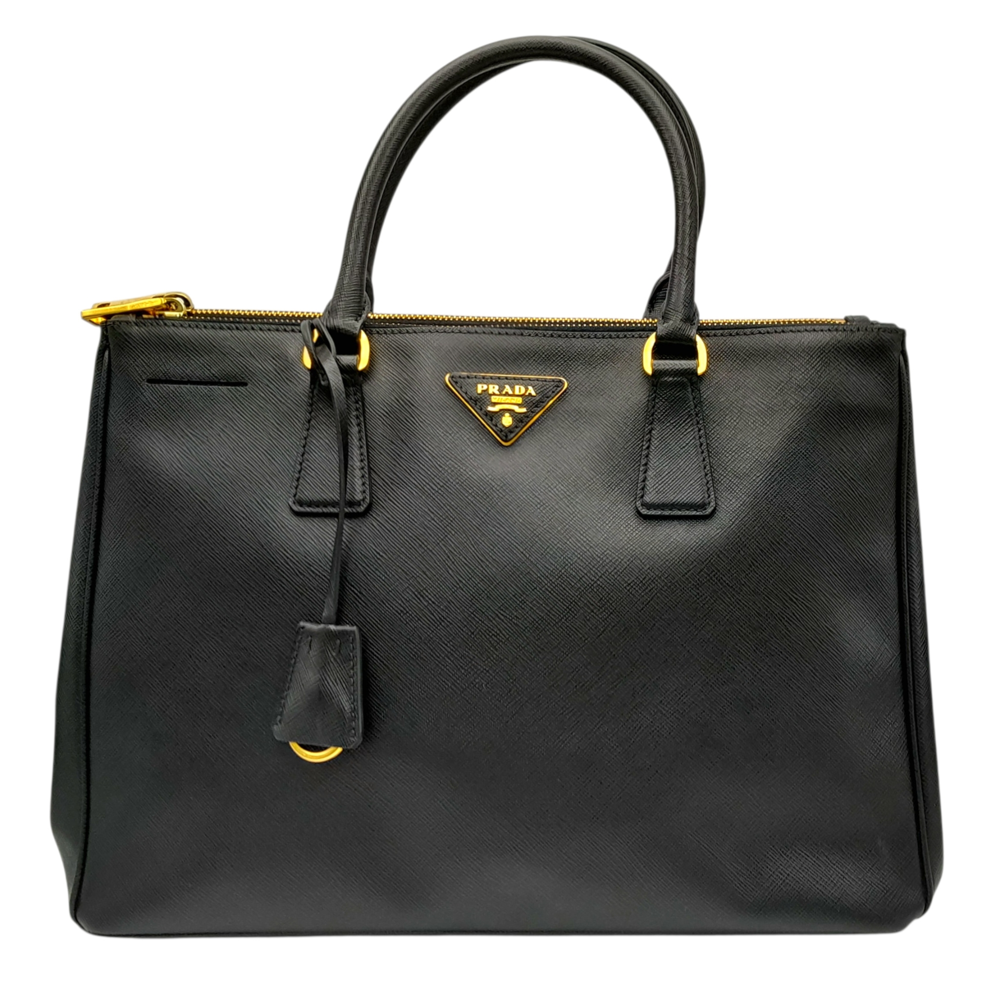 A Prada Saffiano Galleria Double Zip Tote Bag. Black Saffiano cross-grain leather exterior with gold-toned hardware, dual rolled top handles, four protective base studs, and signature Prada triangular logo plaque to the front. Double zip compartments with central open section, opening to a black Prada monogram jacquard-lined interior with three open inner side pockets and one zipped inner side pocket. Comes with certificate of authenticity. Approximate size: 34.5cm length x 24cm height x 14cm depth. A few light white marks present, otherwise in good overall condition. Please see photos for details or request a condition report. Ref: 27520