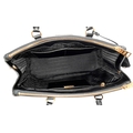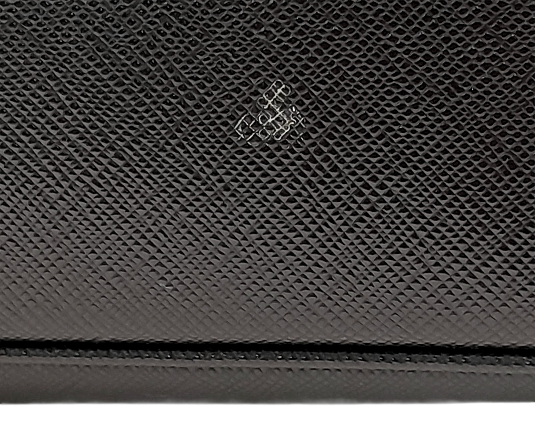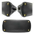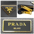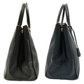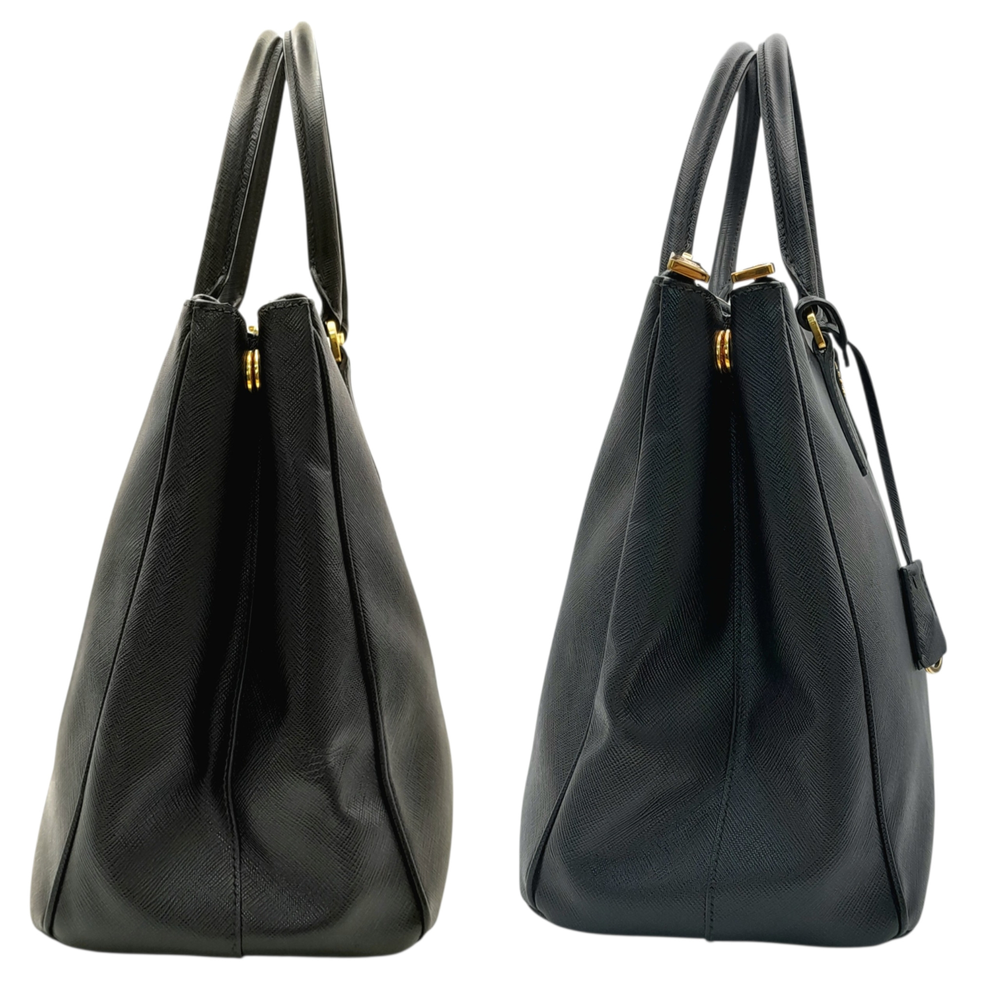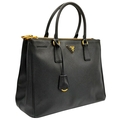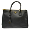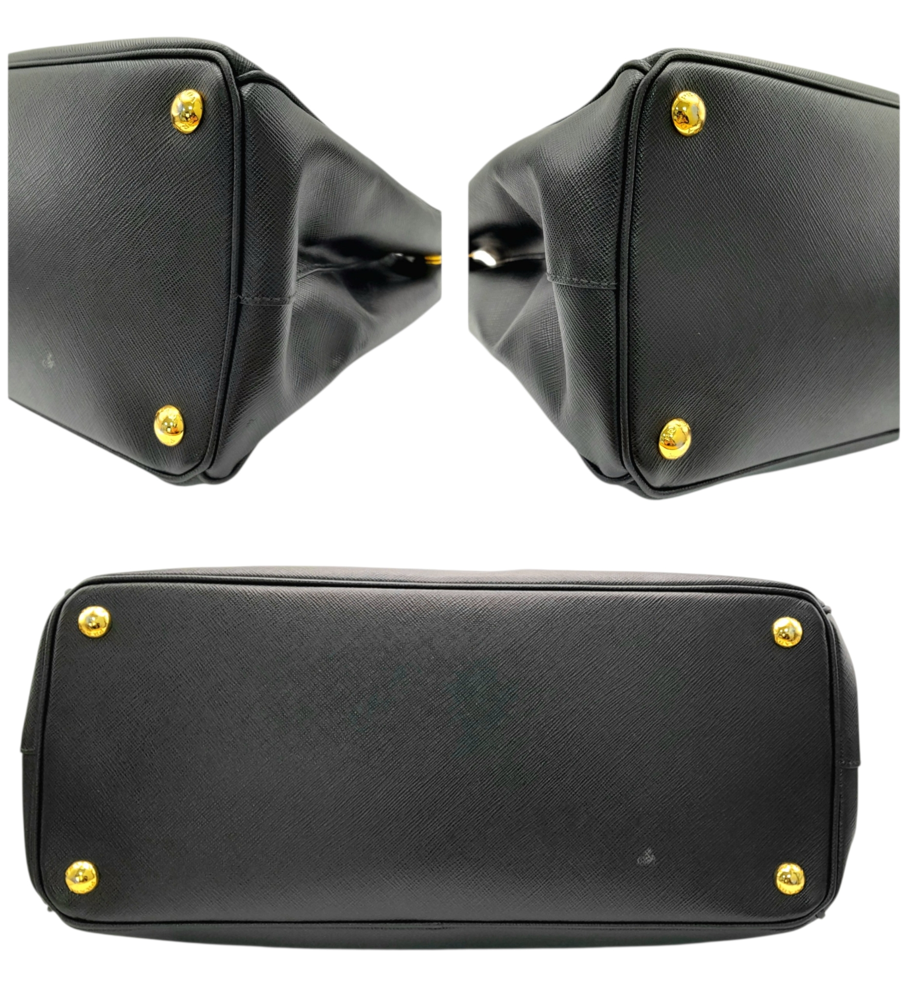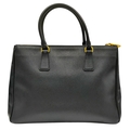 A Prada Saffiano Galleria Double Zip Tote Bag. Black Saffiano cross-grain leather exterior with gold-toned hardware, dual rolled top handles, four protective base studs, and signature Prada triangular logo plaque to the front. Double zip compartments with central open section, opening to a black Prada monogram jacquard-lined interior with three open inner side pockets and one zipped inner side pocket. Comes with certificate of authenticity. Approximate size: 34.5cm length x 24cm height x 14cm depth. A few light white marks present, otherwise in good overall condition. Please see photos for details or request a condition report. Ref: 27520