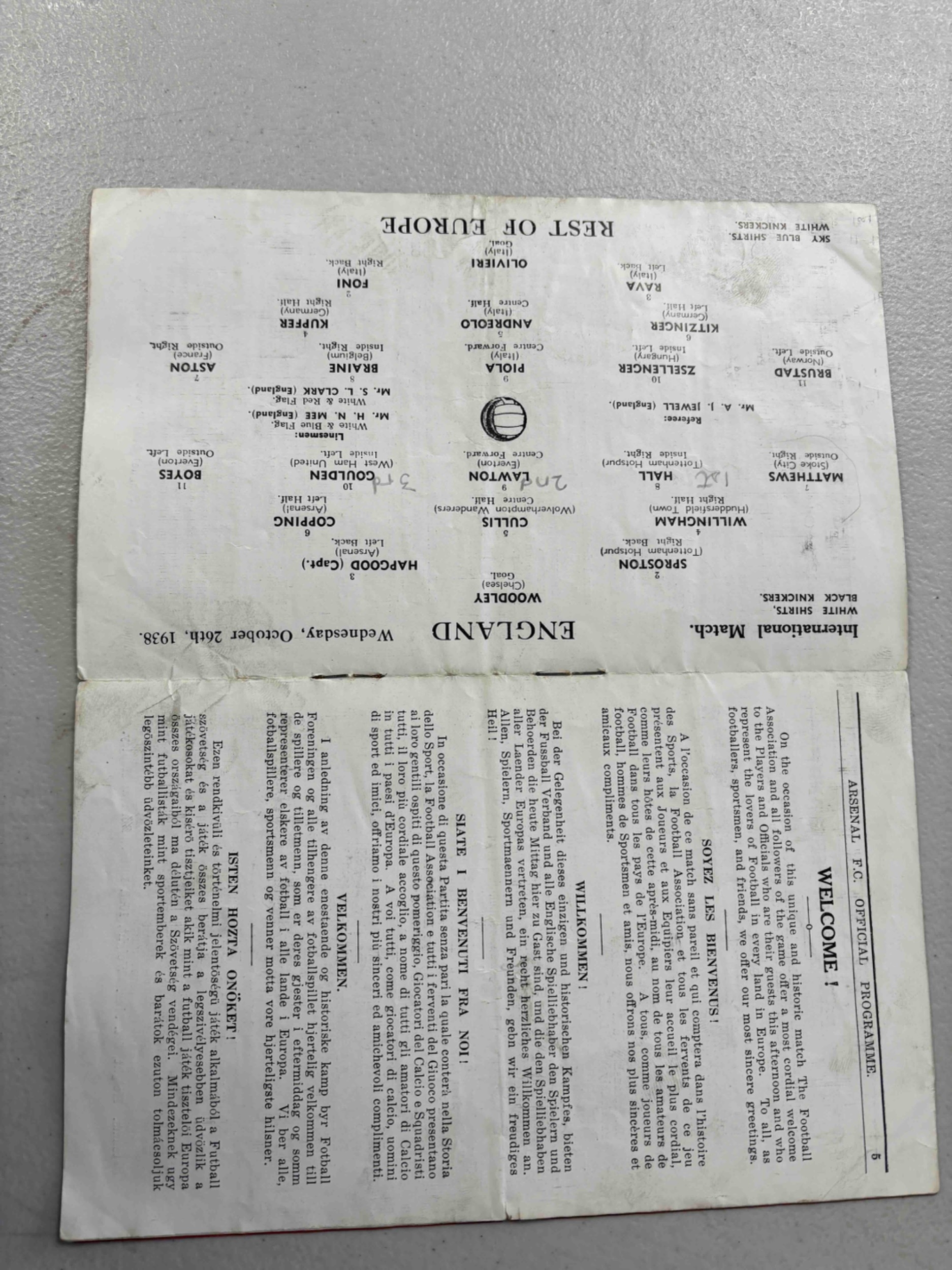 1938/39 England v Rest of Europe, 75th anniversary of the FA, Played at Arsenal. Some marks