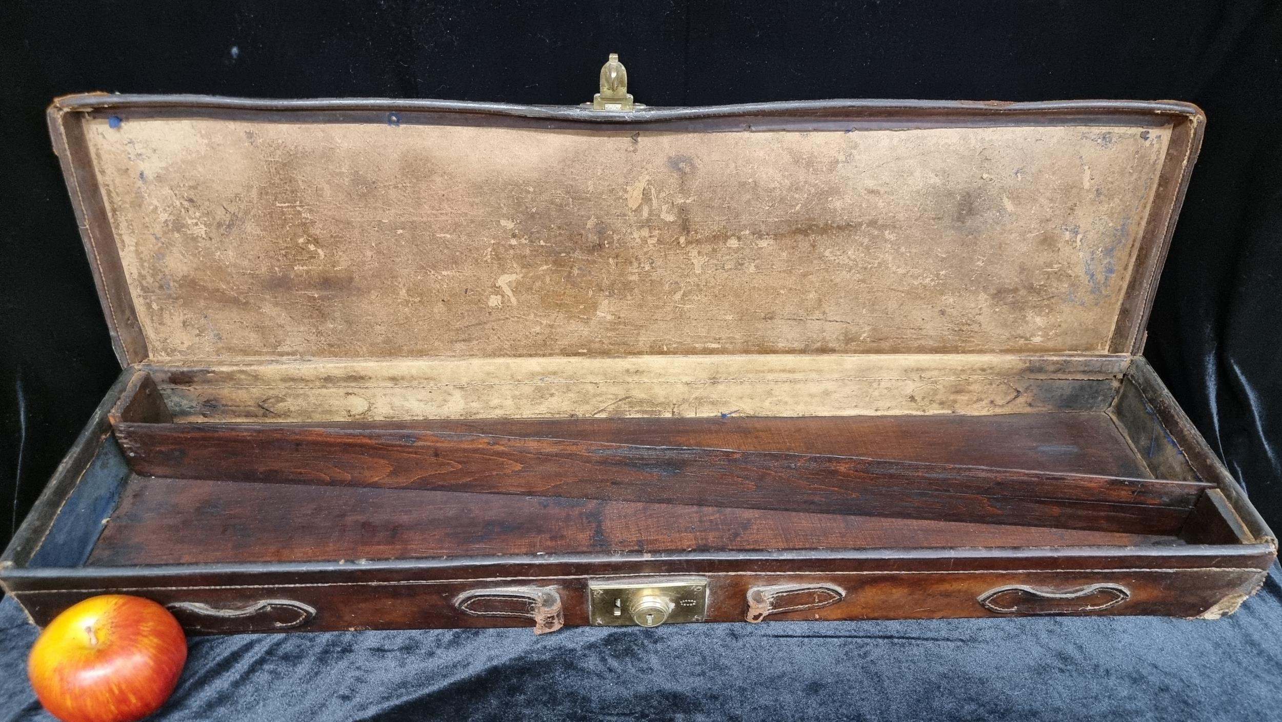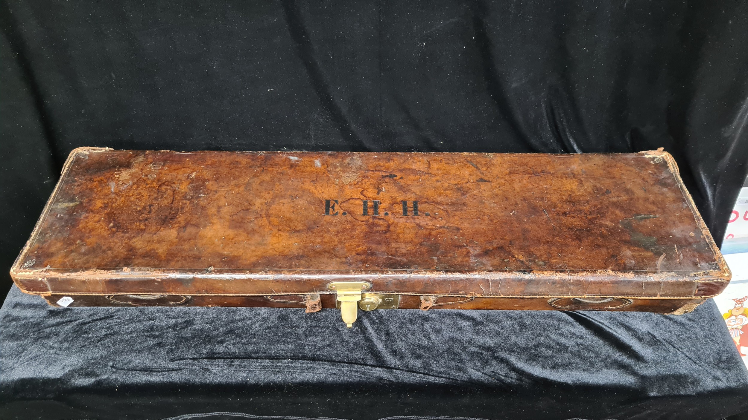 A handsome Victorian Shotgun case. With a leather exterior and brass fittings. Stenciled with the initials ''E.H.H'' With the remainder of a ''London and South Western Railway'' label (1838-1922)