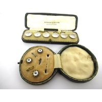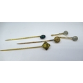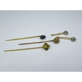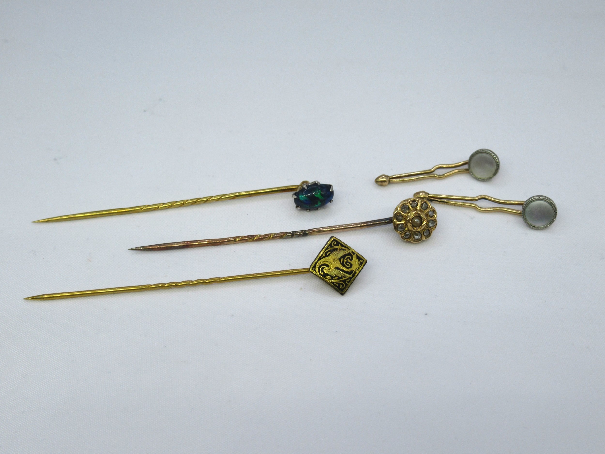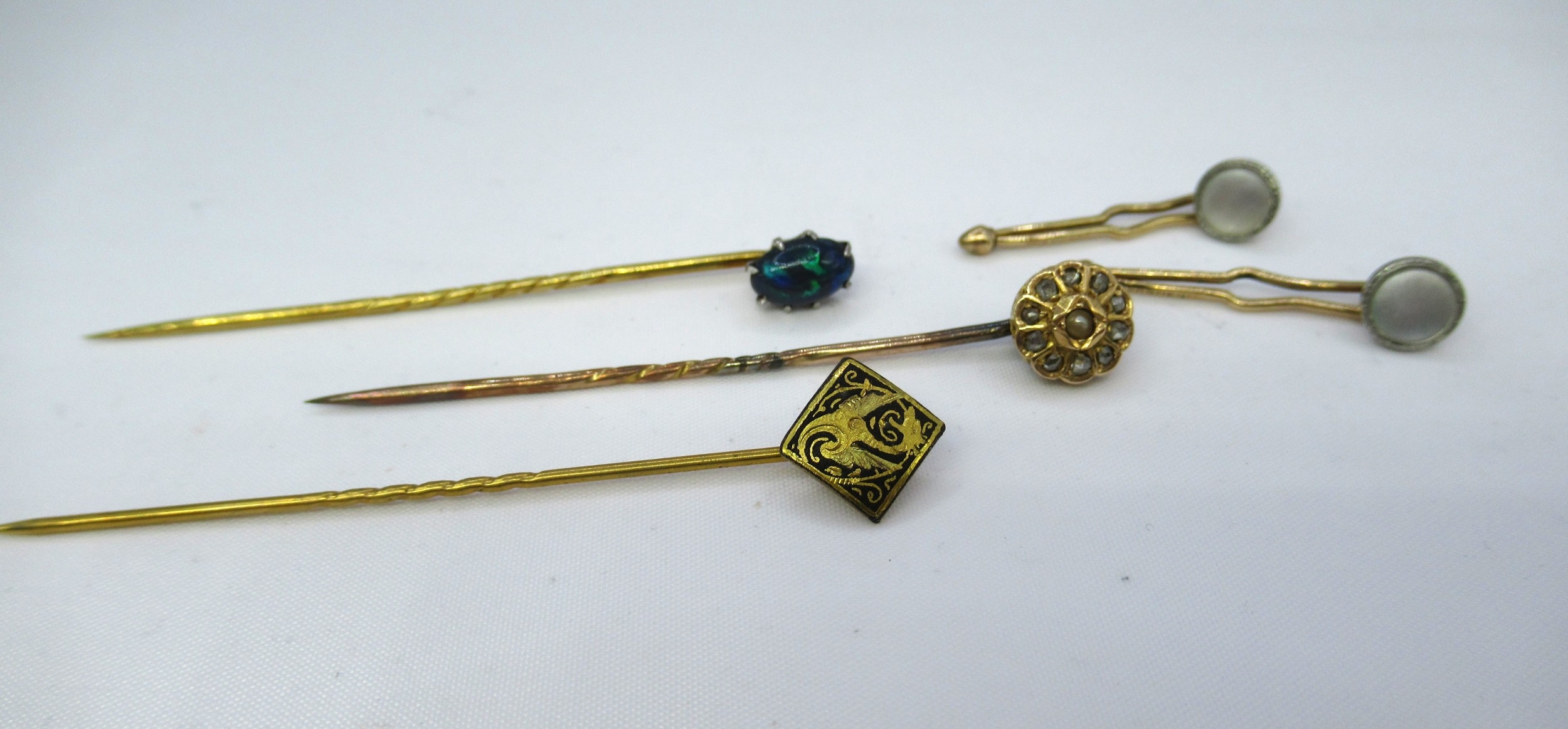 Gold black opal set stick pin, another stick pin set rose cut diamonds and seed pearl, gilt metal stick pin and a pair of collar studs
