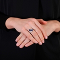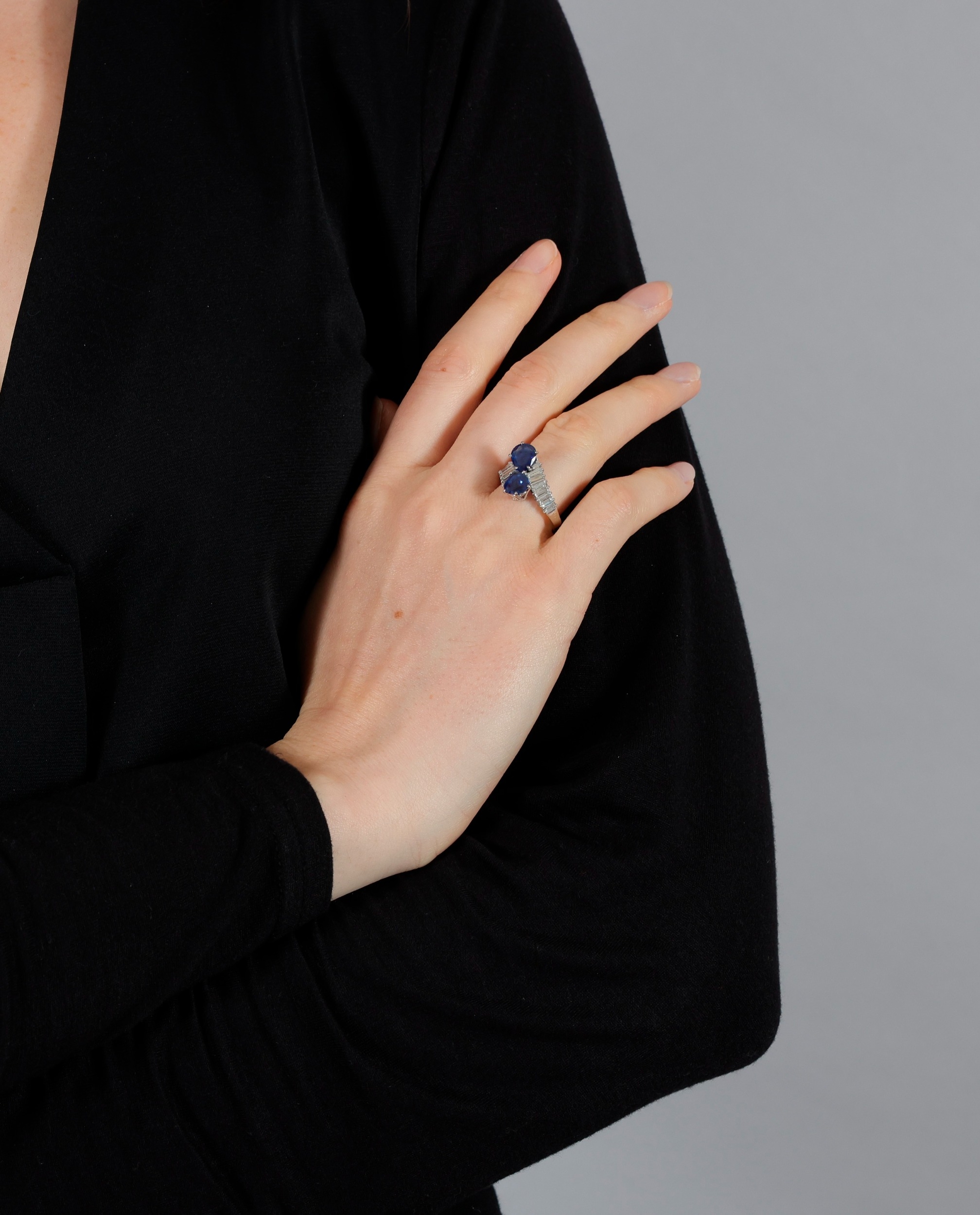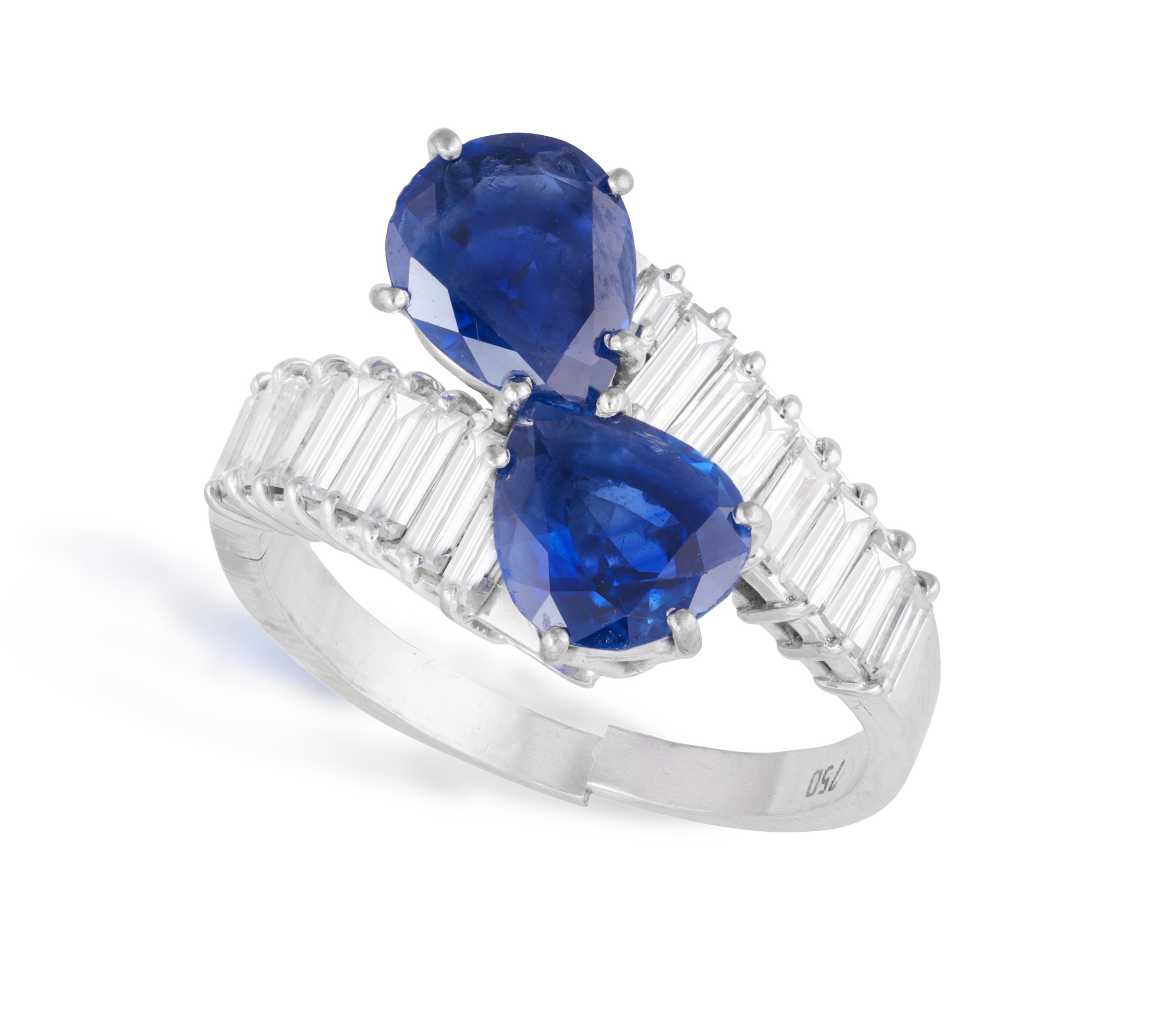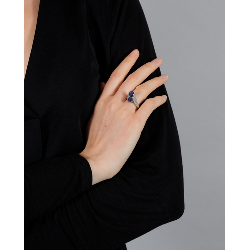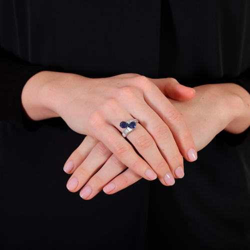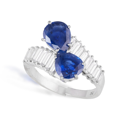 A SAPPHIRE AND DIAMOND DRESS RING Of crossover design, set with two pear-shaped sapphires weighing approximately 1.3cts and 1.5cts, to tapered shoulders set with graduated baguette-cut diamonds, mounted in 18K white gold, ring size N½ (shank open)
