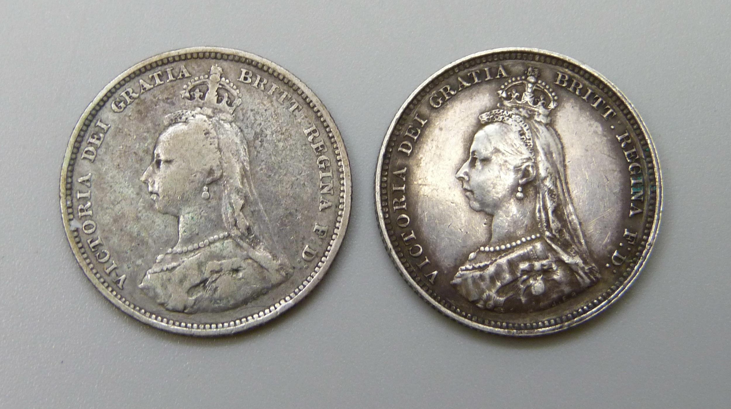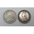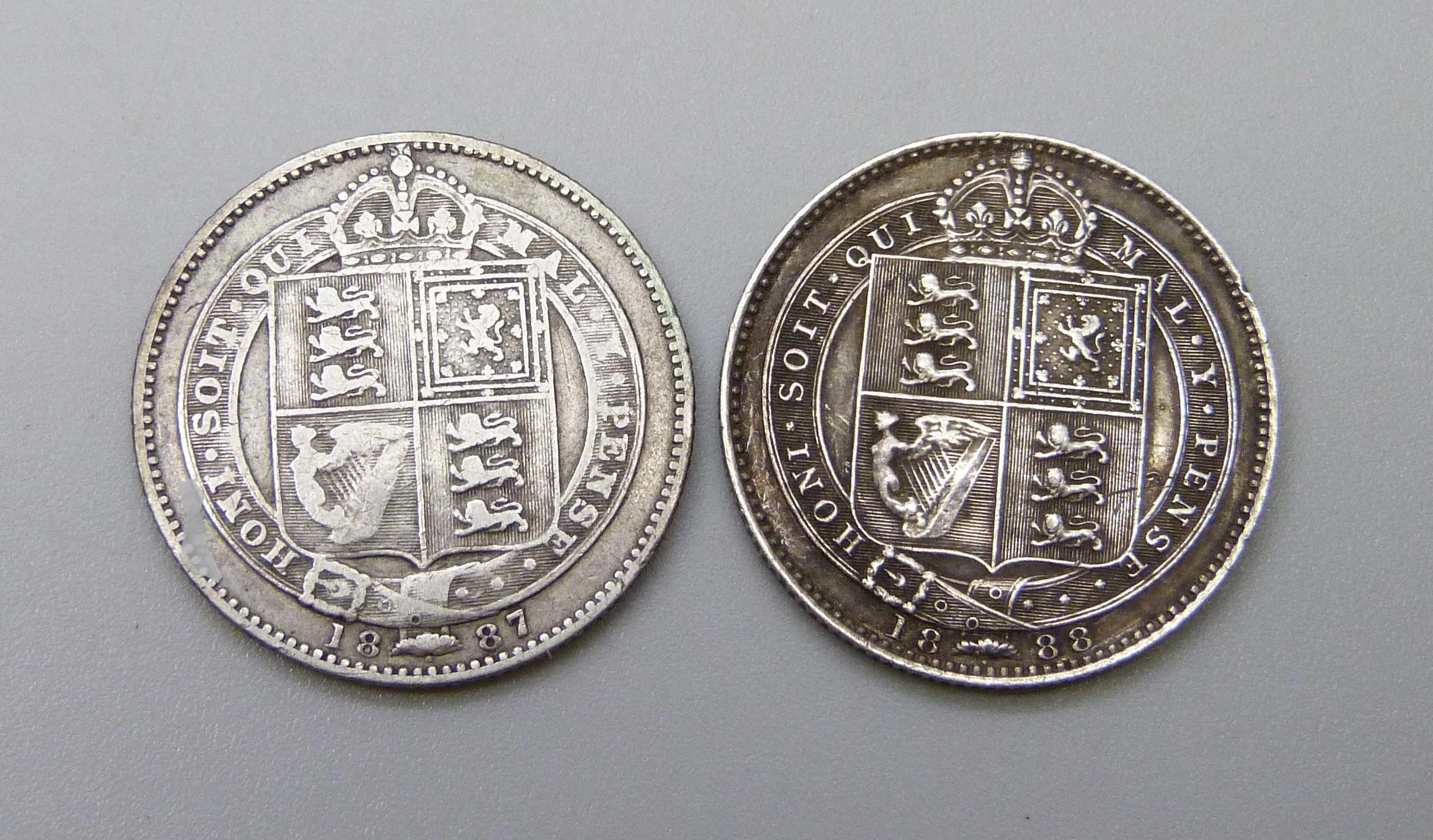 An 1887 and an 1888 shilling