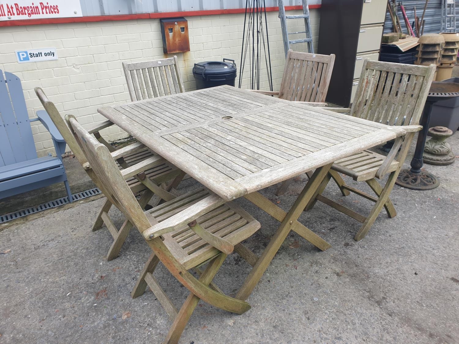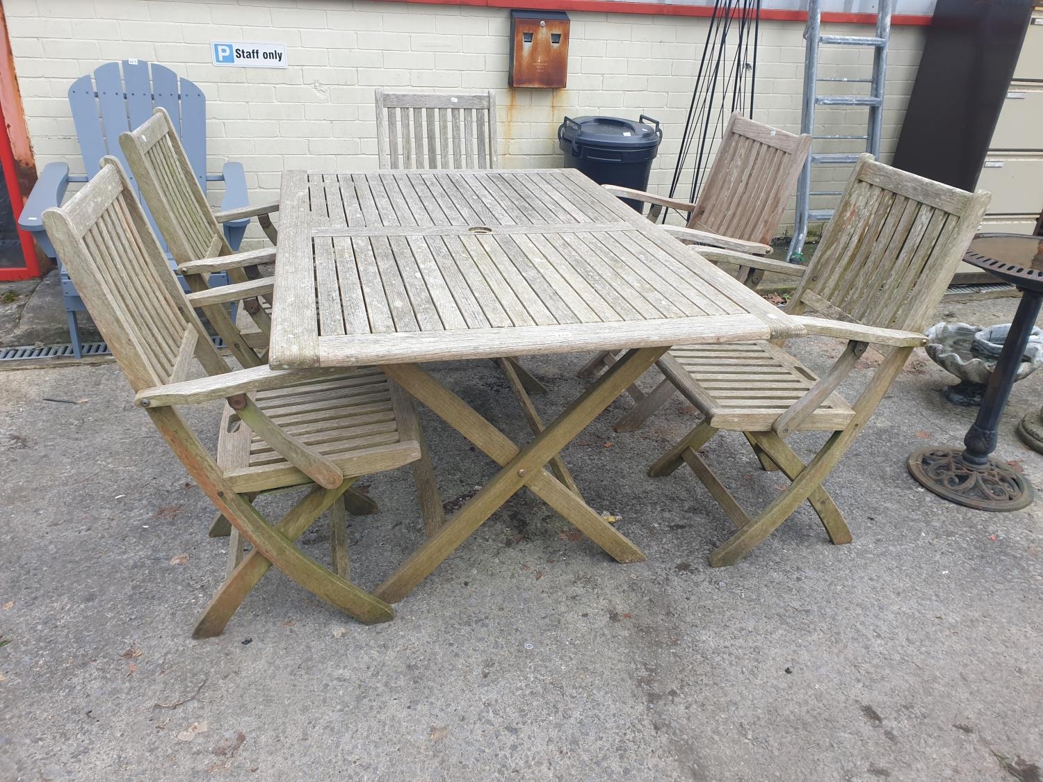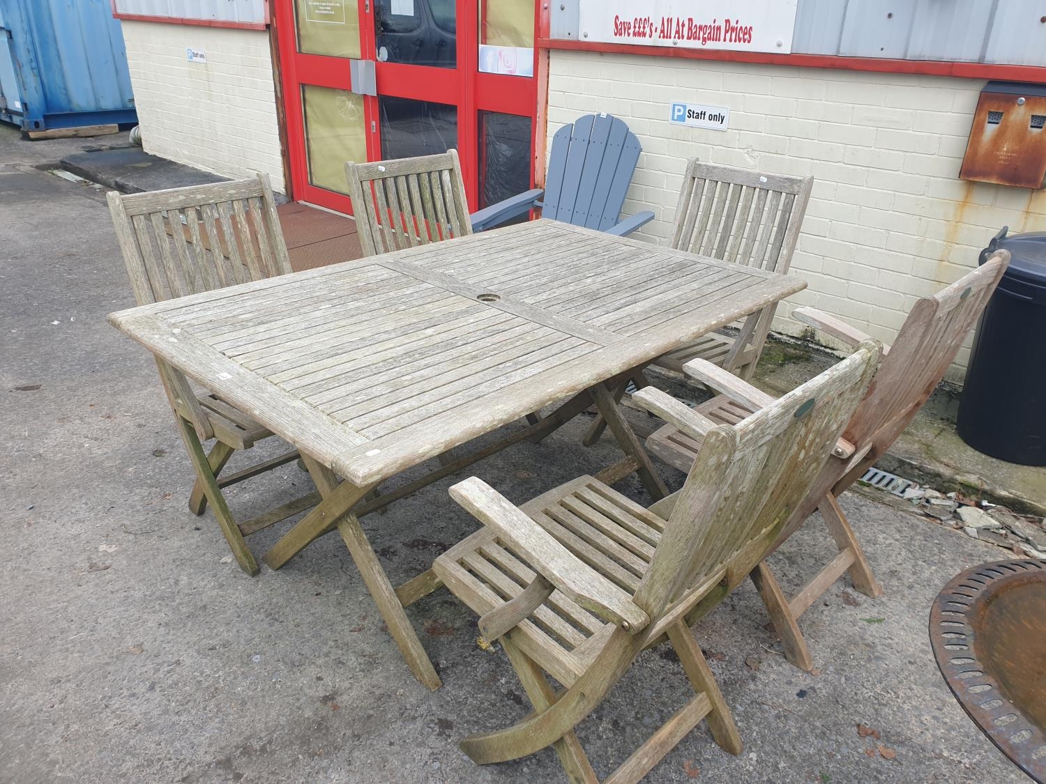 Teak Garden Table with Five Matching Folding Chairs - approx 29" tall x 39" wide x 6ft long.