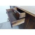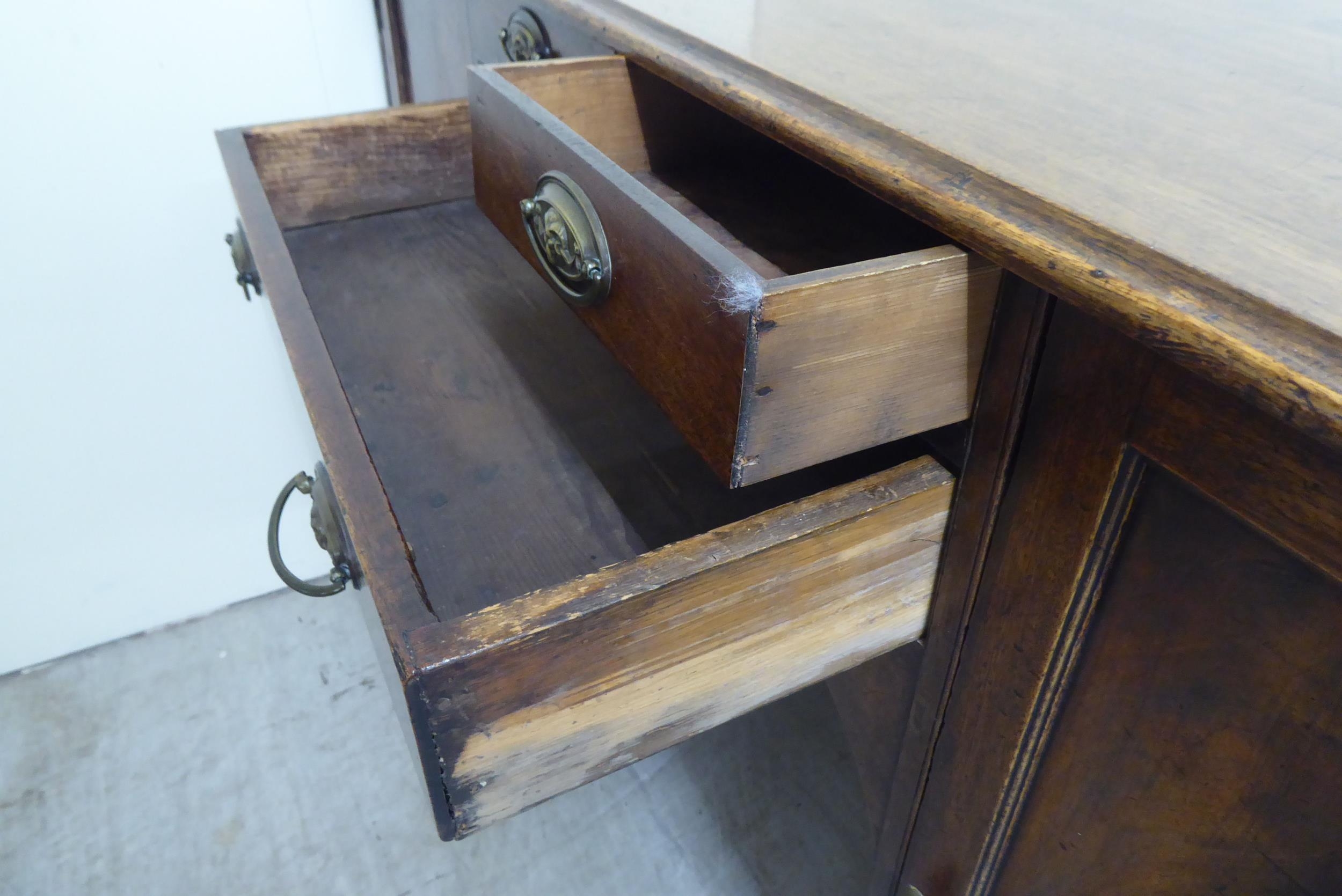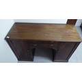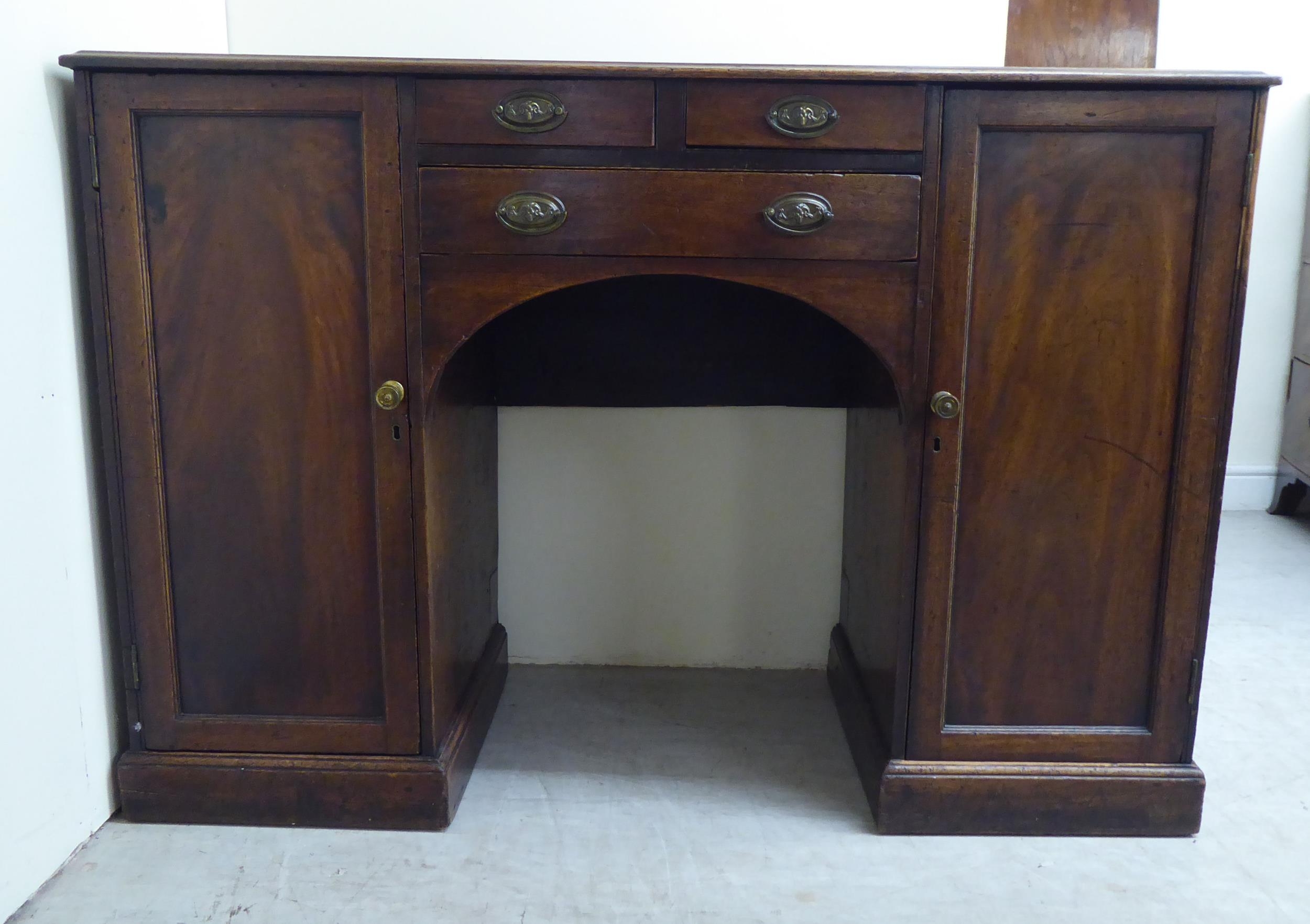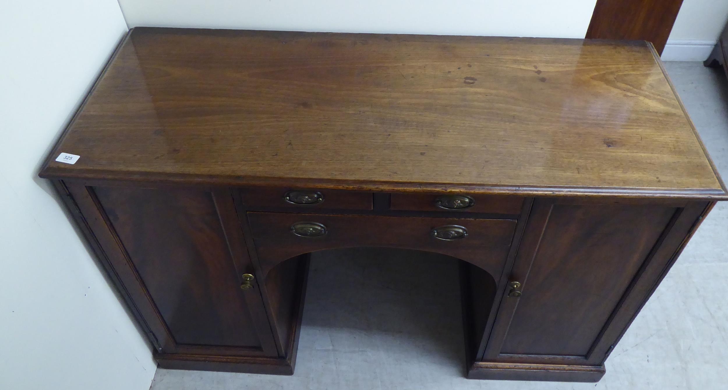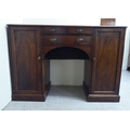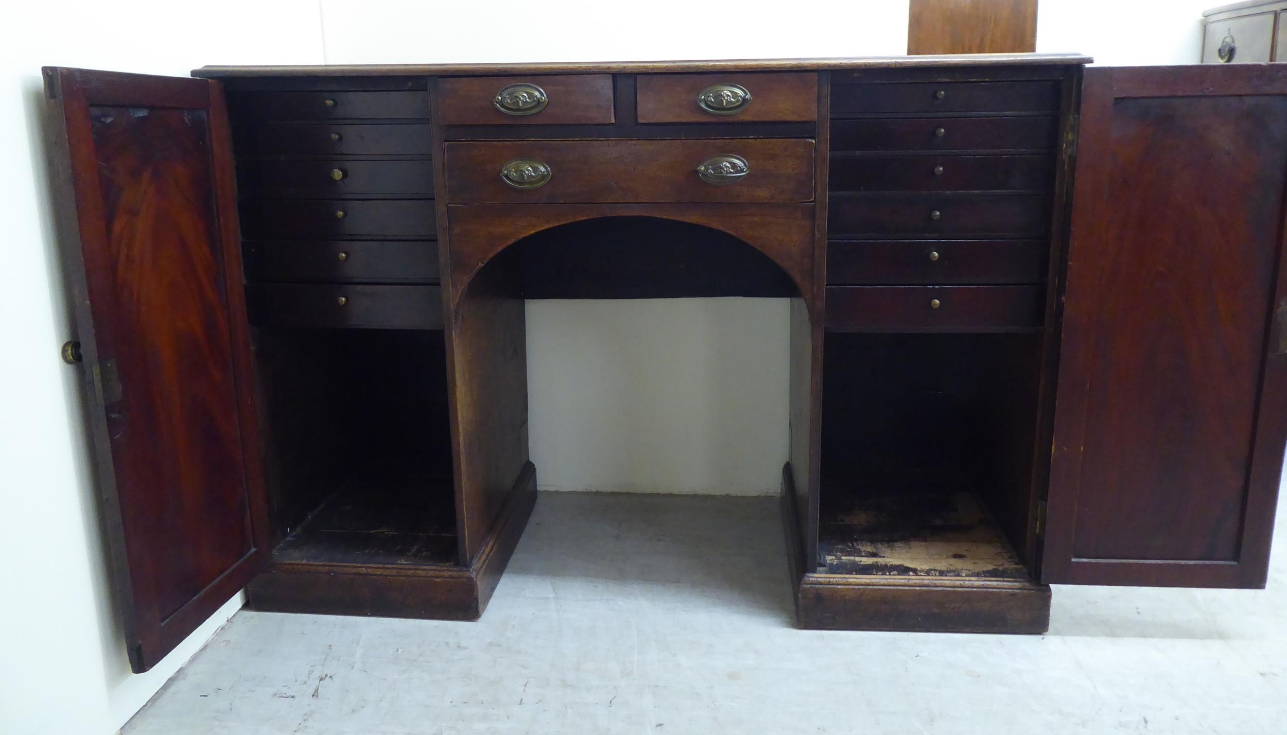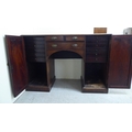 An Edwardian mahogany kneehole sideboard, comprising three central drawers and twin, full-height panelled doors, revealing a series of short drawers 34"h 48"w