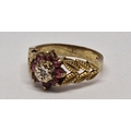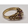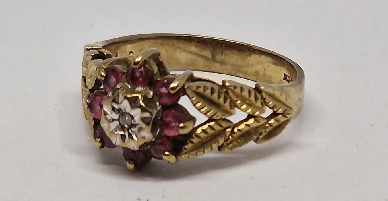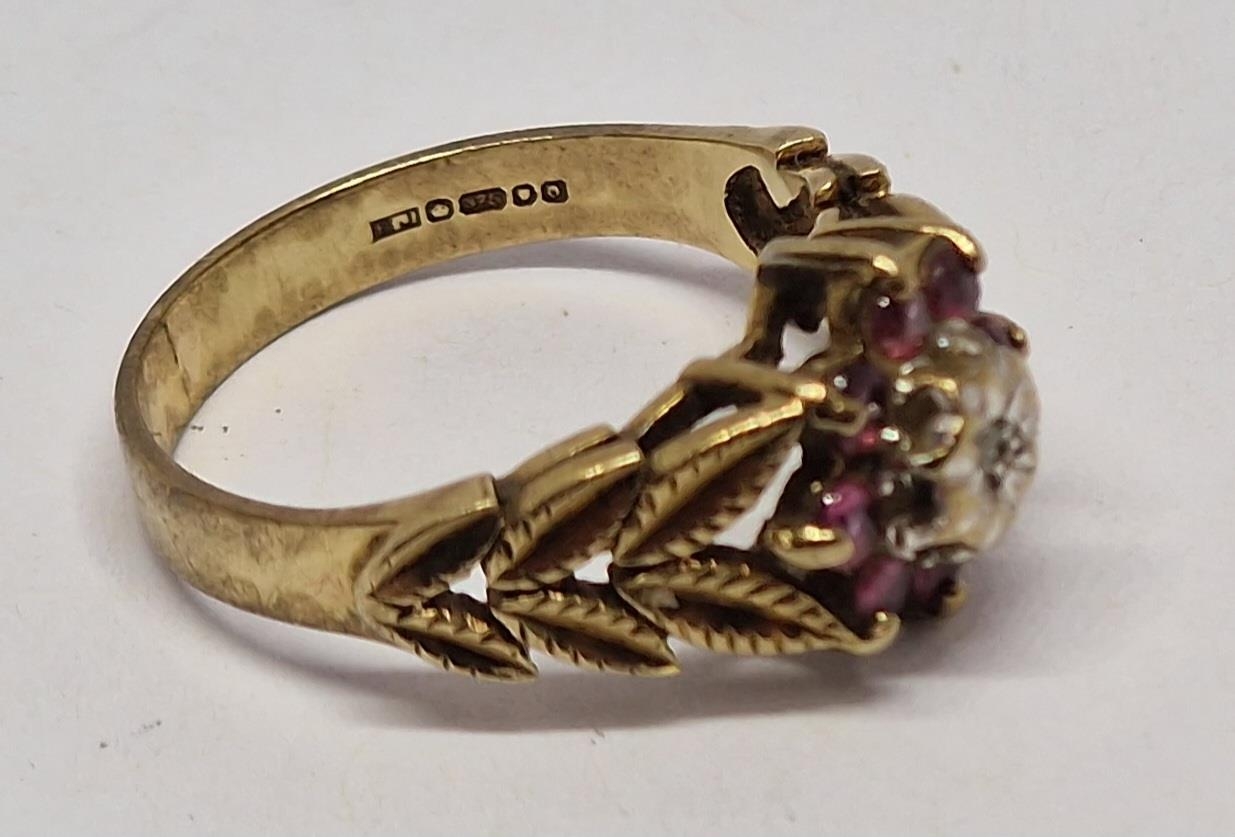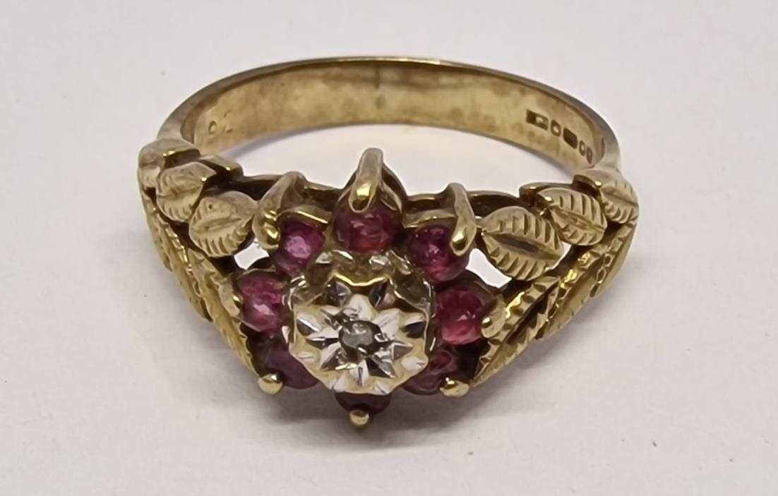 9 CARAT GOLD RING WITH LEAF DESIGN TO SHOULDERS SET SOLITAIRE DIAMOND AND 8 RUBIES - SIZE L (2.6g)