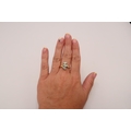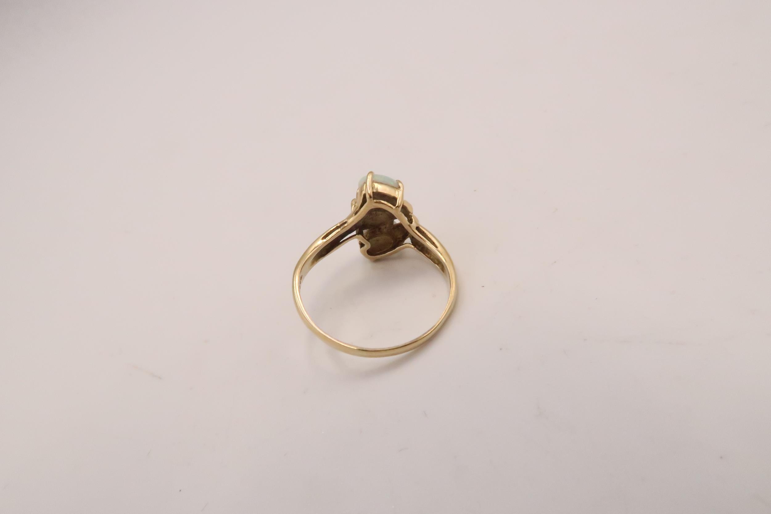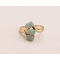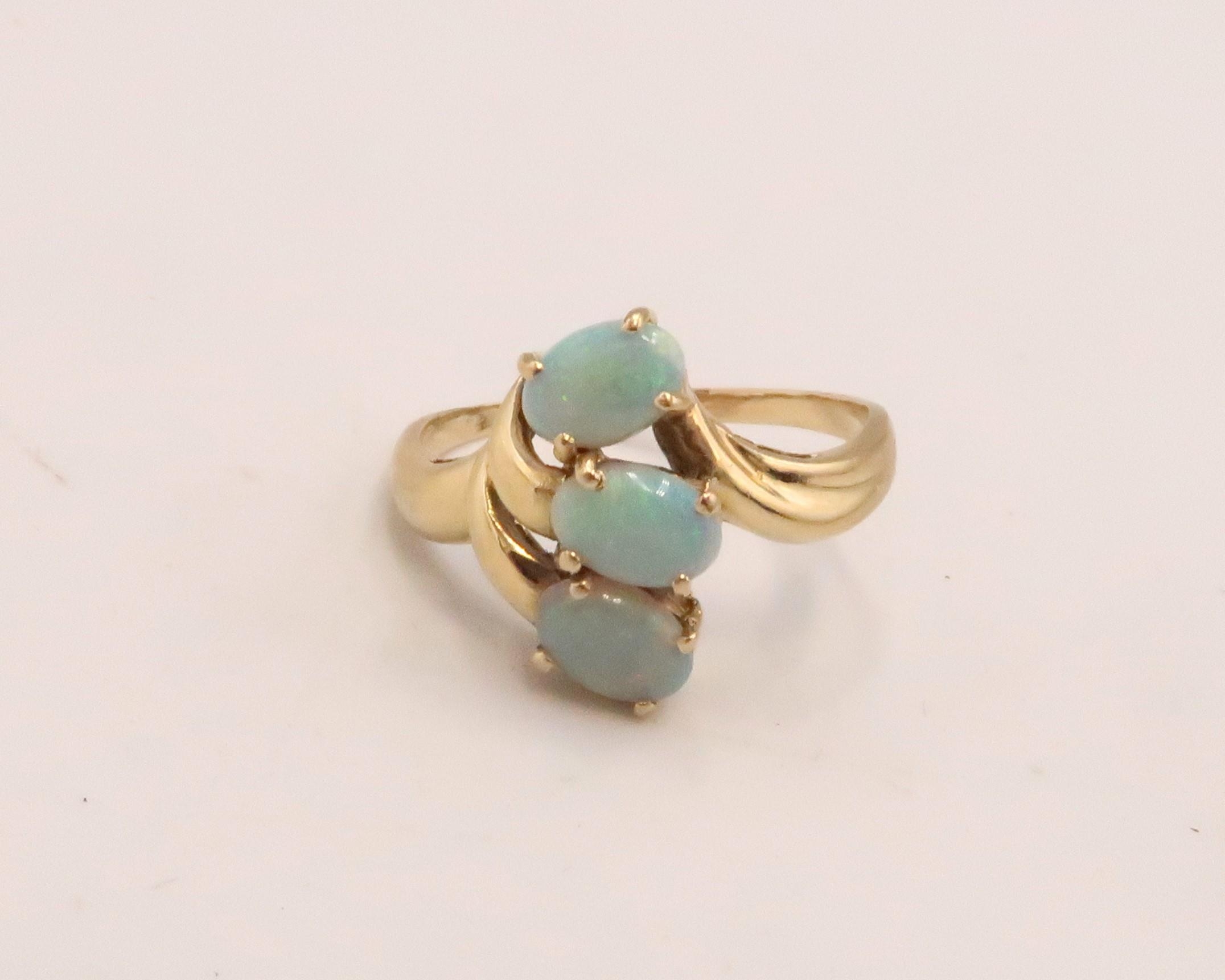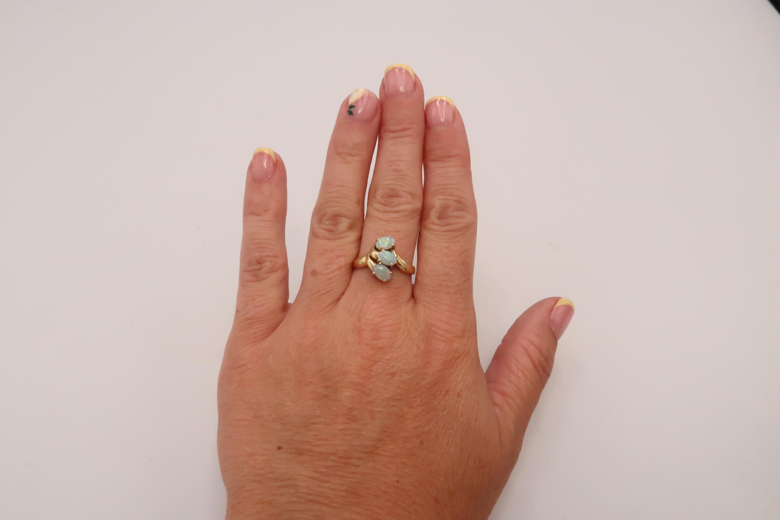 An 18ct gold and opal three stone ring, the opals set in organic fanned form, of good colour and movement, likely Australian, ring size O, 3.6g.