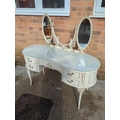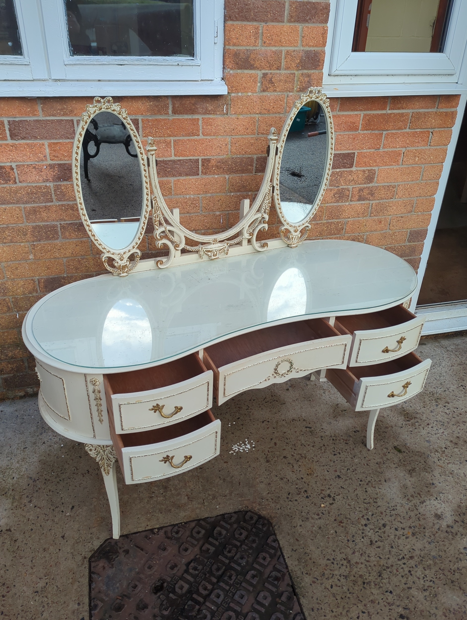 This elegant dressing table features a graceful curved design complemented by a triple oval mirror setup. It includes multiple drawers with decorative handles and intricate detailing, offering both functionality and style. Perfect for a classic bedroom setting, the piece combines a creamy colour palette with subtle gold accents.