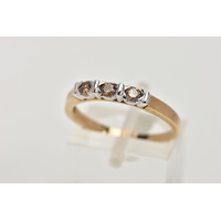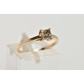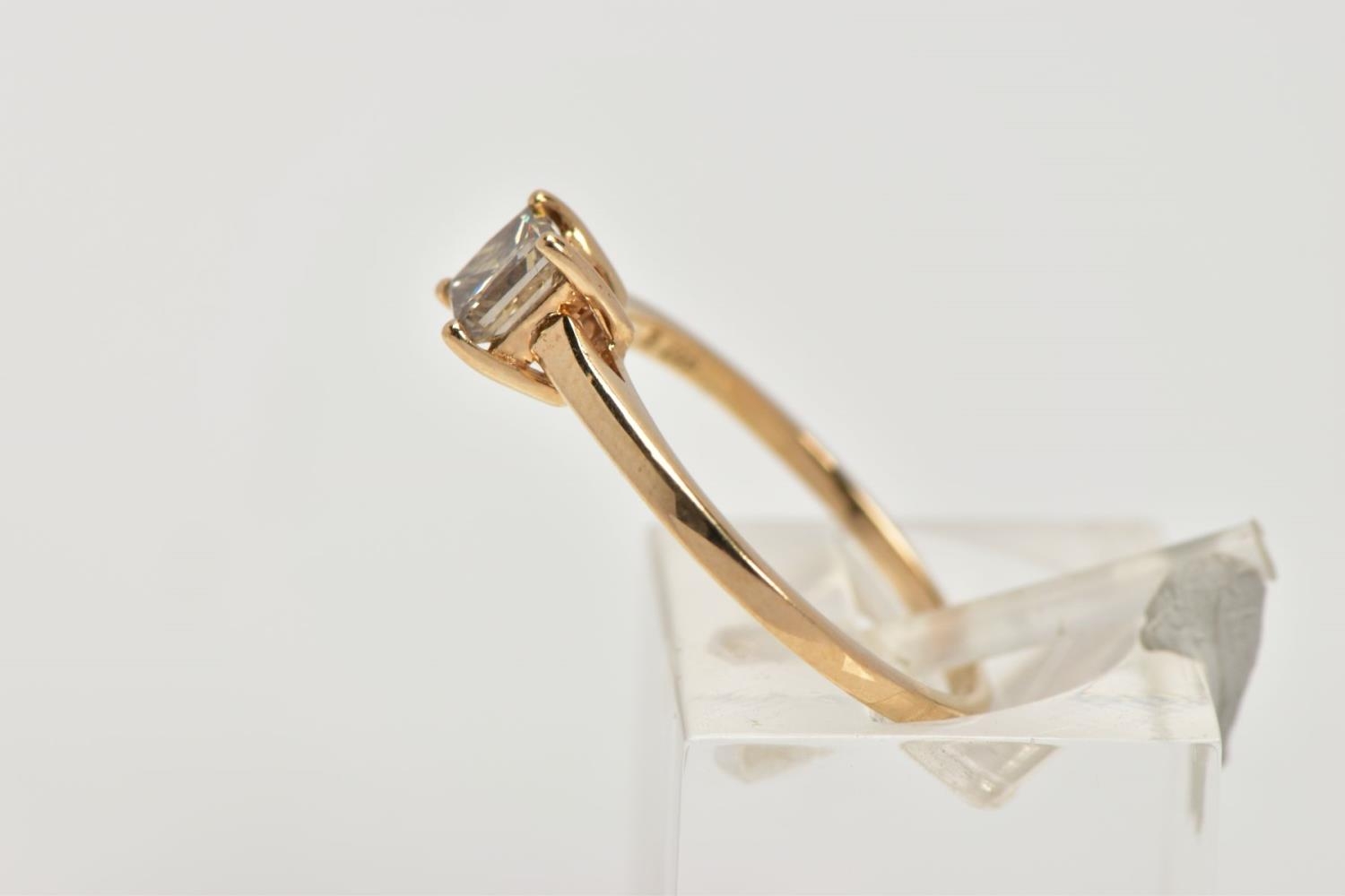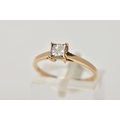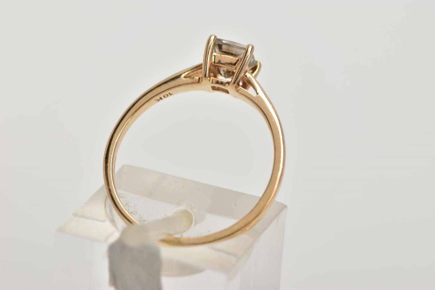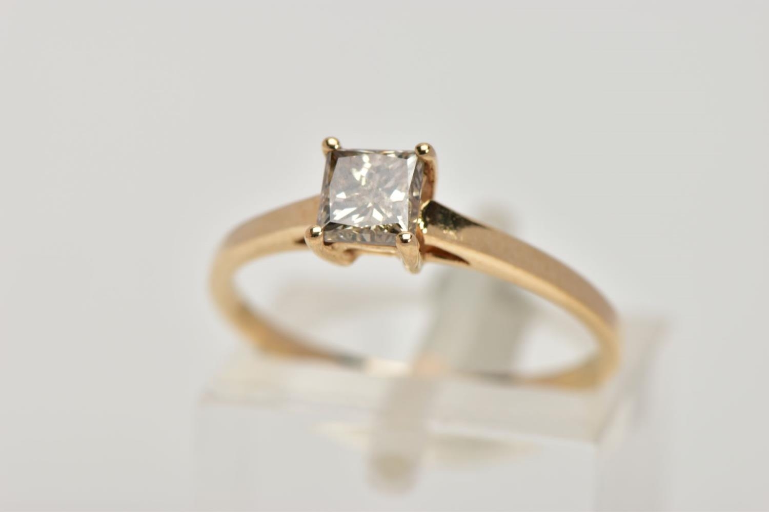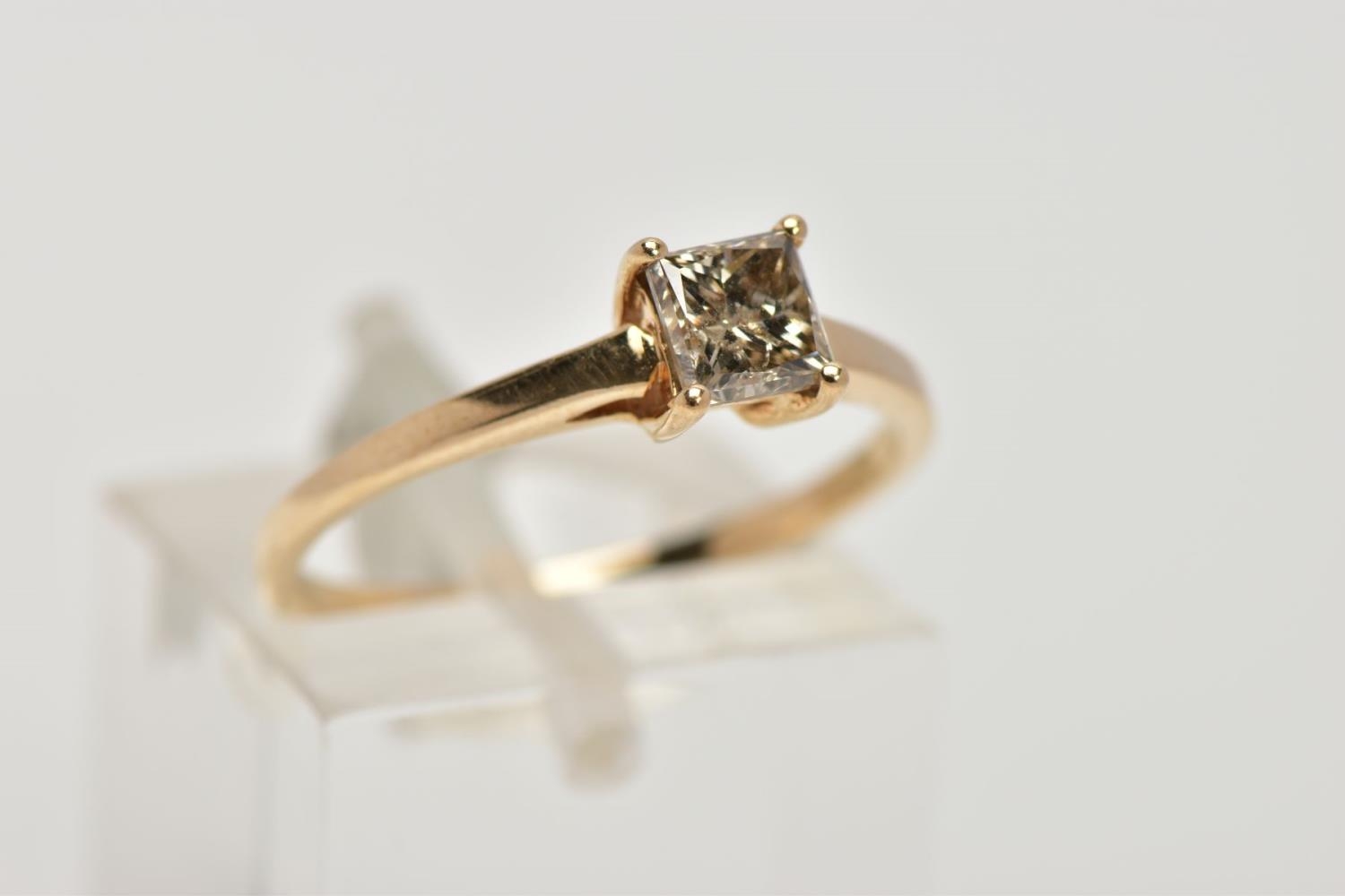 A SINGLE STONE DIAMOND RING, yellow metal ring , designed with a four claw set, princess cut diamond, approximate diamond weight 0.40cts, colour assessed as tinted (champagne colour) clarity assessed as I1, plain polished band stamped '10k', ring size L, approximate gross weight 1.4 grams (condition report: general light wear, diamond has a small chip to the girdle/pavilion, mount and shank in good condition)