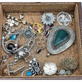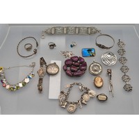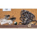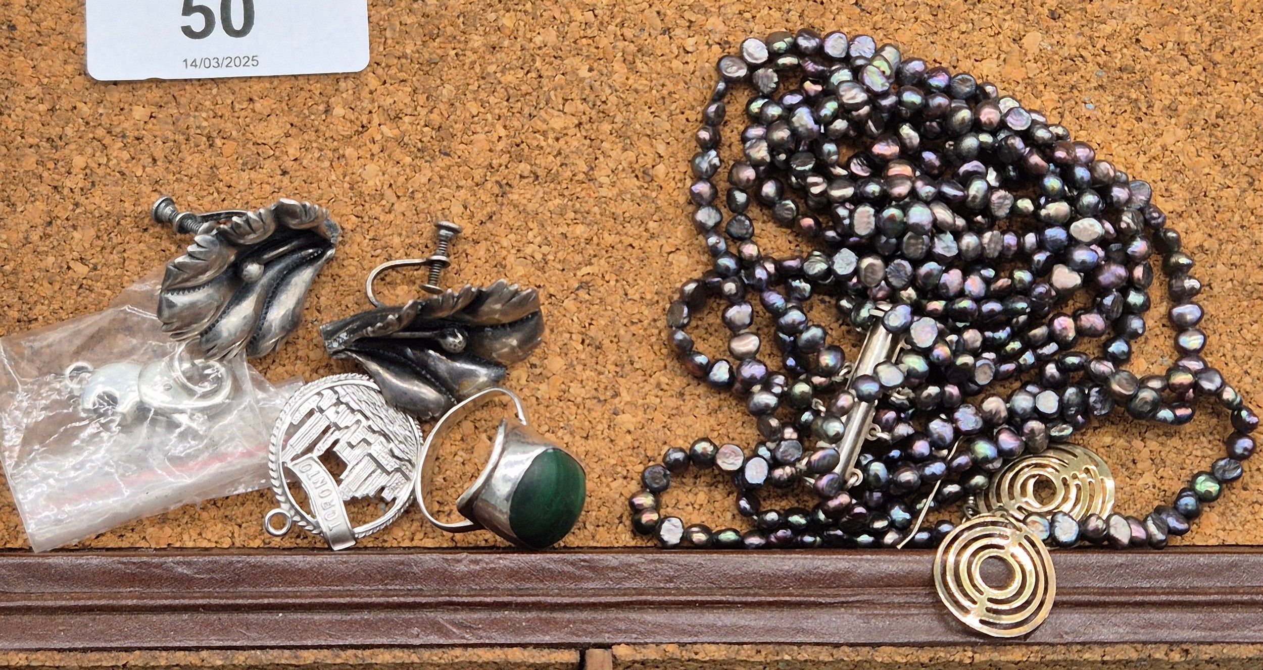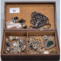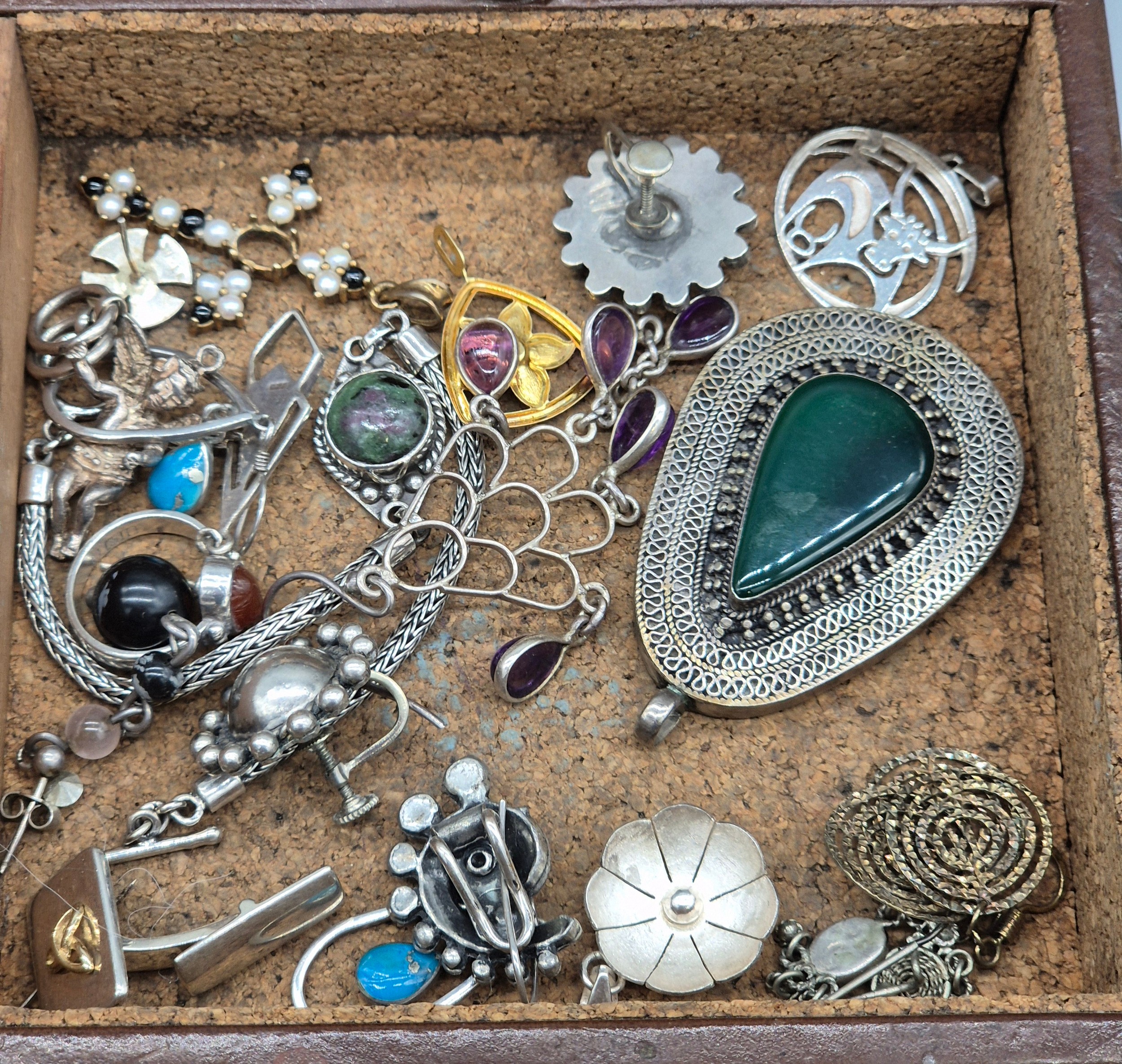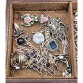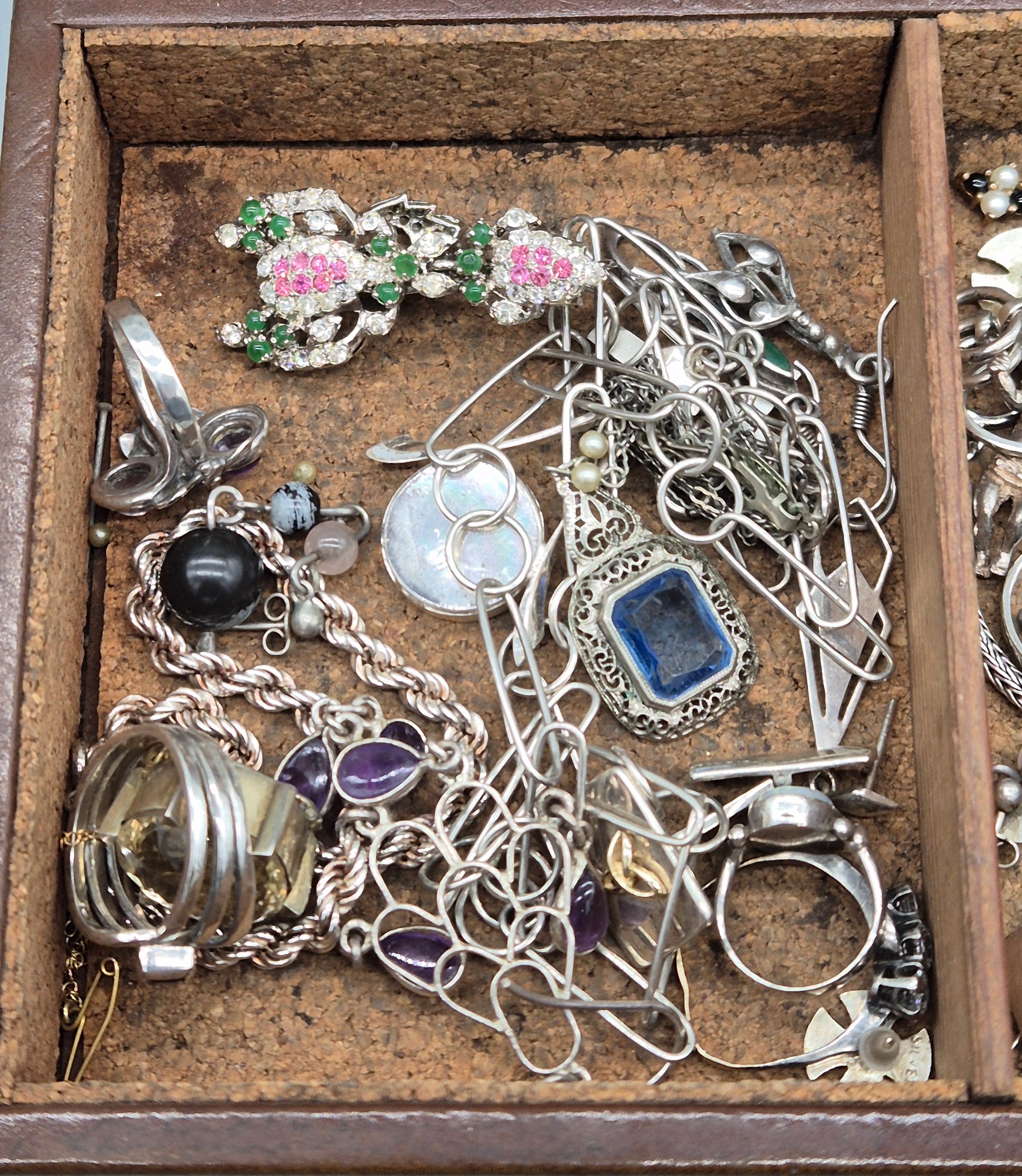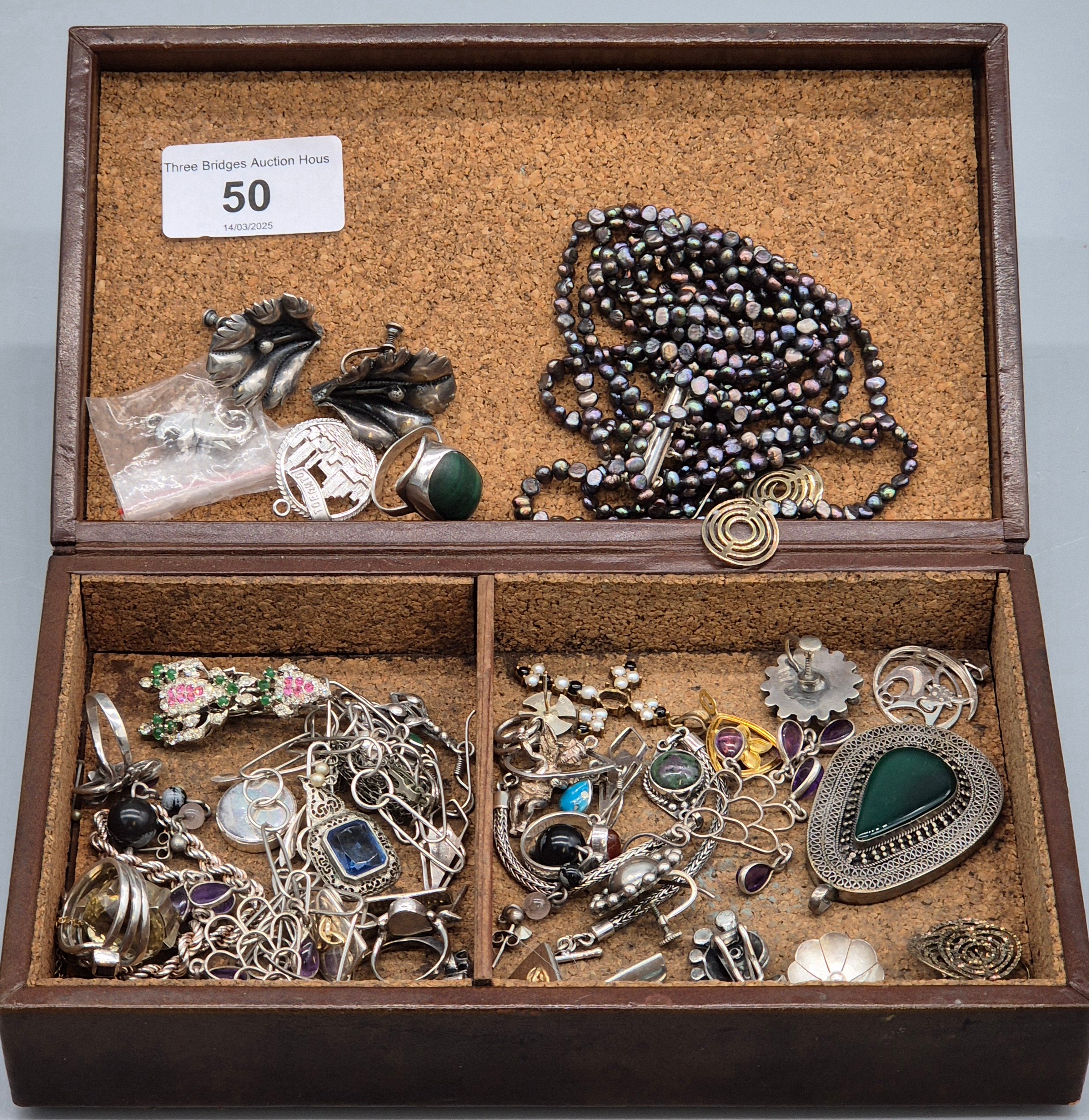 Leather jewellery box containing mixed silver jewellery; Black pearl eight strand bracelet, Silver Rings, earrings and so much more.