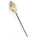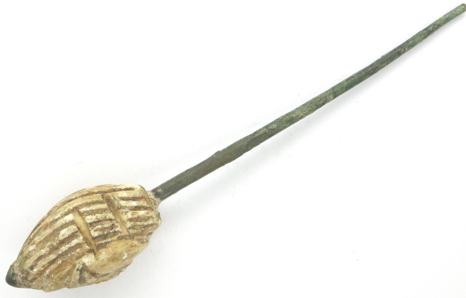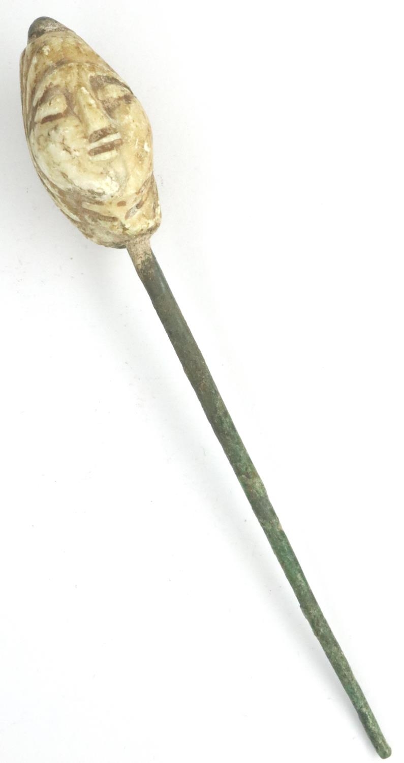 Bronze Age Eastern hair pin with religious deity, L: 120 mm. P&P Group 0 (£5+VAT for the first lot and £1+VAT for subsequent lots)