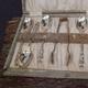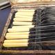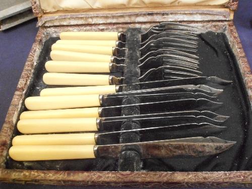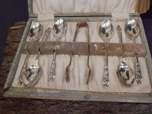 BOXED SET OF SIX APOSTLE SPOONS AND SUGAR TONGS WITH BOXED SET OF 6 FIRTH BREARLEY FISH KNIVES AND FORKS