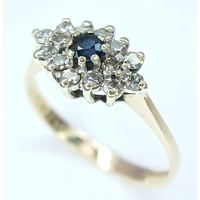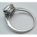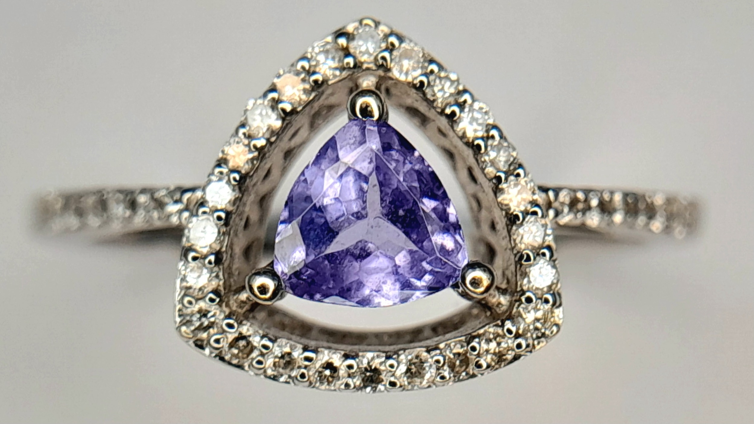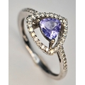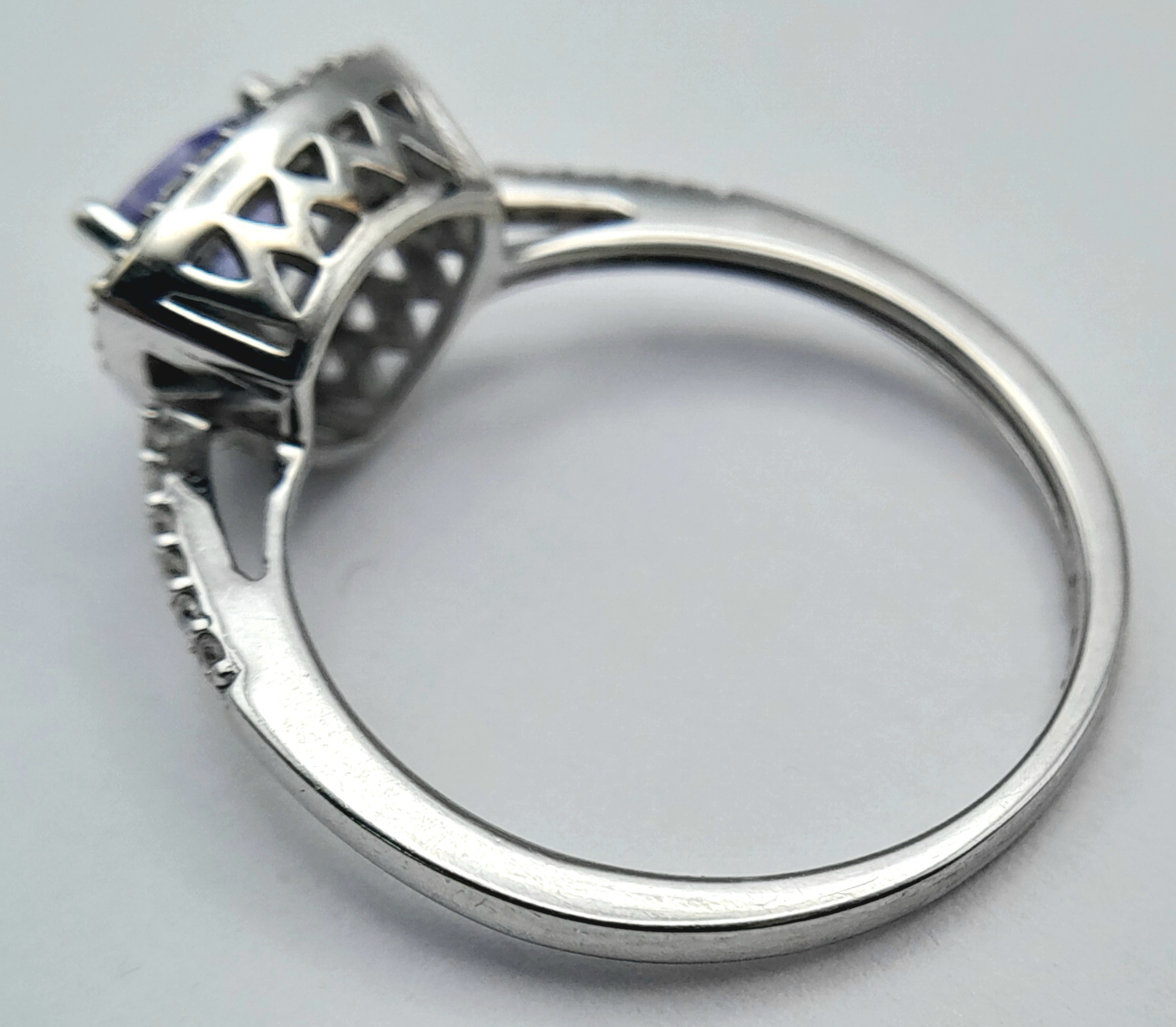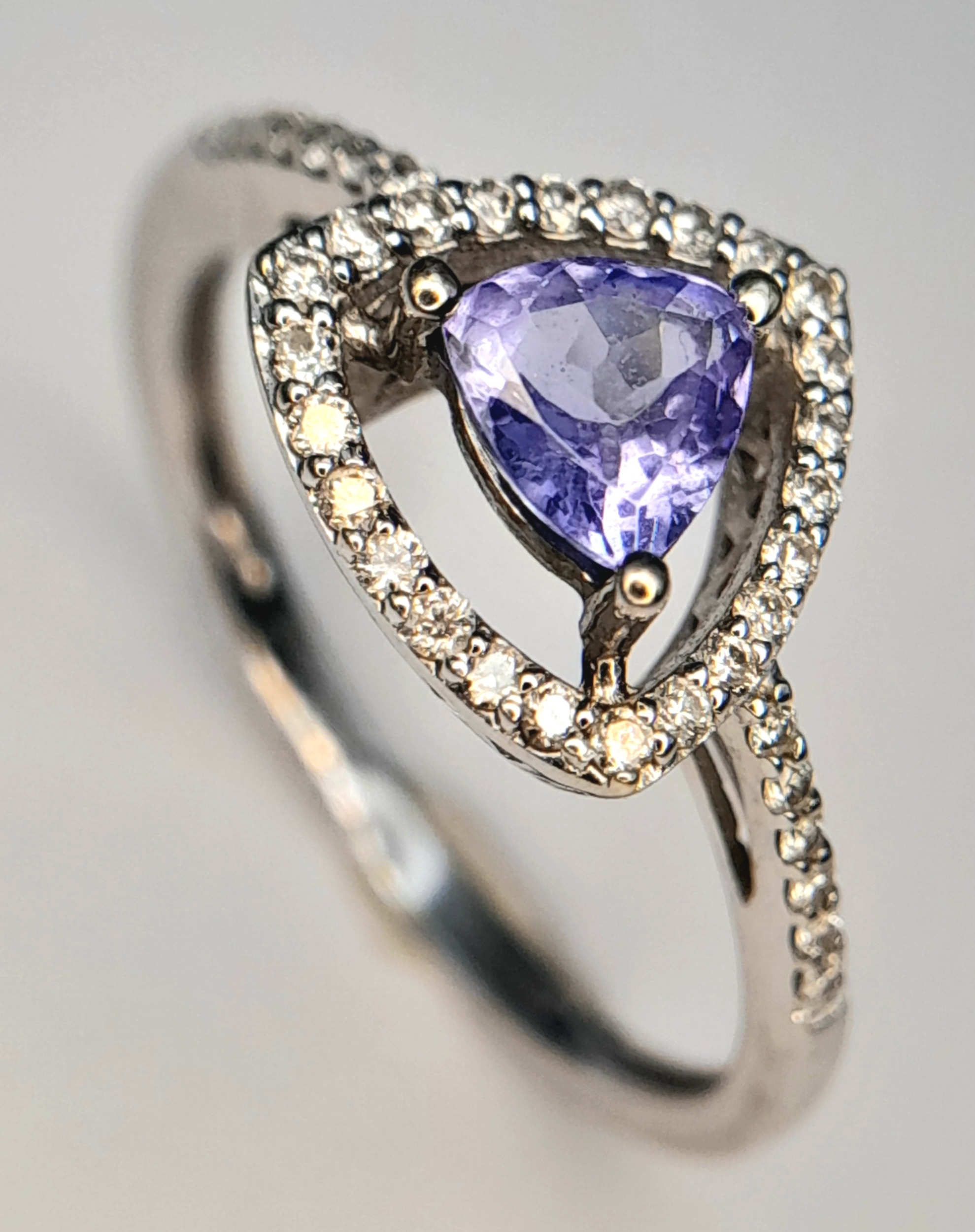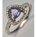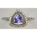 An Attractive 9 Carat White Gold Tanzanite and Diamond Set Ring Size O. The Ring is set with a 5mm Trillion Cut Tanzanite with Thirty-Six Round Cut Diamonds Set into the crown and upper shank (Diamond weight approximately 0.18 Carats Total). Gross weight 2.23 Grams.