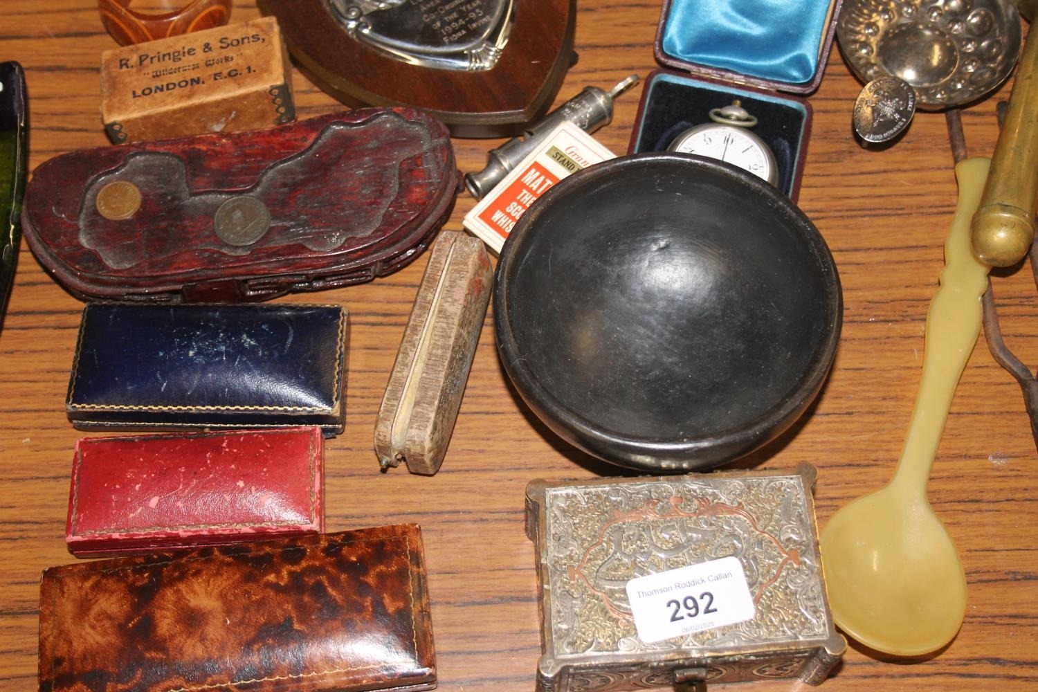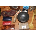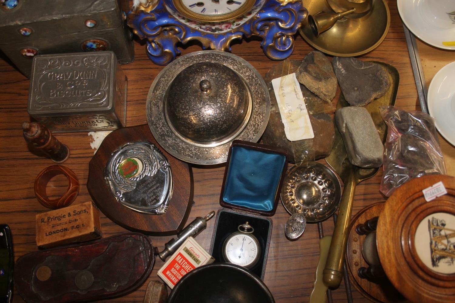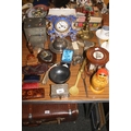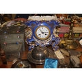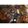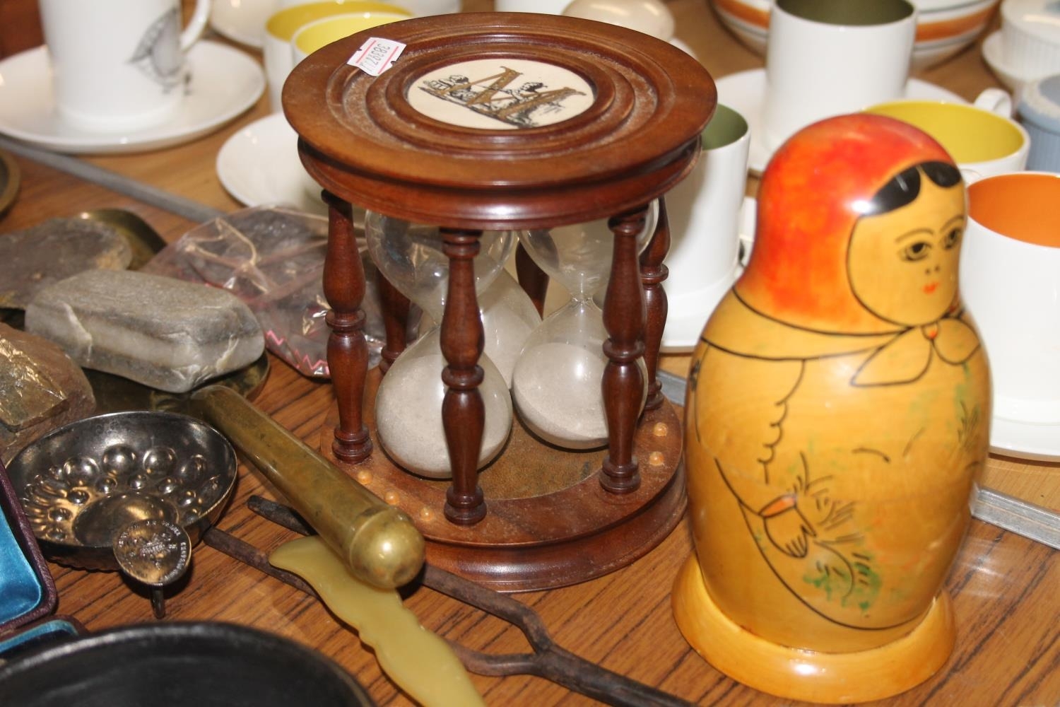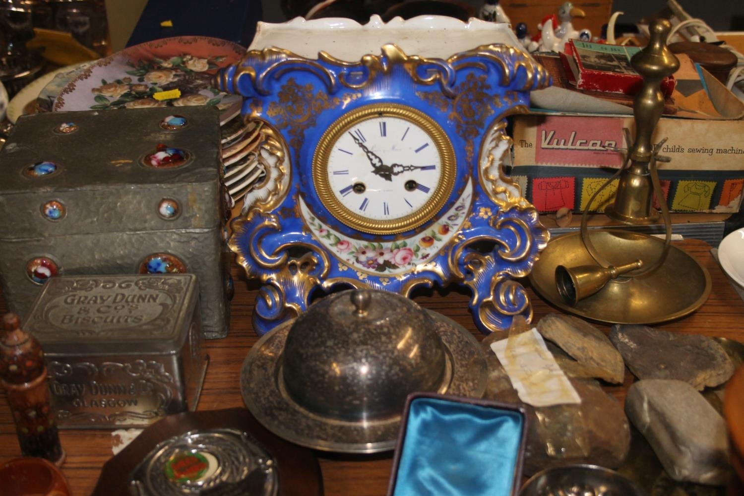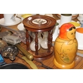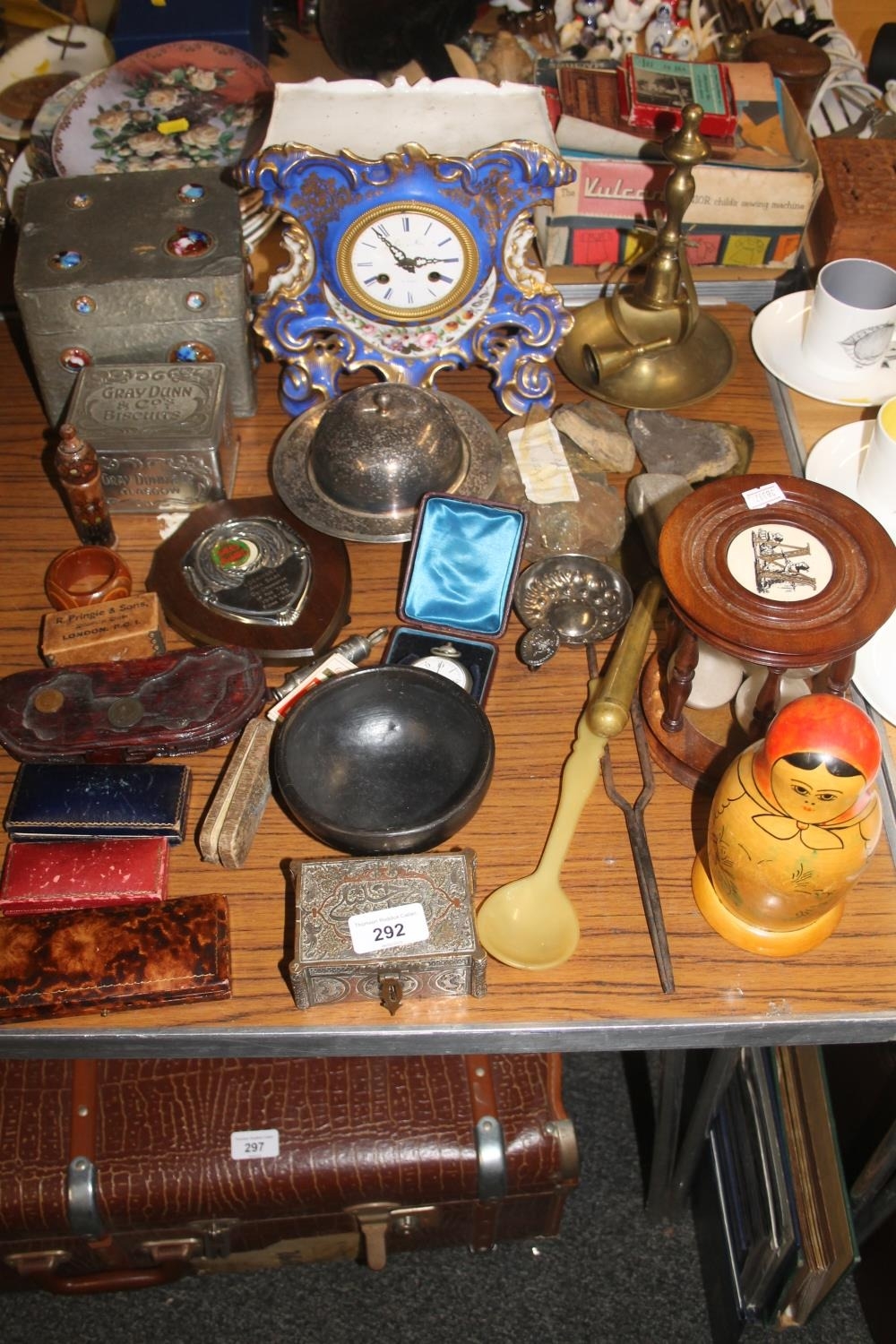 Mixed items to include French Rococo style porcelain mantle clock (chipped), Arts & Crafts style pewter clad no with Ruskin style roundels, triple egg timer, Russian doll, jewellery boxes, etc.