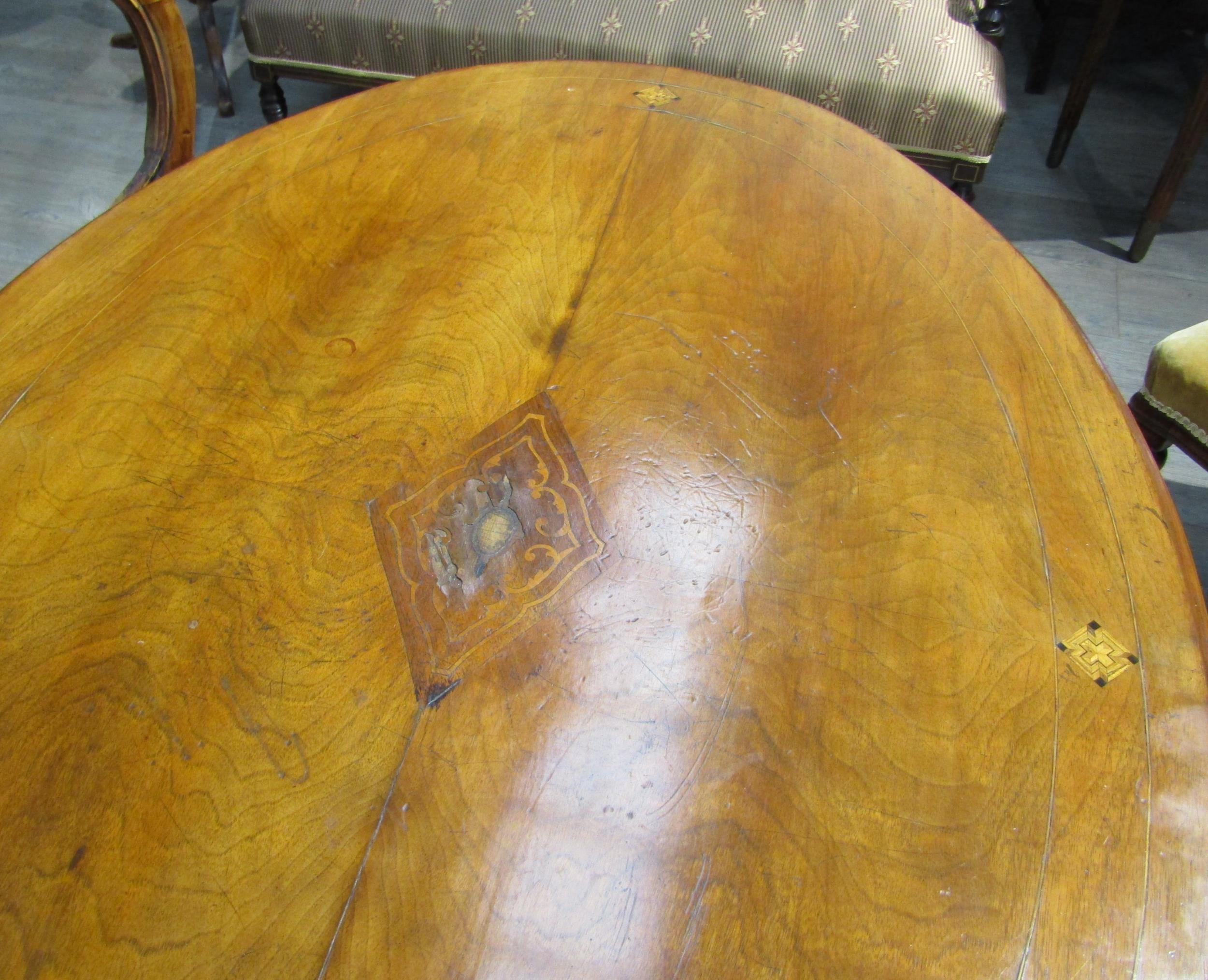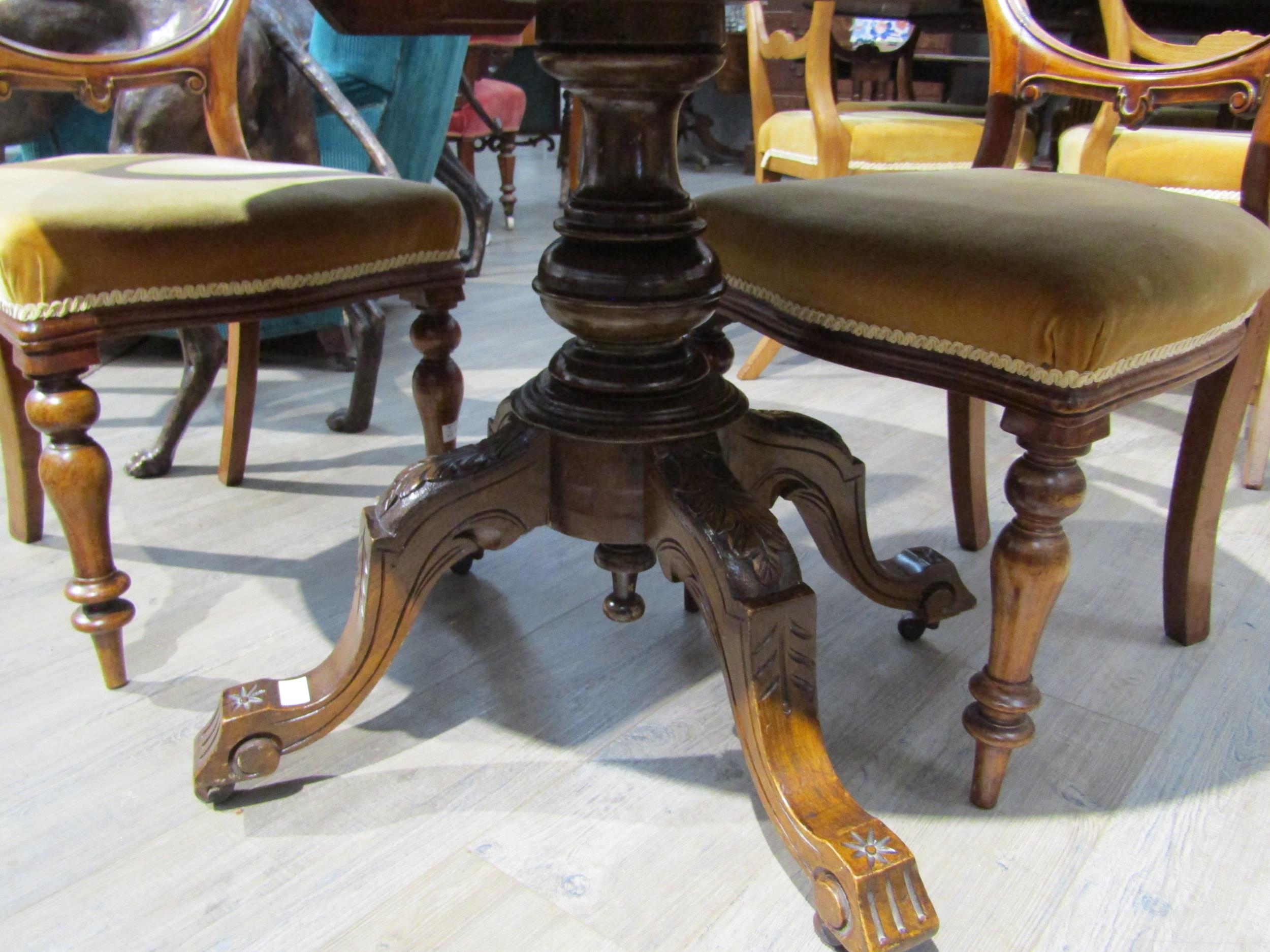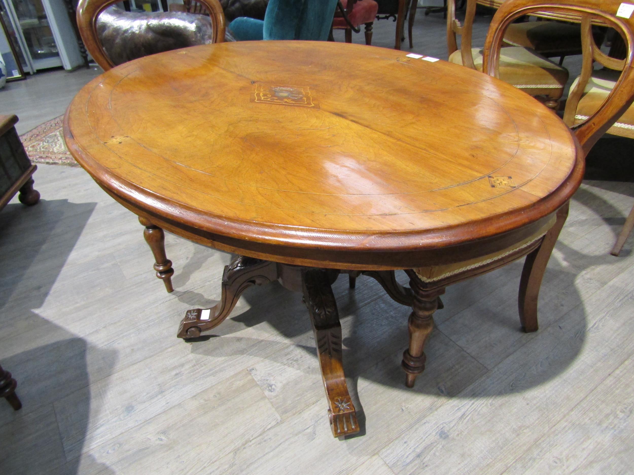 A Victorian walnut centre table with central diamond form lozenge, turned stem to quatraform base. The top measures 86cm x 120cm