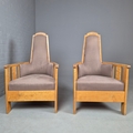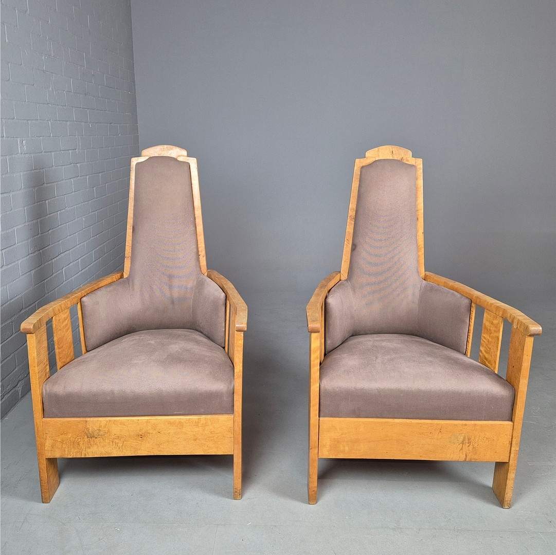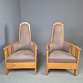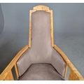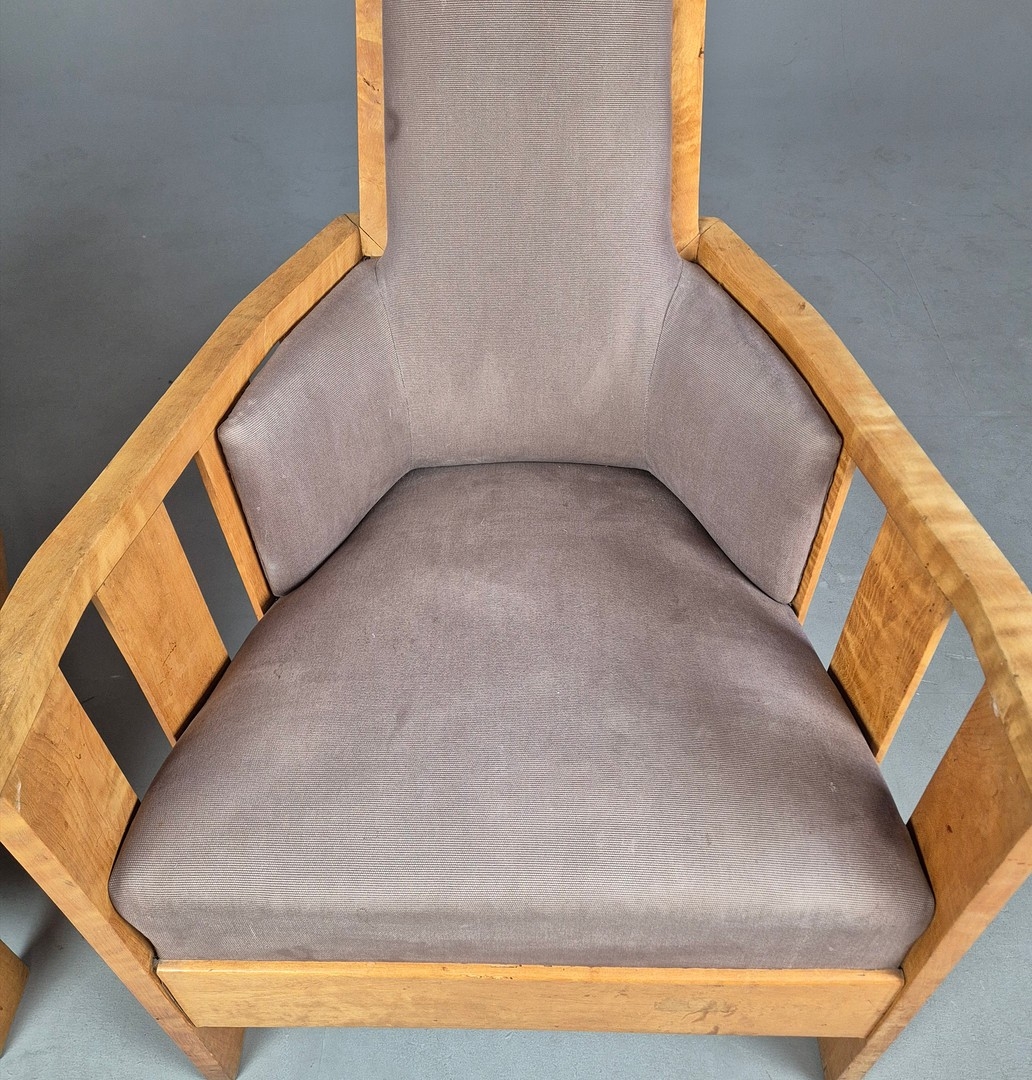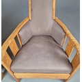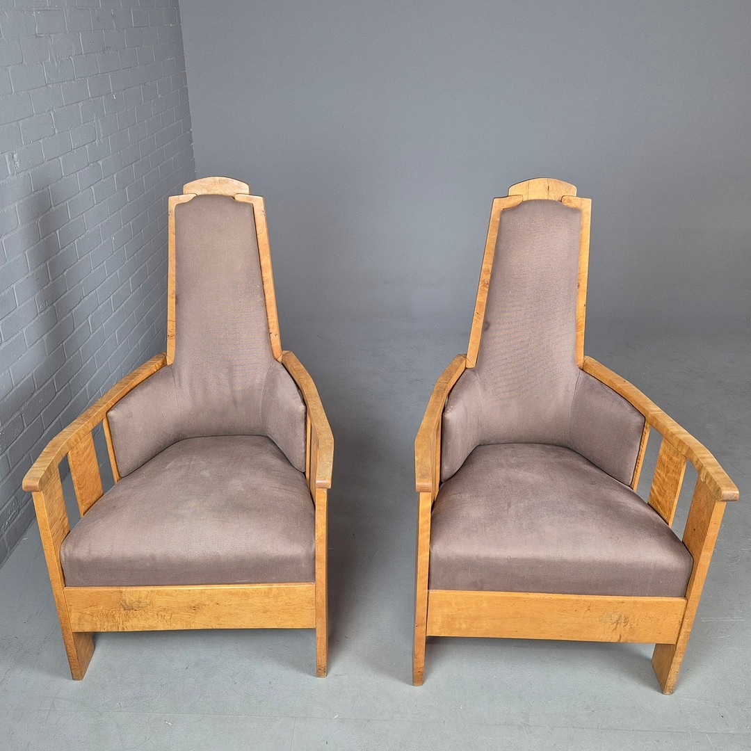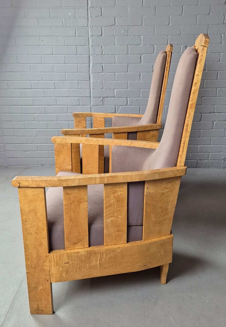 PAIR OF 1920s ART DECO SWEDISH GRACE BIRCH ARMCHAIRS. Of slatted construction with grey upholstered seats and backs 114cm H x 69cm W x 75cm D.