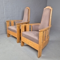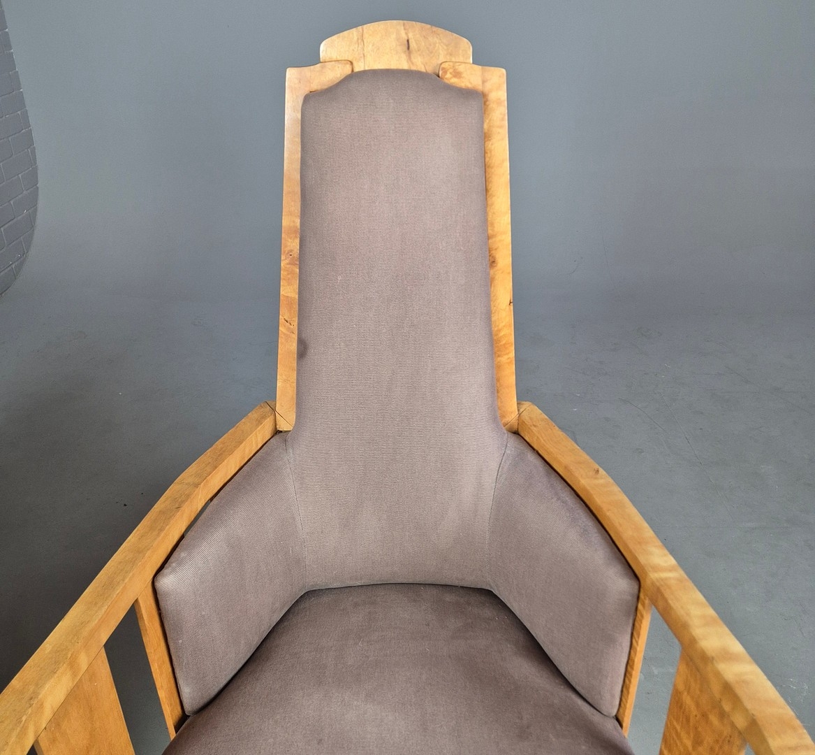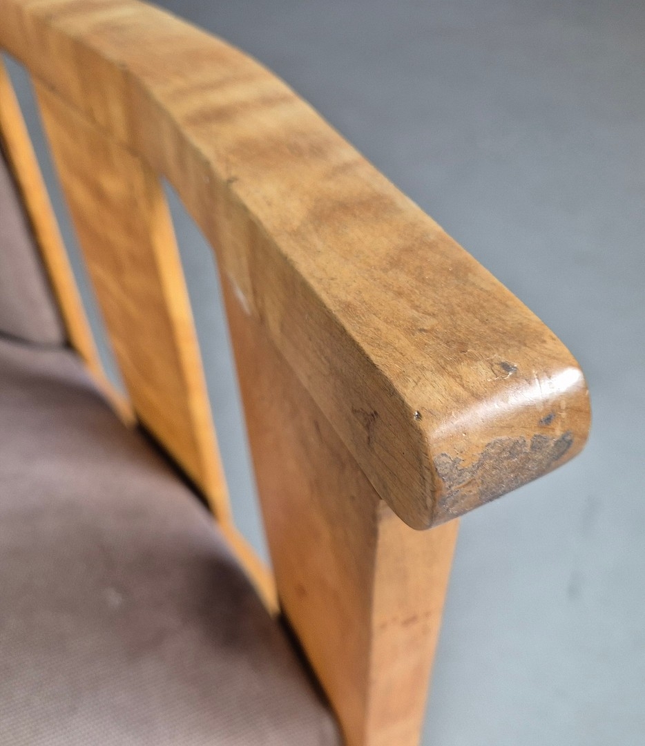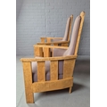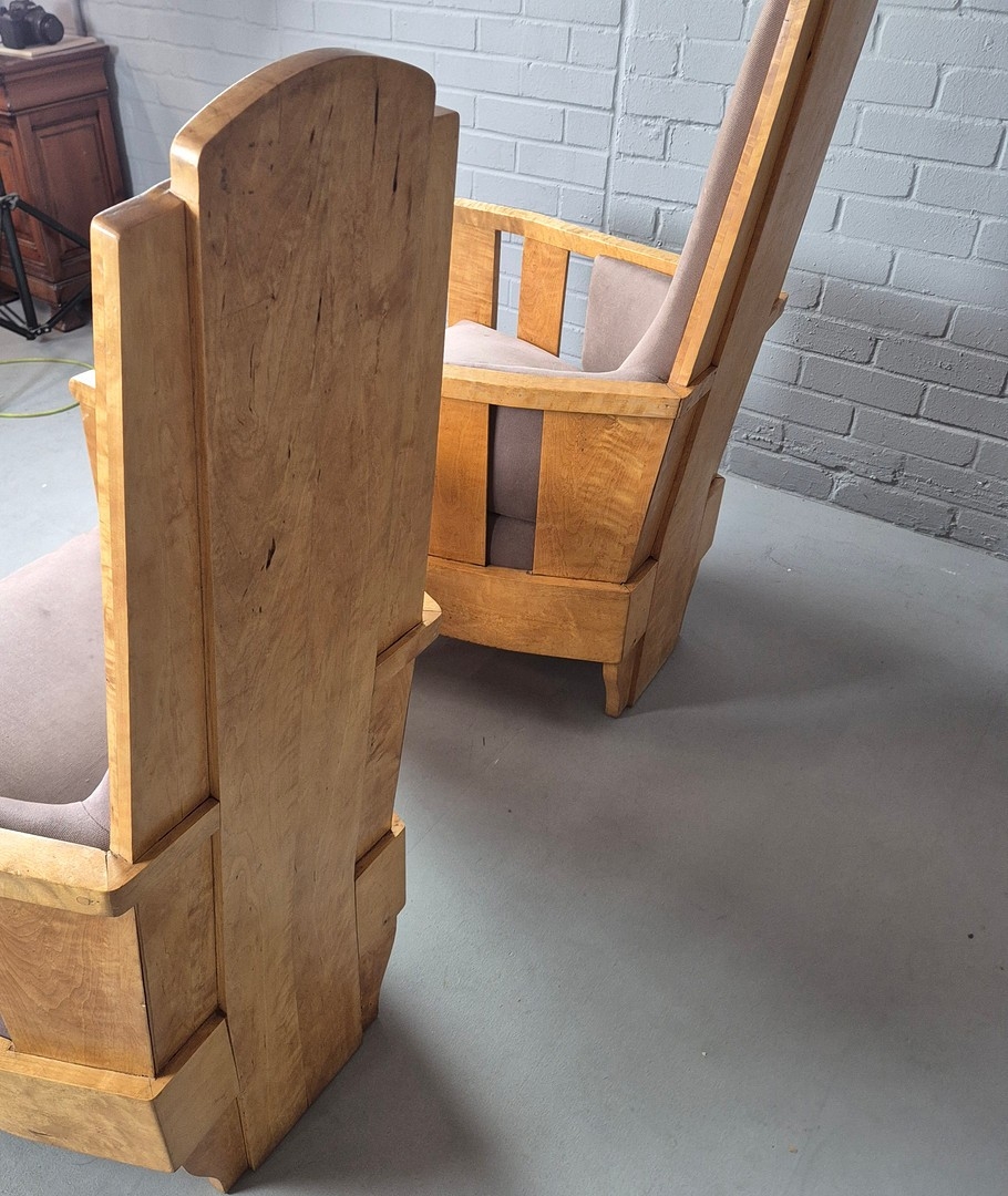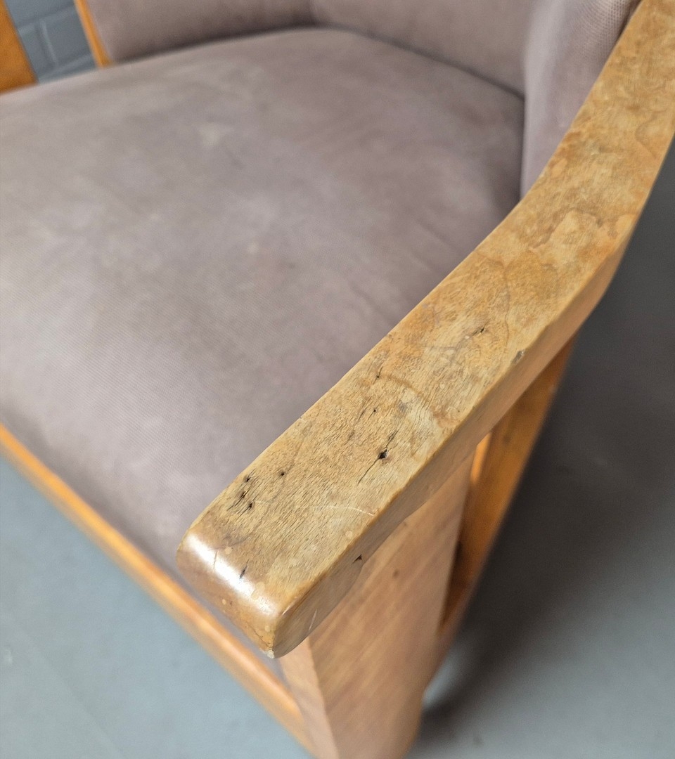 PAIR OF 1920s ART DECO SWEDISH GRACE BIRCH ARMCHAIRS. Of slatted construction with grey upholstered seats and backs 114cm H x 69cm W x 75cm D.